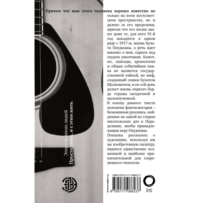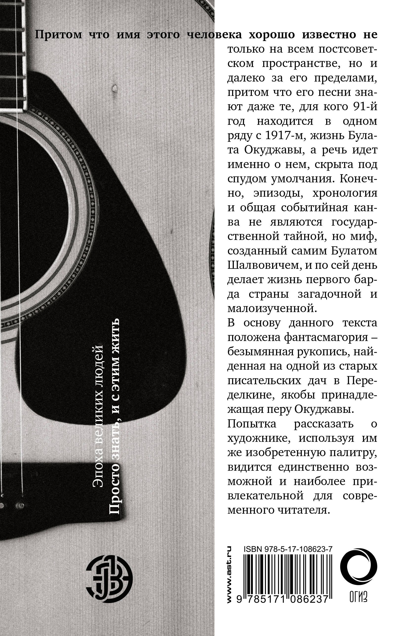 Притом что имя этого человека хорошо известно не только на постсоветском пространстве, но и далеко за его пределами, притом что его песни знают даже те, для кого 91-й год находится на в одном ряду с 1917-м, жизнь Булата Окуджавы, а речь идет именно о нем, спудом умолчания. Конечно, эпизоды, хронология и общая событийная канва не являются государственной тайной, но миф, созданный самим Булатом Шалвовичем, и по сей день делает жизнь первого барда страны загадочной и малоизученной. В основу данного текста положена фантасмагория — безымянная рукопись, найденная на одной из старых писательских дач в Переделкине, якобы принадлежавшая перу Окуджавы. Попытка рассказать о художнике, используя им же изобретенную палитру, видится единственно возможной и наиболее привлекательной для современного читателя.
