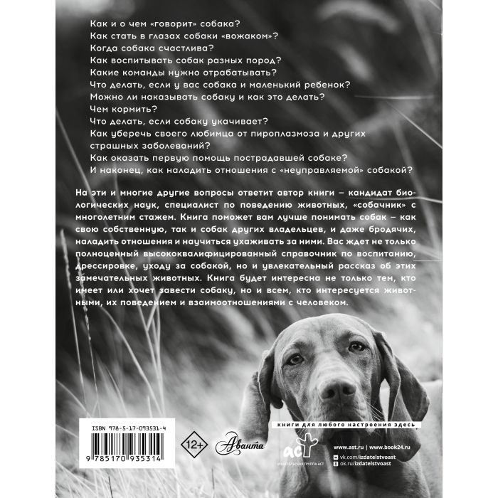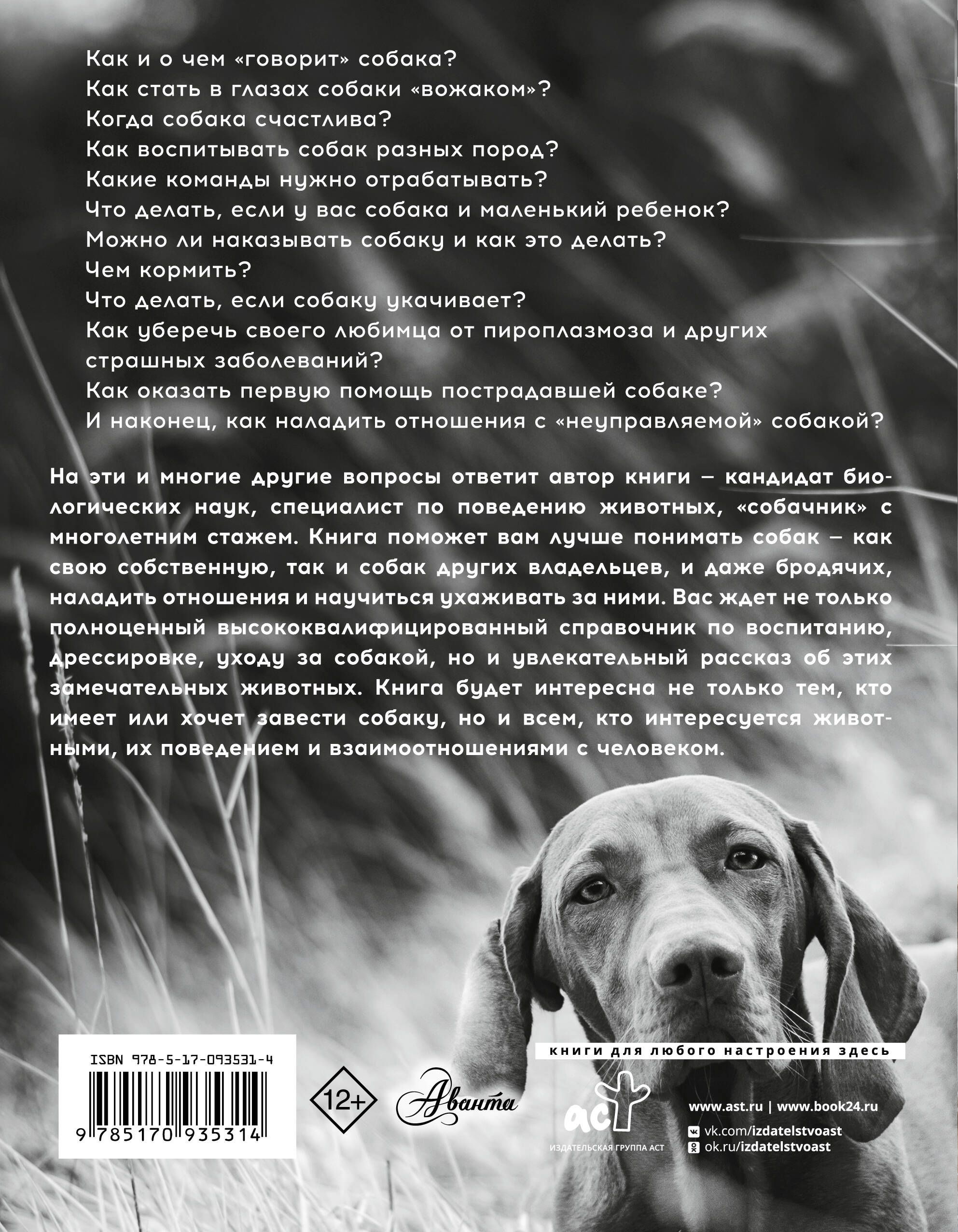 Эта книга поможет читателям лучше понимать собак — как свою собственную, так и собак других владельцев, и даже бродячих, наладить с ними отношения и научиться ухаживать за ними. Автор — кандидат биологических наук, специалист по поведению животных и "собачник" с многолетним стажем — даст квалифицированные советы по воспитанию, дрессировке, уходу за собакой, и просто расскажет много интересного об этих замечательных животных. Книга будет интересна не только тем, кто имеет или хочет завести собаку, но и всем, кто интересуется животными, их поведением и взаимоотношениями с человеком.