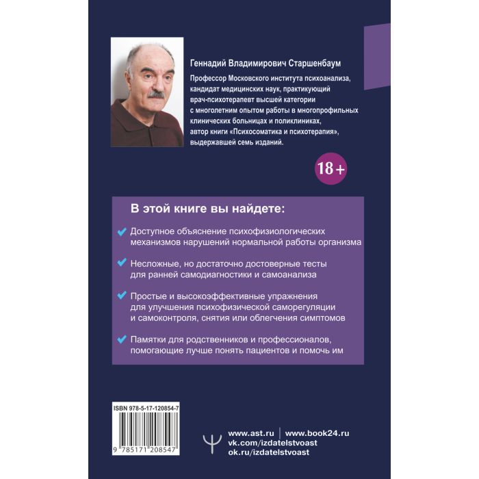 В этой книге описываются признаки и течение психосоматических расстройств, их диагностика и психотерапия. Кроме традиционных психосоматических болезней (гипертонической, коронарной, язвенной, астмы и т. д.) рассматриваются также психогенные нарушения физиологических функций. Приводятся несложные тесты для ранней диагностики, эффективные приемы самопомощи и памятки для родственников больных.