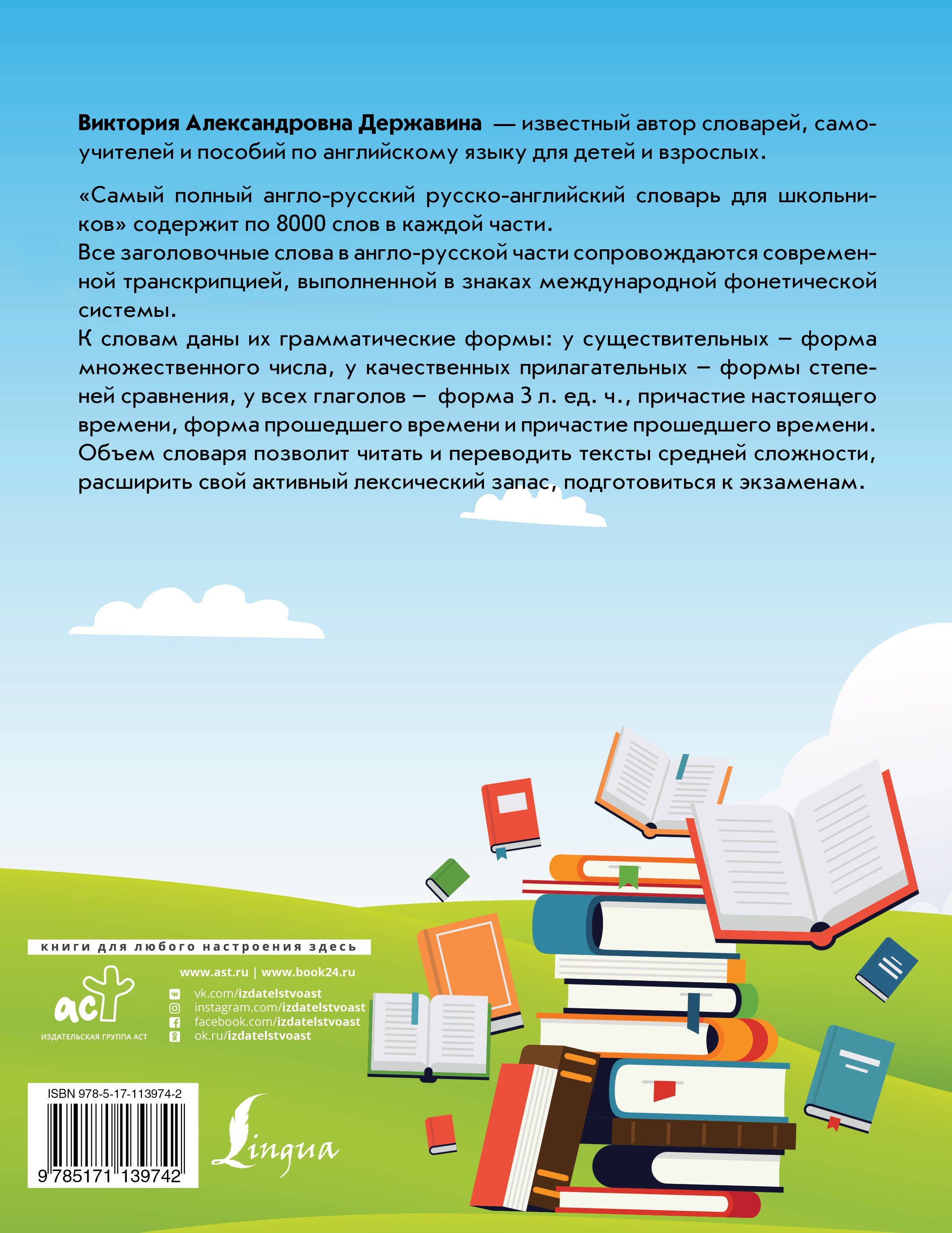 Самый полный англо-русский русско-английский словарь для школьников содержит 16 000 слов и отличается насыщенностью грамматической информацией, такой необходимой в процессе изучения иностранного языка.