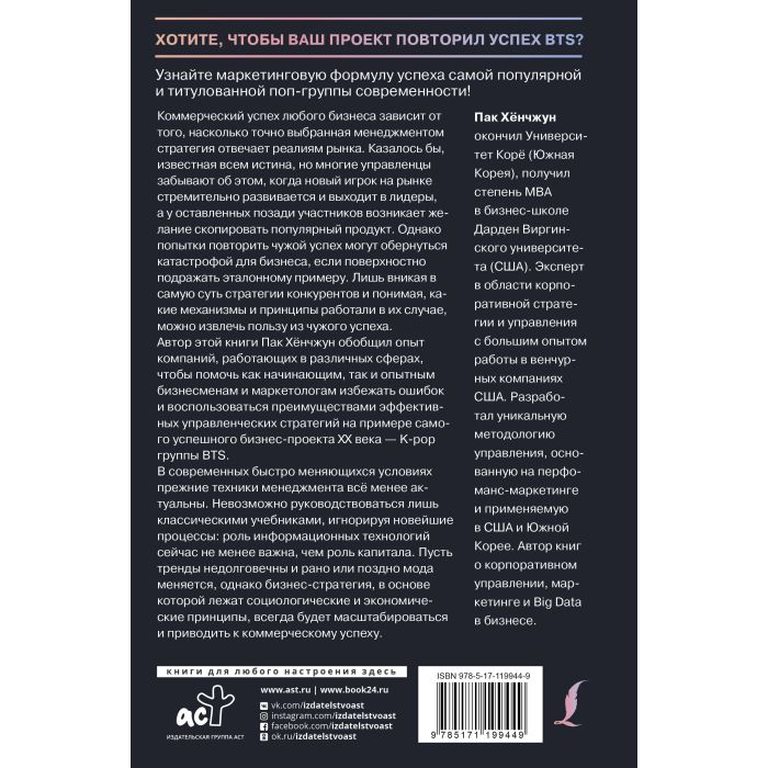 Эта книга поможет как начинающим, так и опытным бизнесменам и маркетологам избежать ошибок и использовать преимущества эффективных управленческих и маркетинговых стратегий на примере самого успешного бизнес-проект XX века — южнокорейской группы BTS.