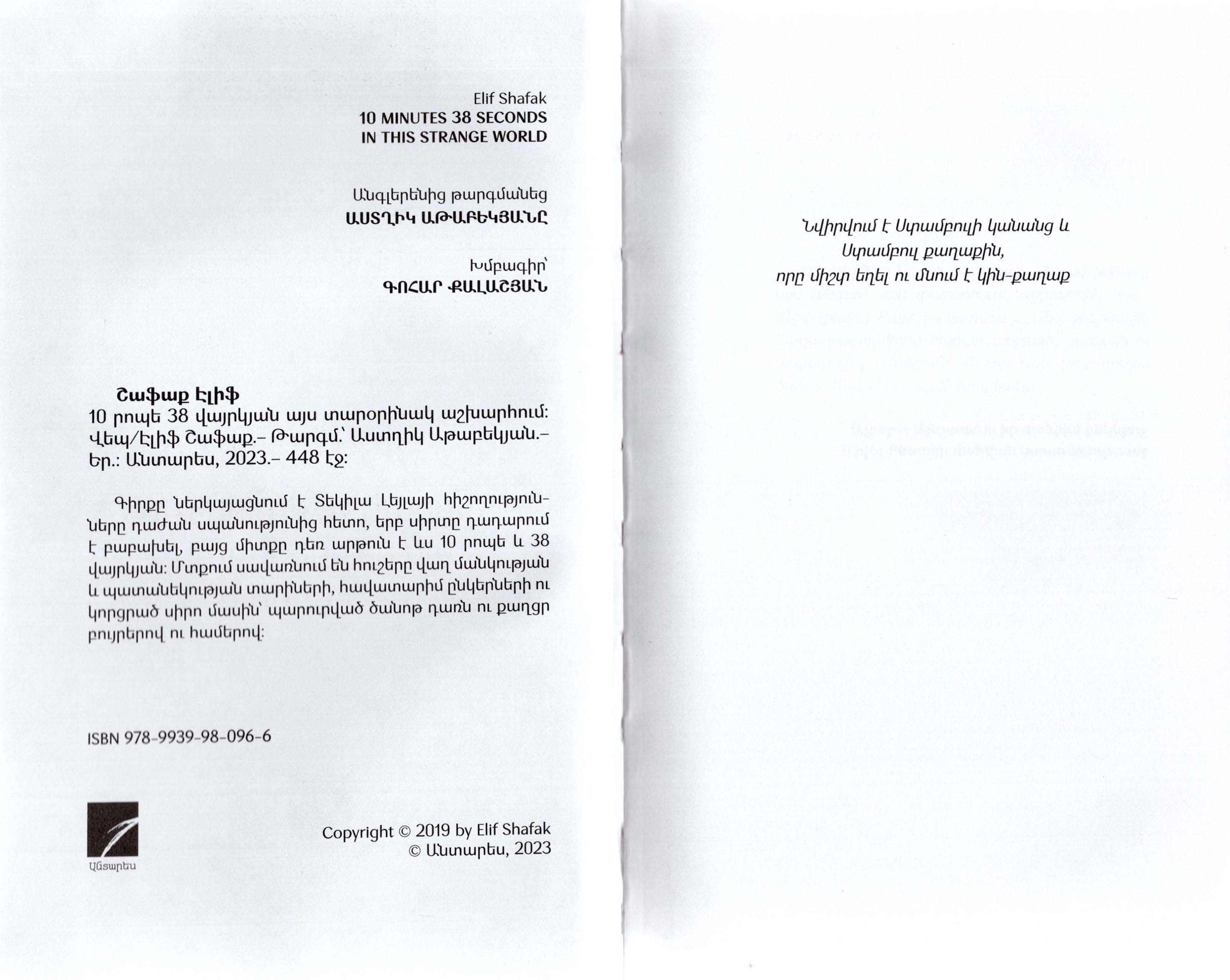 Գիրքը ներկայացնում է Տեկիլա Լեյլայի հիշողությունները դաժան սպանությունից հետո, երբ սիրտը դադարում է բաբախել, բայց միտքը դեռ արթուն է ևս 10 րոպե և 38 վայրկյան: Մտքում սավառնում են հուշերը վաղ մանկության և պատանեկության տարիների, հավատարիմ ընկերների ու կորցրած սիրո մասին՝ պարուրված ծանոթ դառն ու քաղցր բույրերով ու համերով: