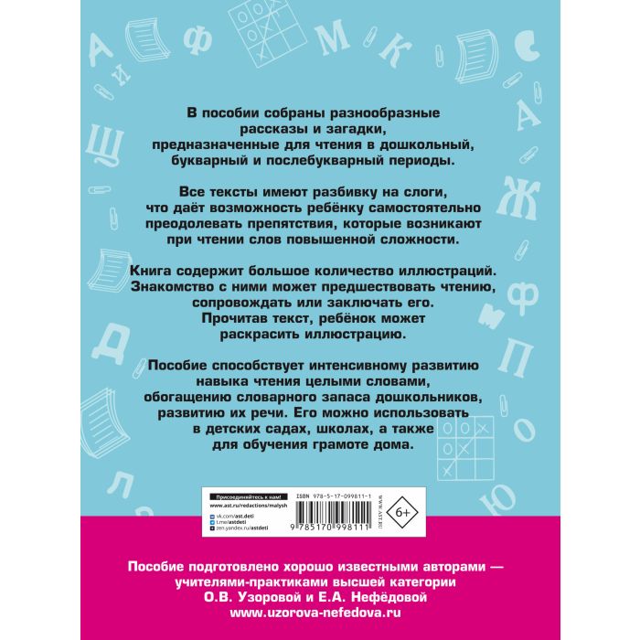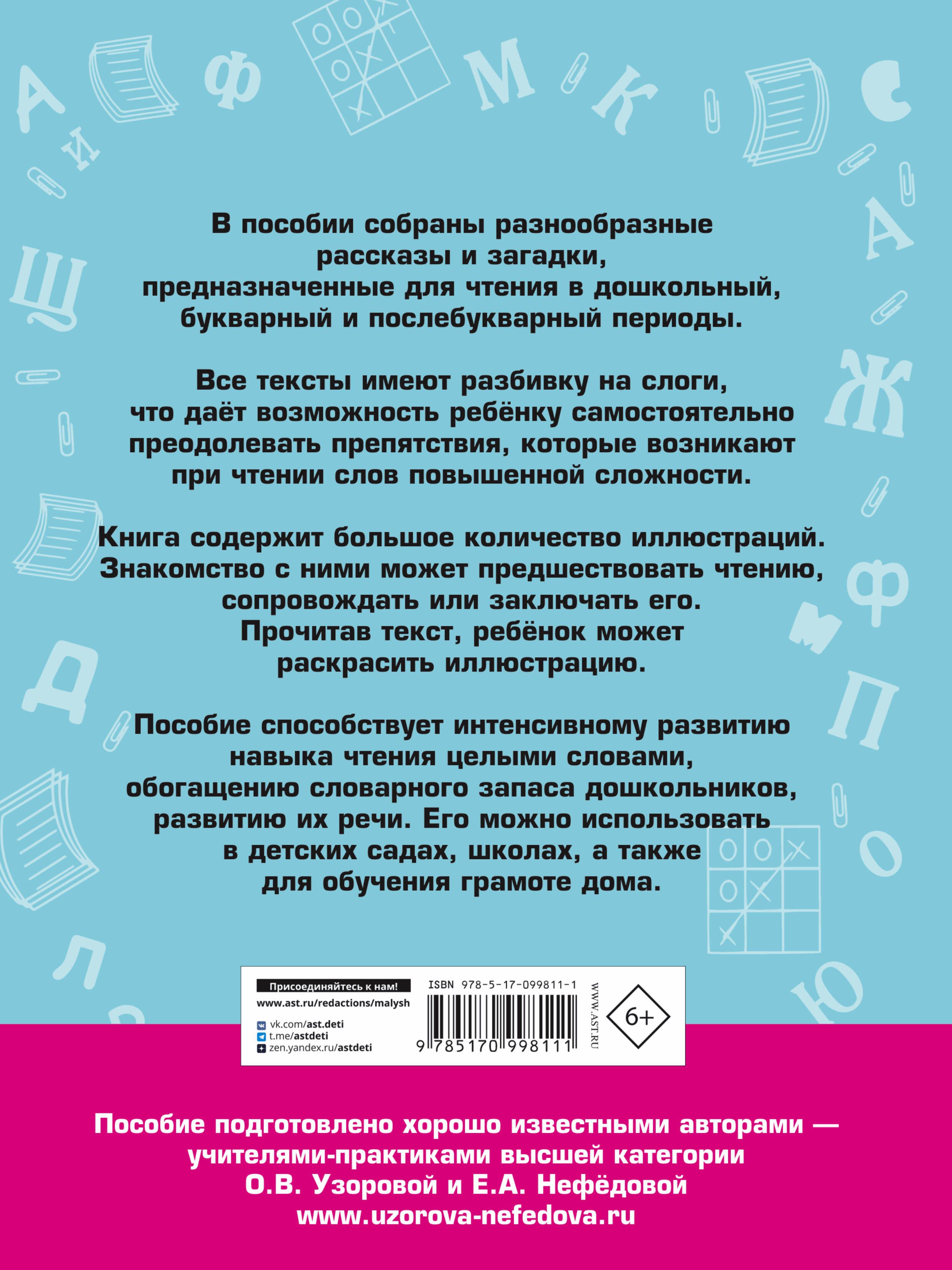 В пособии собраны рассказы и загадки, предназначенные для чтения в дошкольный, букварный и послебукварный период. Слова имеют разбивку на слоги, что позволяет ребенку самостоятельно преодолевать затруднения, которые возникают при чтении слов повышенной сложности. Книга содержит большое количество иллюстраций, предназначенных для раскраски.