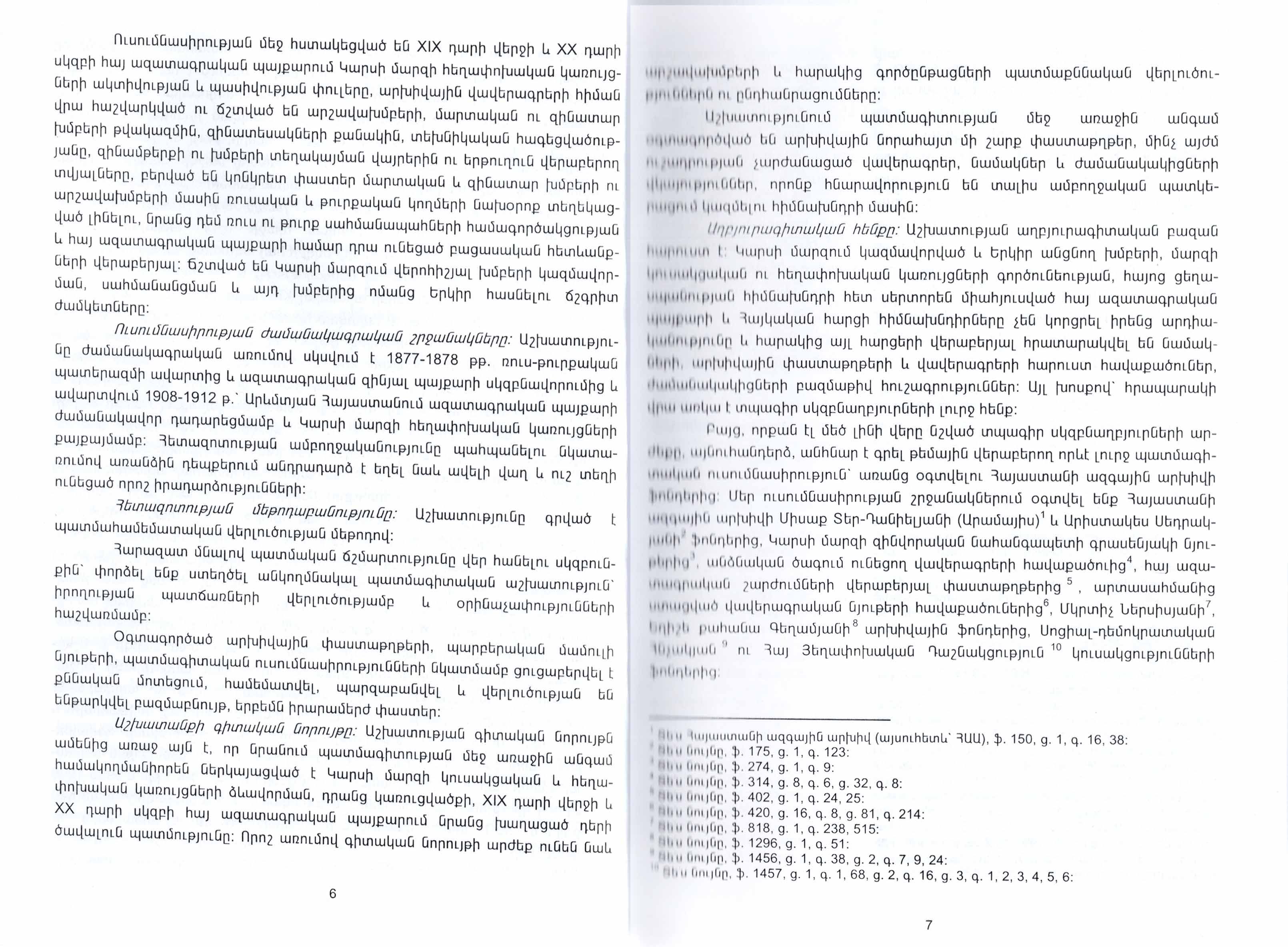 Աշխատությունում արխիվային ու տպագիր վավերագրերի, հուշագրությունների, ժամանակի պարբերական մամուլից և հրապարակի վրա առկա տարաբնույթ ուսումնասիրություններից քաղած փաստական հարուստ նյութի հիման վրա վերլուծվում և գիտականորեն լուսաբանվում է Կարսի մարզի հեղափոխական կառույցների (անհատների, հայ ազգային կազմակերպությունների և կուսակցությունների կոմիտեների և մասնաճյուղերի)1878-1912 թթ. ծավալած գործունեությունը արևմտահայ ազատագրական պայքարին օժանդակելու ուղղությամբ: Այդ գործունեությունն իրենից ներկայացնում էր ինչպես զենքի ու զինամթերքի հայթայթումն ու դրանք զինատար խմբերի միջոցով Արևմտյան Հայաստան փոխադրելը, այնպես էլ մարտական խմբերի և արշավախմբերի կազմավորումն ու նրանց միջոցով երկրում սկսված շարժումներին նոր թափ հաղորդելը: Այս գործունեությունը հանդիպում էր ռուսական և թուրքական իշխանությունների սուր դիմադրությանը, որի պատճառով խիստ նվազում էր արևմտահայ ազատագրական պայքարին օժանդակելու ուղղությամբ ծավալած հսկայական աշխատանքի արդյունավետությունը: Մենագրությունը նախատեսված է ԲՈՒՀ-երի մասնագիտական ֆակուլտետներում դասավանդող պատմաբանների, ինչպես նաև XIX դարի վերջի և XX դարի սկզբի հայ ազգային ազատագրական պայքարի պատմությամբ հետաքրքրվող լայն շրջանների համար: