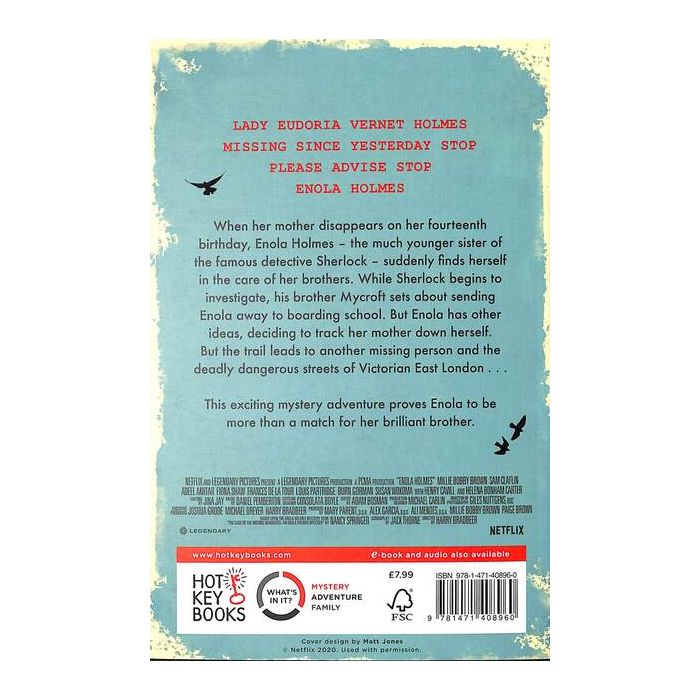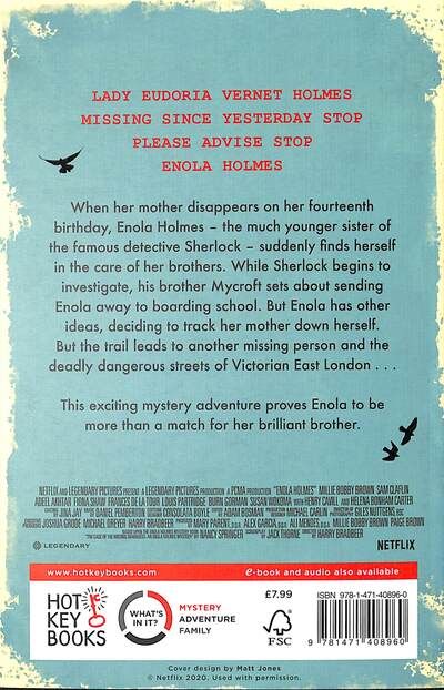 Introducing London's newest and greatest detective: Enola Holmes - the book that inspired the film, starring Millie Bobby Brown. Read the series before the next film lands! When Enola Holmes, sister to the detective Sherlock Holmes, discovers her mother has disappeared, she quickly embarks on a journey to London in search of her. But nothing can prepare her for what awaits. Because when she arrives, she finds herself involved in the kidnapping of a young marquess, fleeing murderous villains, and trying to elude her shrewd older brothers - all while attempting to piece together clues to her mother's strange disappearance. Amid all the mayhem, will Enola be able to decode the necessary clues and find her mother? 'A story of a young girl who is empowered, capable, and smart . . . the Enola Holmes book series conveys an impactful message to kids and teenagers all over the world that you can do anything if you set your mind to it, and it does so in an exciting and adventurous way.' - Millie Bobby Brown