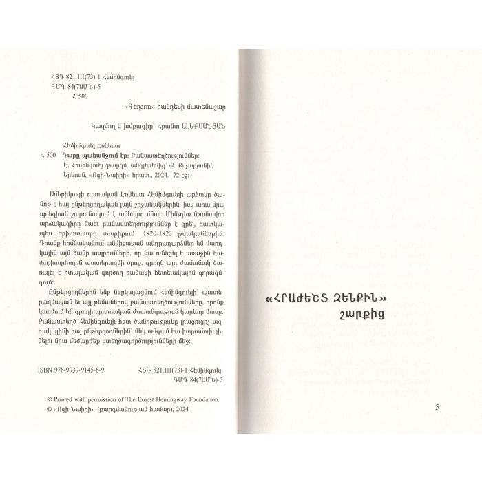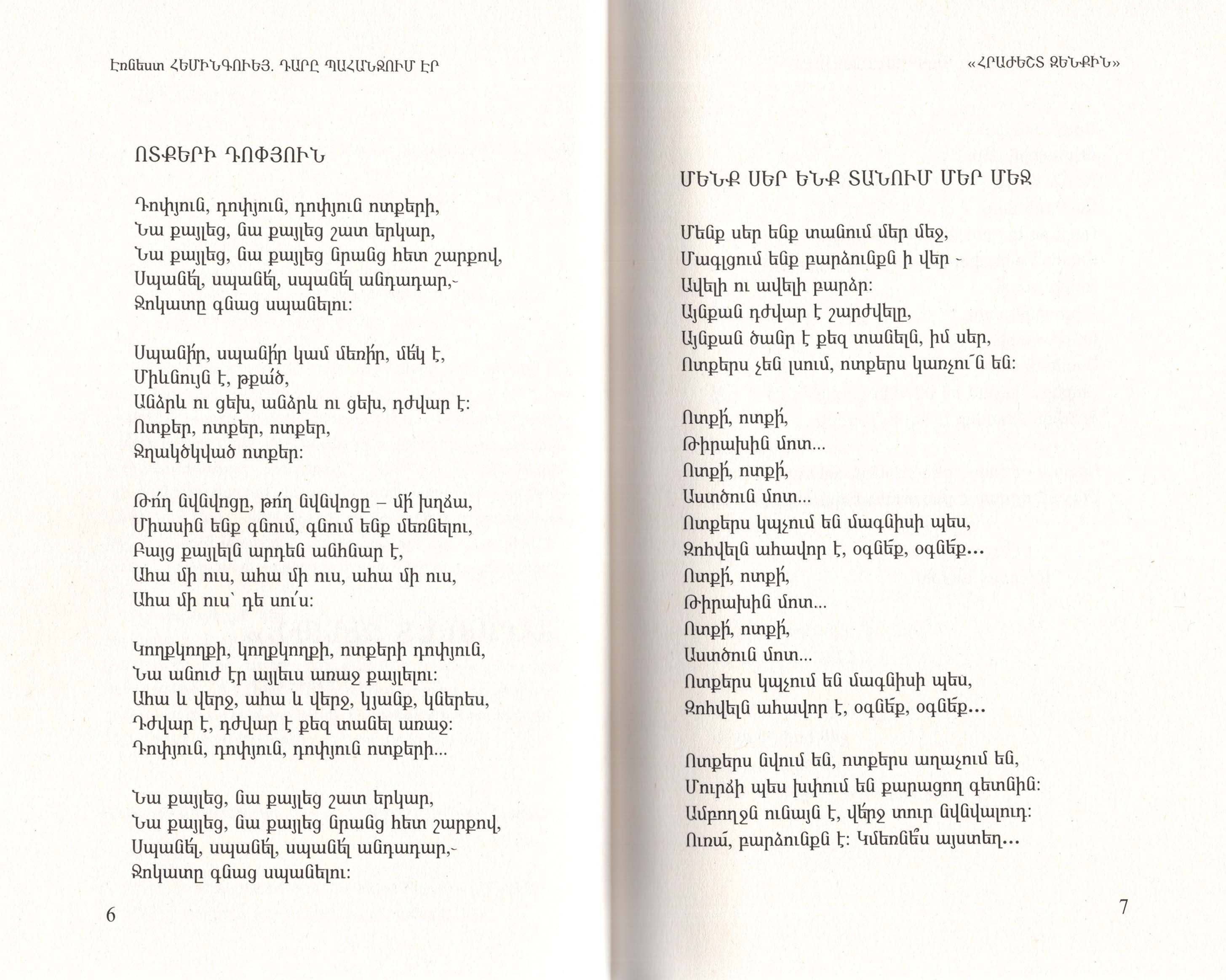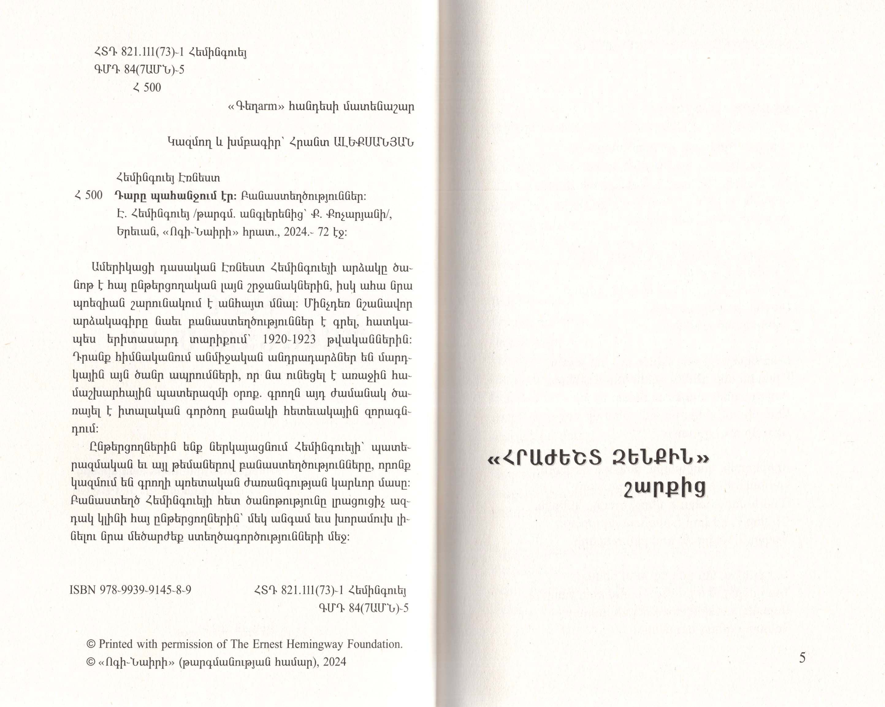Ընթերցողներին ենք ներկայացնում Հեմինգուեյի՝ պատերազմական և այլ թեմաներով բանաստեղծությունները, որոնք կազմում են գրողի պոետական ժառանգության կարևոր մասը: Բանաստեղծ Հեմինգուեյի հետ ծանոթությունը լրացուցիչ ազդակ կլինի հայ ընթերցողներին՝ մեկ անգամ ևս խորամուխ լինելու նրա մեծարժեք ստեղծագործությունների մեջ: