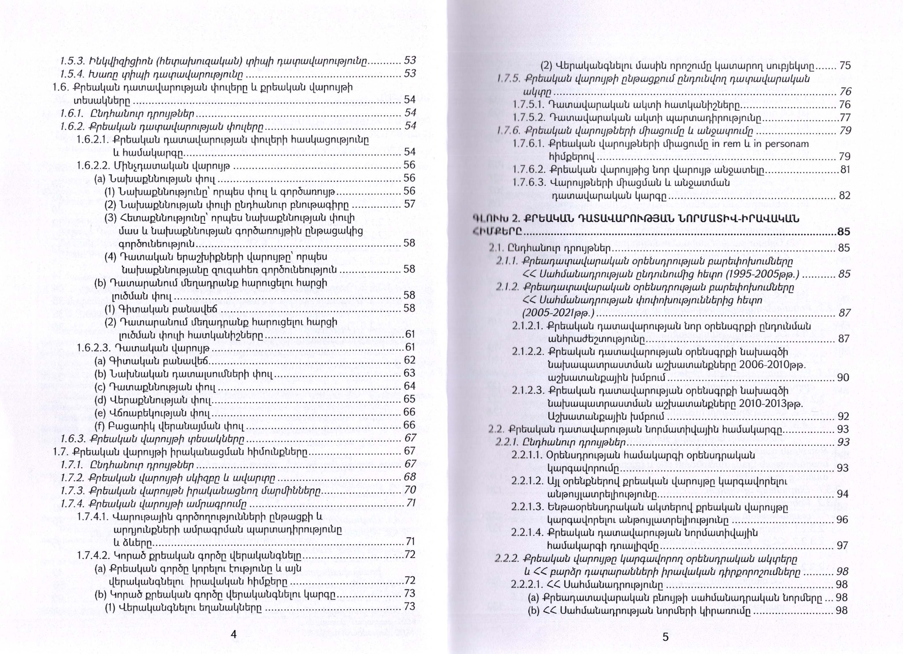 Ձեռնարկում հատուկ ուշադրություն է դարձվել քրեական վարույթի էքսպլիցիտ և իմպլիցիտ սկզբունքներին, դրանցից անմիջապես բխող նորմերին և վարույթի սկզբունքներից կատարված բացառություններին: