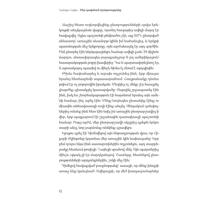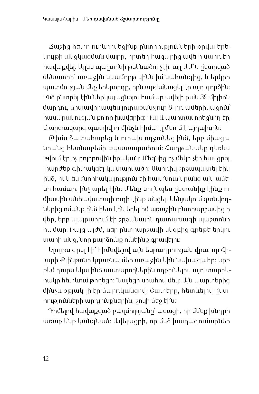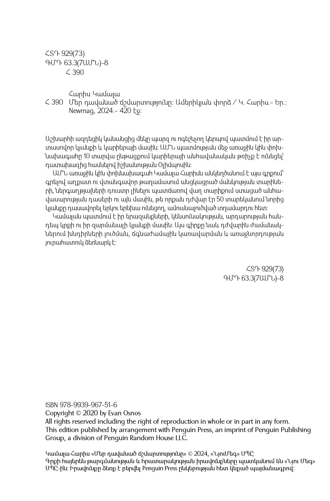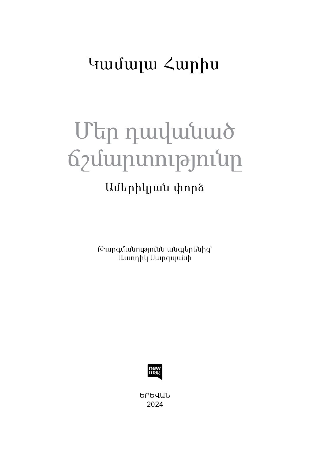 Աշխարհի ազդեցիկ կանանցից մեկը պարզ ու ոգեշնչող կերպով պատմում է իր արտասովոր կյանքի և կարիերայի մասին։ ԱՄՆ պատմության մեջ առաջին կին փոխնախագահը 10 տարվա ընթացքում կարիերայի անհավանական թռիչք է ունեցել՝ դատախազից հասնելով իշխանության Օլիմպոսին: Այդ ճանապարհին Հարիսը երբեք չի վախեցել կոտրել կարծրատիպեր և չի ընկրկել դժվարությունների առաջ: Այս կնոջ գործունեության շնորհիվ ԱՄՆ-ում պակասել են հանցագործությունները: Տնտեսական ճգնաժամից հետո Հարիսը հազարավոր ընտանիքների օգնել է պահպանել իրենց տները: Նա պայքարել է կորպորացիաների և բանկերի չարաշահումների դեմ և նրանցից գանձել բազմամիլիարդ տուգանքներ:ԱՄՆ առաջին կին փոխնախագահ Կամալա Հարիսն անկեղծանում է այս գրքում՝ գրելով աղքատ ու վտանգավոր թաղամասում անցկացրած մանկության տարիների, ներգաղթյալների դուստր լինելու պատճառով վաղ տարիքում ստացած անհավասարության դասերի ու այն մասին, թե որքան դժվար էր 50 տարեկանում նորից կյանքը դասավորել երկու երեխա ունեցող, ամուսնալուծված տղամարդու հետ:Կամալան պատմում է իր երազանքների, կենսունակության, արդարության հանդեպ կրքի ու իր զարմանալի կյանքի մասին: Այս գիրքը նաև դժվարին ժամանակներում խնդիրների լուծման, ճգնաժամային կառավարման և առաջնորդության յուրահատուկ ձեռնարկ է: