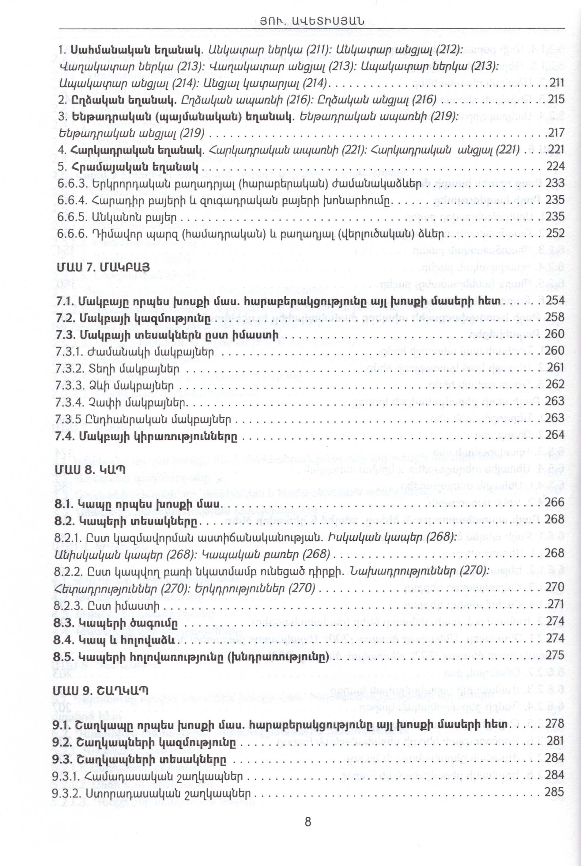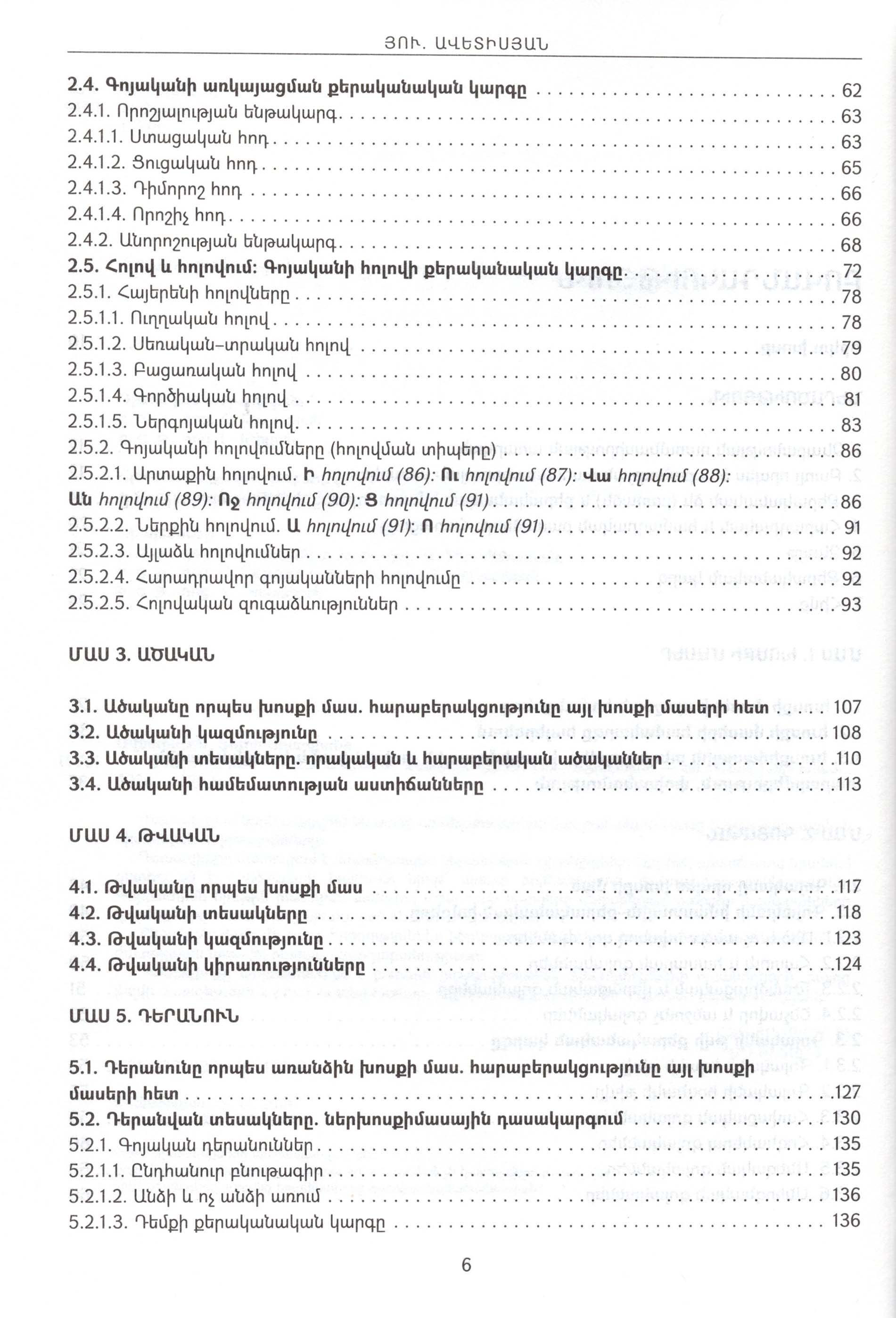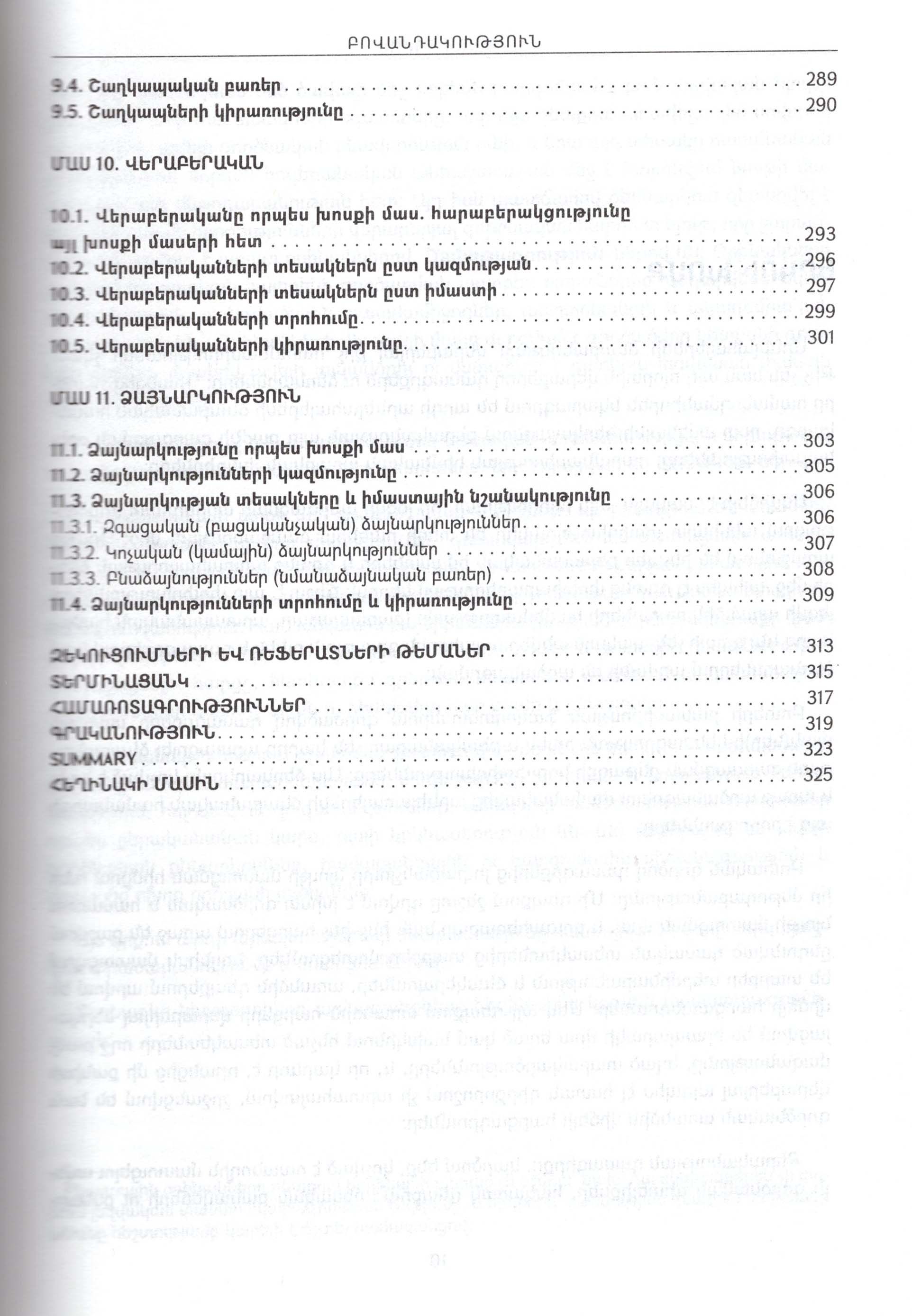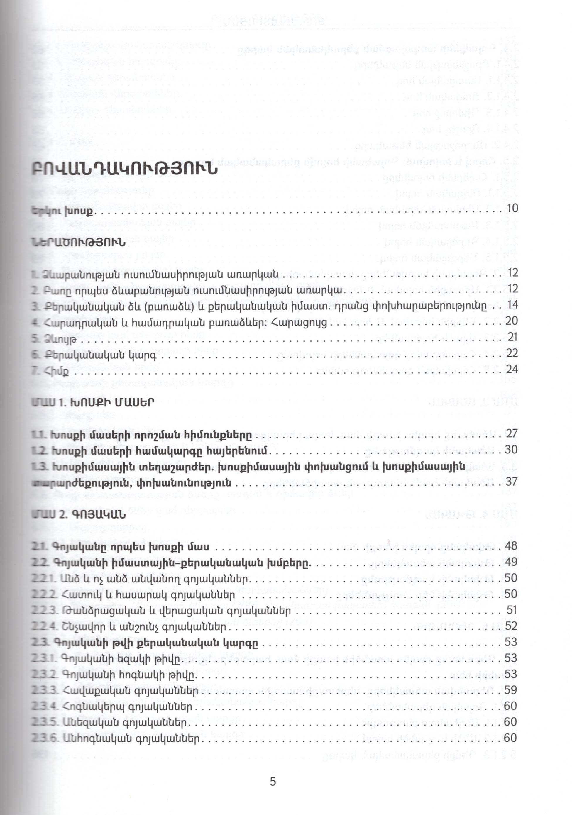 Դասագրքում ներկայացվում են արդի արևելահայերենի ձևաբանական նորմը և դրա զարգացման հիմնական ուղղությունները: Դասագիրքը մատուցում է առավելապես կիրառական գիտելիքներ: Այդ իսկ պատճառով նրանում զետեղված է գործնական հարուստ նյութ՝ առատ օրինակներով, ծանոթագրություններով են: Գործնական նյութին խստորեն առնչվող տեսական հարցերի վերաբերյալ տարբեր լեզվաբանների կարծիքները համառոտ շարադրված են ՏԵՍԱԿԵՏ-ներով: Քերականական մի շարք իրողություններ ներկայացվում են նոր մոտեցումով, դասակարգման ու մատուցման առավել հստակ մեթոդաբանությամբ: Դասագիրքը նախատեսված է բուհերի բանասիրության ֆակուլտետների ուսանողների, հայոց լեզվի ուսուցիչների և բոլոր նրանց համար, ովքեր հետաքրքրվում են հայերենի քերականությամբ:
