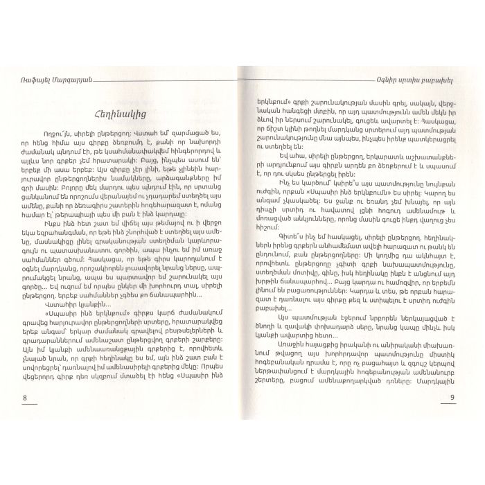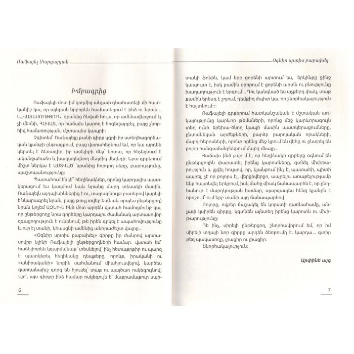 «Օգնիր սրտիս բաբախել» գիրքը միստիկ տարրերով համեմված հոգեբանական վեպ է, որտեղ պատմվում է Ֆրանսիայում ապրող Ռևերդիների ընտանեկան դրամատիկ պատմությունը: Այստեղ հատվում է իրականության և անիրականի նուրբ սահմանը, սակայն այդ հատումը տեղի է ունենում արտասովոր կերպով: Այստեղ անիրականը ինչ-որ տեղ իրականությունն է, իսկ իրականությունը սկիզբ է առնում անիրականից... Այս պատմության էջերում նրբորեն ներկայացված է ծնողի և զավակի փոխադարձ սերը, նրանց կապը մինչև իսկ կյանքի ավարտից հետո...Պատմության էպիկենտրոնը մարդու հոգին է և այն, թե այդ հոգու ներսում որքան սեր ու հոգատարություն կարող է ապրել հարազատի հանդեպ: