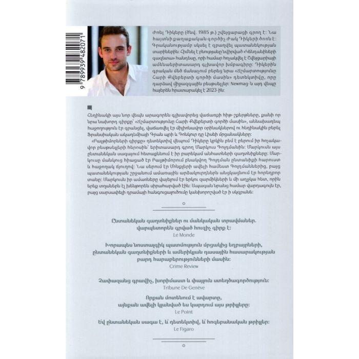 Շվեյցարացի երիտասարդ հեղինակ Ժոել Դիկերի այս նոր վեպն արագորեն գլխավորեց վաճառքի հիթ-շքերթները, քանի որ նրա նախորդ գիրքը՝ «Ճշմարտությունը Հարի Քվեբերտի գործի մասին», աննախադեպ հաջողություն էր գրանցել, վաճառվել էր միլիոնավոր օրինակներով ու հեղինակին բերել Ֆրանսիական ակադեմիայի Գրան պրի և Գոնկուր դը Լիսեի մրցանակները։«Բալթիմորների գիրքը» դետեկտիվ վեպում Դիկերը կրկին բեմ է բերում իր հռչակավոր բեսթսելլերի հերոսին՝ երիտասարդ գրող Մարկուս Գոլդմանին։ Մարկուսն այս ընտանեկան սագայում հետաքննում է իր բարեկամ անհատների գաղտնիքները։ Մարկուսը մանկուց հիացած էր Բալթիմորում բնակվող Գոլդման ընտանիքի հարուստ և հաջողակ ճյուղով։ Նա սերում էր Մոնքլերի ավելի համեստ Գոլդմաններից, բայց պատանեկության շրջանում ամառային արձակուրդներն անցկացնում էր հորեղբոր տանը։ Մարկուսն իր ամառները վայելում էր երկու զարմիկների և մի աղջկա հետ, որին երեք տղաներն էլ խենթորեն սիրահարված էին։ Ապագան նրանց համար վարդագույն էր, բայց սարսափելի դրամայի հանգուցալուծումը կանխորոշված էր ի սկզբանե։
