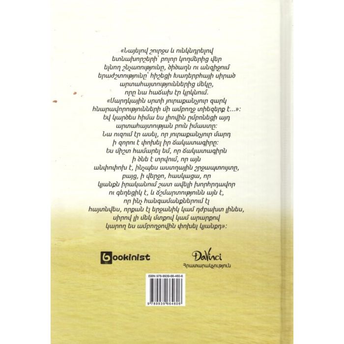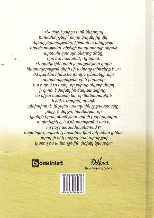 կյանքն իրականում շատ ավելի խորհրդավոր ու գեղեցիկ է, եւ Ճշմարտությունն այն է, որ ինչ հանգամանքներում էլ հայտնվես, որքան էլ երջանիկ կամ դժբախտ լինես, սիրով լի մեկ մտքով կամ արարքով կարող ես ամբողջովին փոխել կյանքդ»: