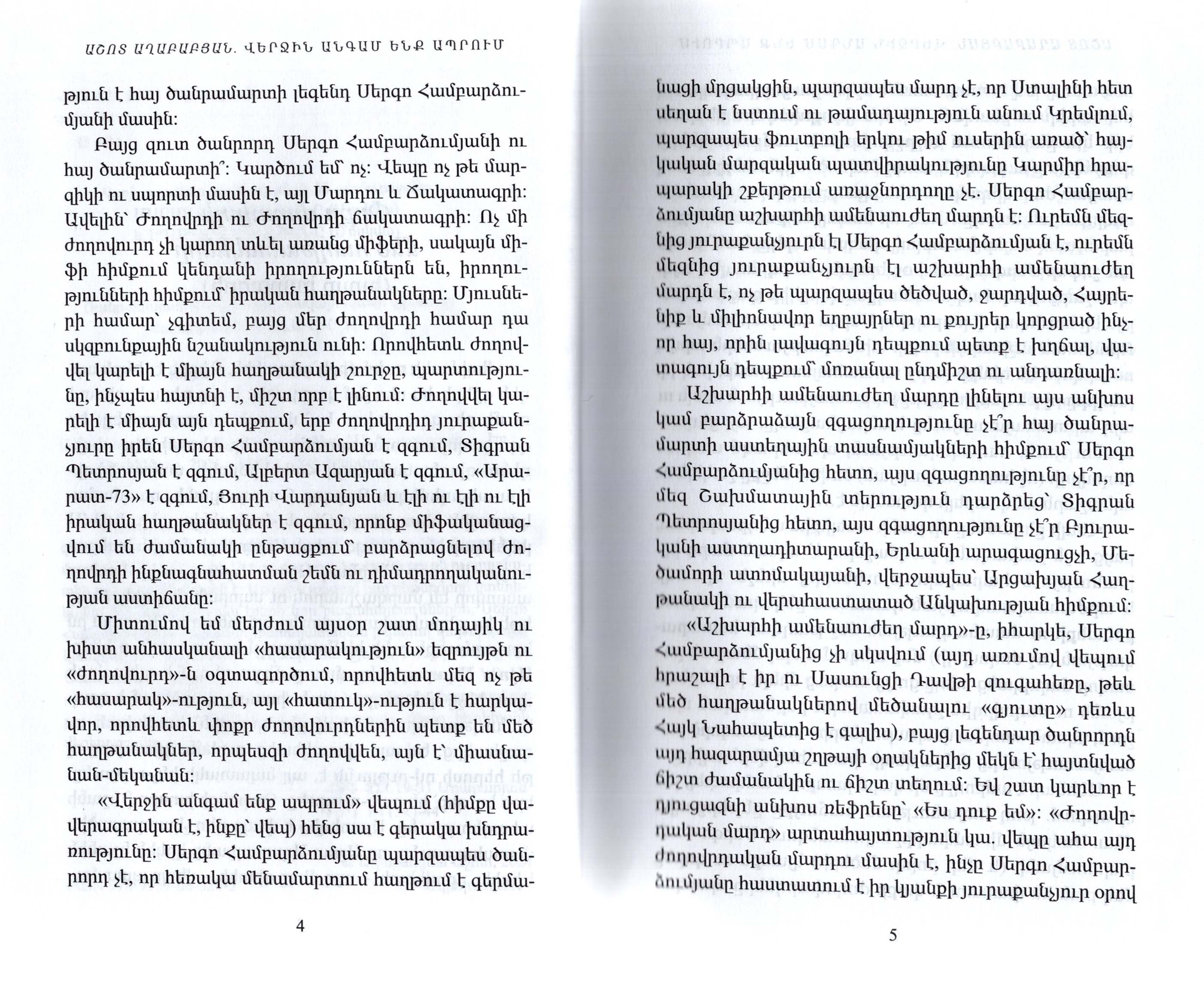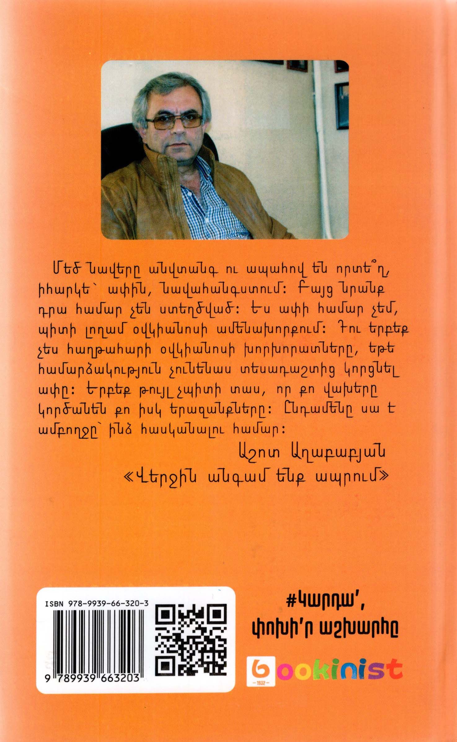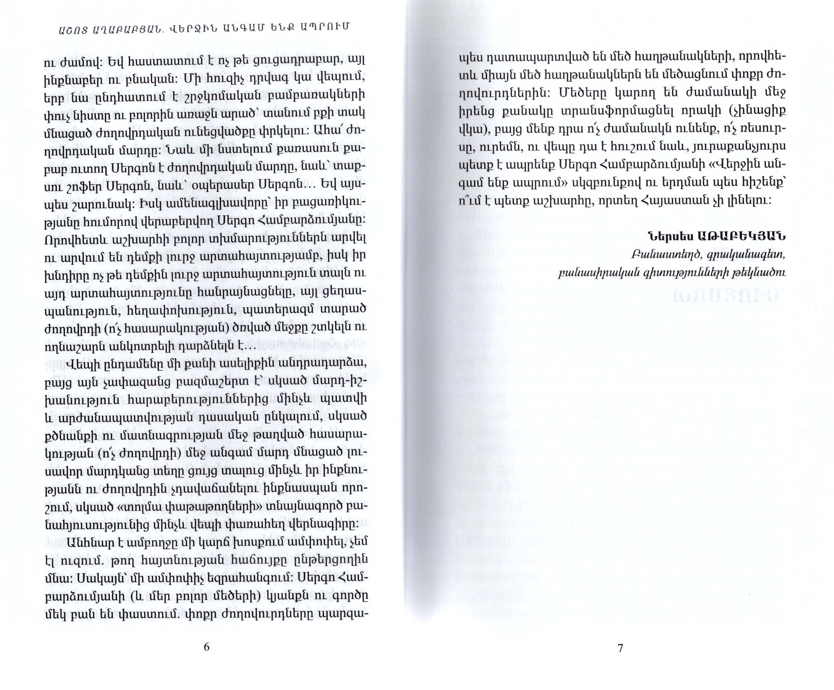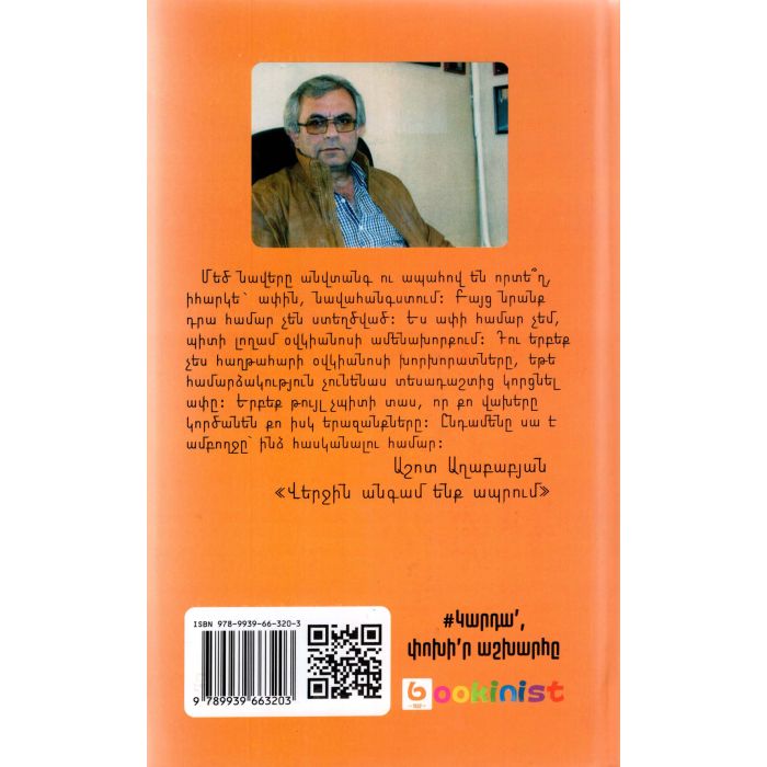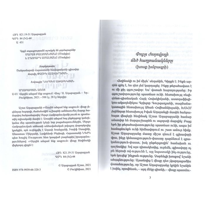 Աշոտ Աղաբաբյանի «Վերջին անգամ ենք ապրում» վեպը լեգենդար հայորդի, ժամանակին աշխարհի ամենաուժեղ մարդը համարվող ծանրամարտիկ Սերգո Համբարձումյանի բուռն ու դրամատիկ ոդիսականի մասին է։ Առաջին անգամ հայ ընթերցողը կտեղեկանա մեր պատմության էջերի նոր բացահայտումներին, Սերգո Համբարձումյան անհատի անհավանական թվացող փոթորկալից կյանքին, որն ուղեկցվել է Աղասի Խանջյանի, Իոսիֆ Ստալինի, Անաստաս Միկոյանի, Լավրենտի Բերիայի, Հայաստանի ՆԳԺԿ  պետ Խաչիկ Մուղդուսու հետ կապված բազմաթիվ իրադարձություններով։ «Վերջին անգամ ենք ապրում» վեպը հեղինակի վեցերորդ գիրքն է։