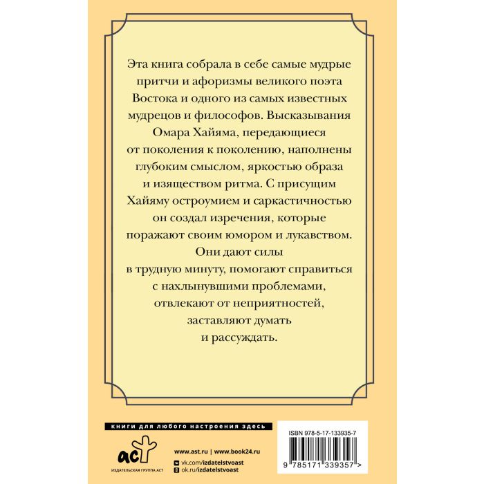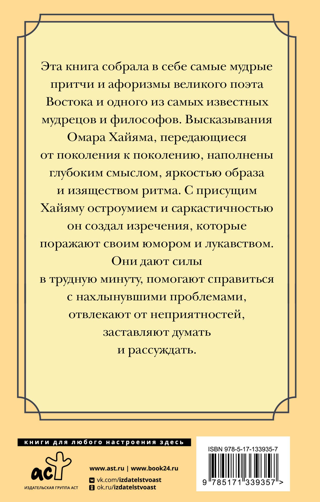 Эта книга собрала в себе самые мудрые притчи и афоризмы великого поэта Востока и одного из самых известных мудрецов и философов. Высказывания Омара Хайяма, передающиеся от поколения к поколению, наполнены глубоким смыслом, яркостью образа и изяществом ритма. С присущим Хайяму остроумием и саркастичностью он создал изречения, которые поражают своим юмором и лукавством. Они дают силы в трудную минуту, помогают справиться с нахлынувшими проблемами, отвлекают от неприятностей, заставляют думать и рассуждать.
