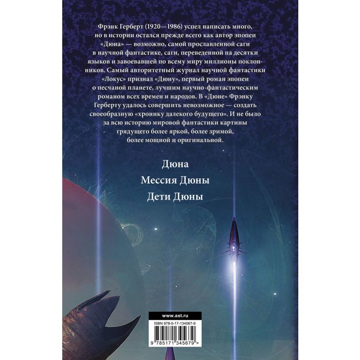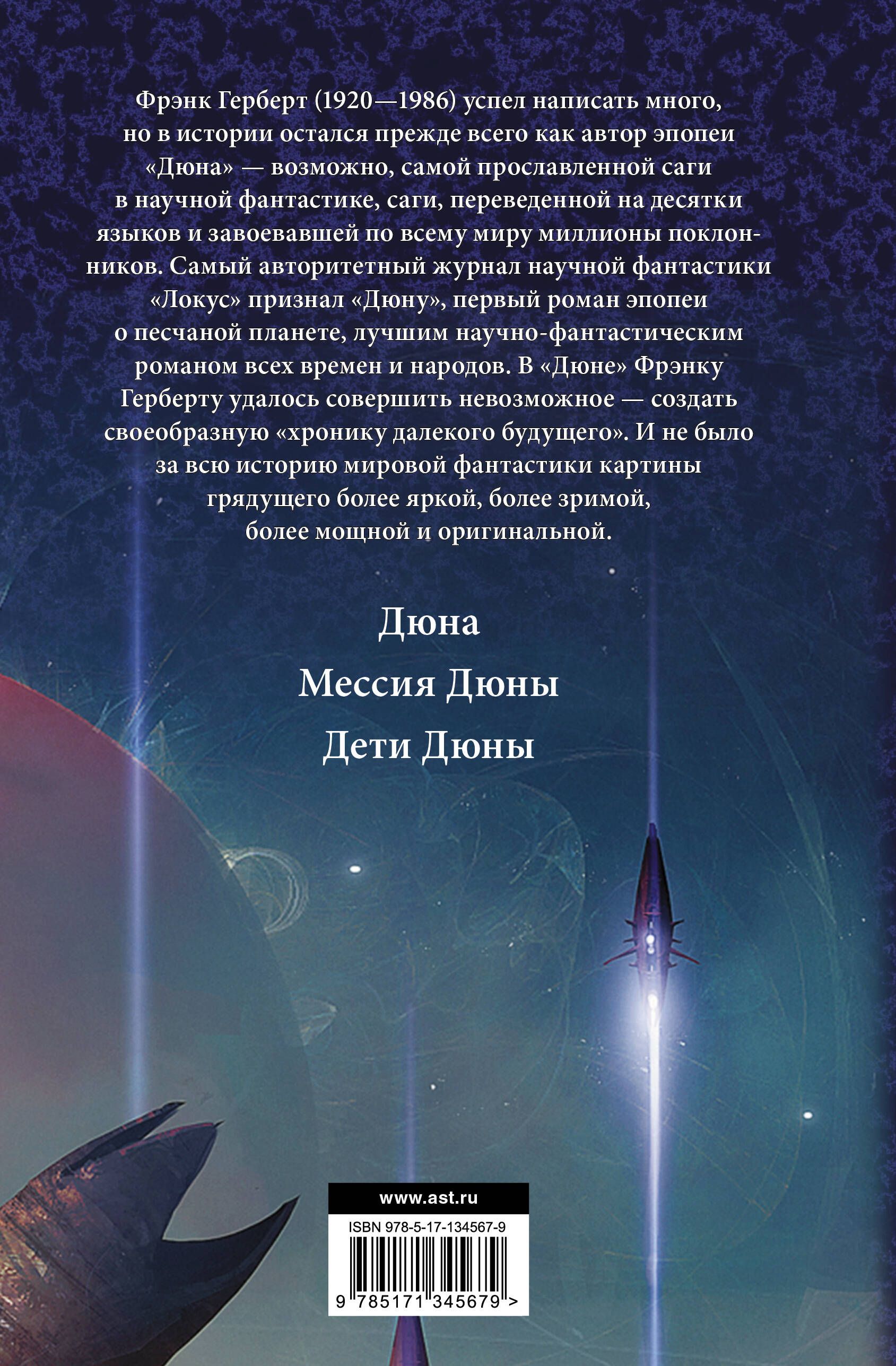 Фрэнк Герберт (1920—1986) успел написать много, но в истории остался прежде всего как автор эпопеи "Дюна" – возможно, самой прославленной саги в научной фантастике, саги, переведенной на десятки языков и завоевавшей по всему миру миллионы поклонников. Самый авторитетный журнал научной фантастики "Локус" признал "Дюну", первый роман эпопеи о песчаной планете, лучшим научно-фантастическим романом всех времен и народов. В "Дюне" Фрэнку Герберту удалось совершить невозможное — создать своеобразную "хронику далекого будущего". И не было за всю историю мировой фантастики картины грядущего более яркой, более зримой, более мощной и оригинальной. В сборник включены первые три романа из знаменитого цикла Фрэнка Герберта: "Дюна", "Мессия Дюны" и "Дети Дюны".