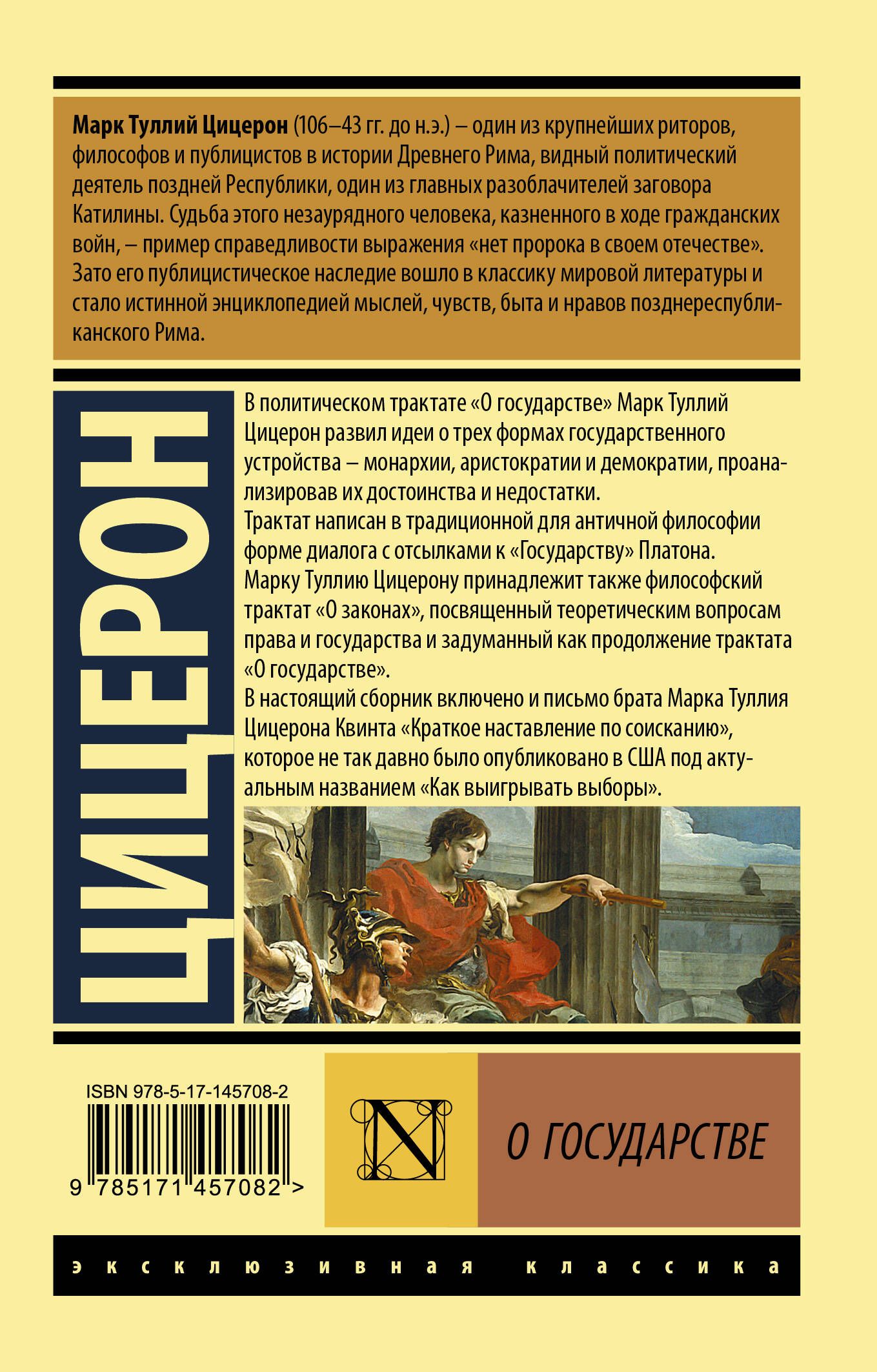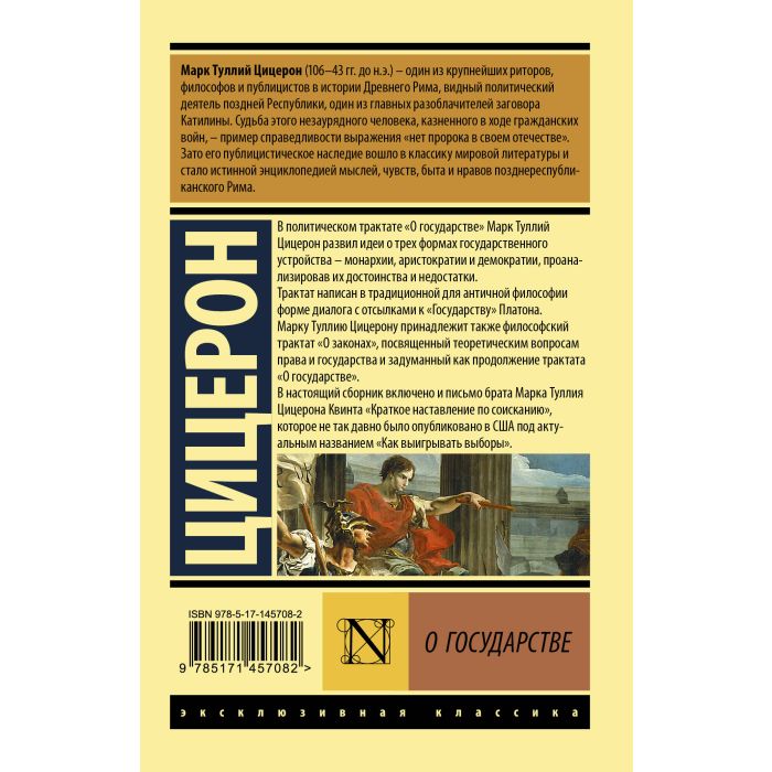 В политическом трактате "О государстве" Марк Туллий Цицерон развил идеи о трех формах государственного устройства - монархии, аристократии и демократии, проанализировав их достоинства и недостатки. Трактат написан в традиционной для античной философии форме диалога с отсылками к "Государству" Платона. Марку Туллию Цицерону принадлежит также философский трактат "О законах", посвященный теоретическим вопросам права и государства и задуманный как продолжение трактата "О государстве". В настоящий сборник включено и письмо брата Марка Туллия Цицерона Квинта "Краткое наставление по соисканию", которое не так давно было опубликовано в США под актуальным названием "Как выигрывать выборы".