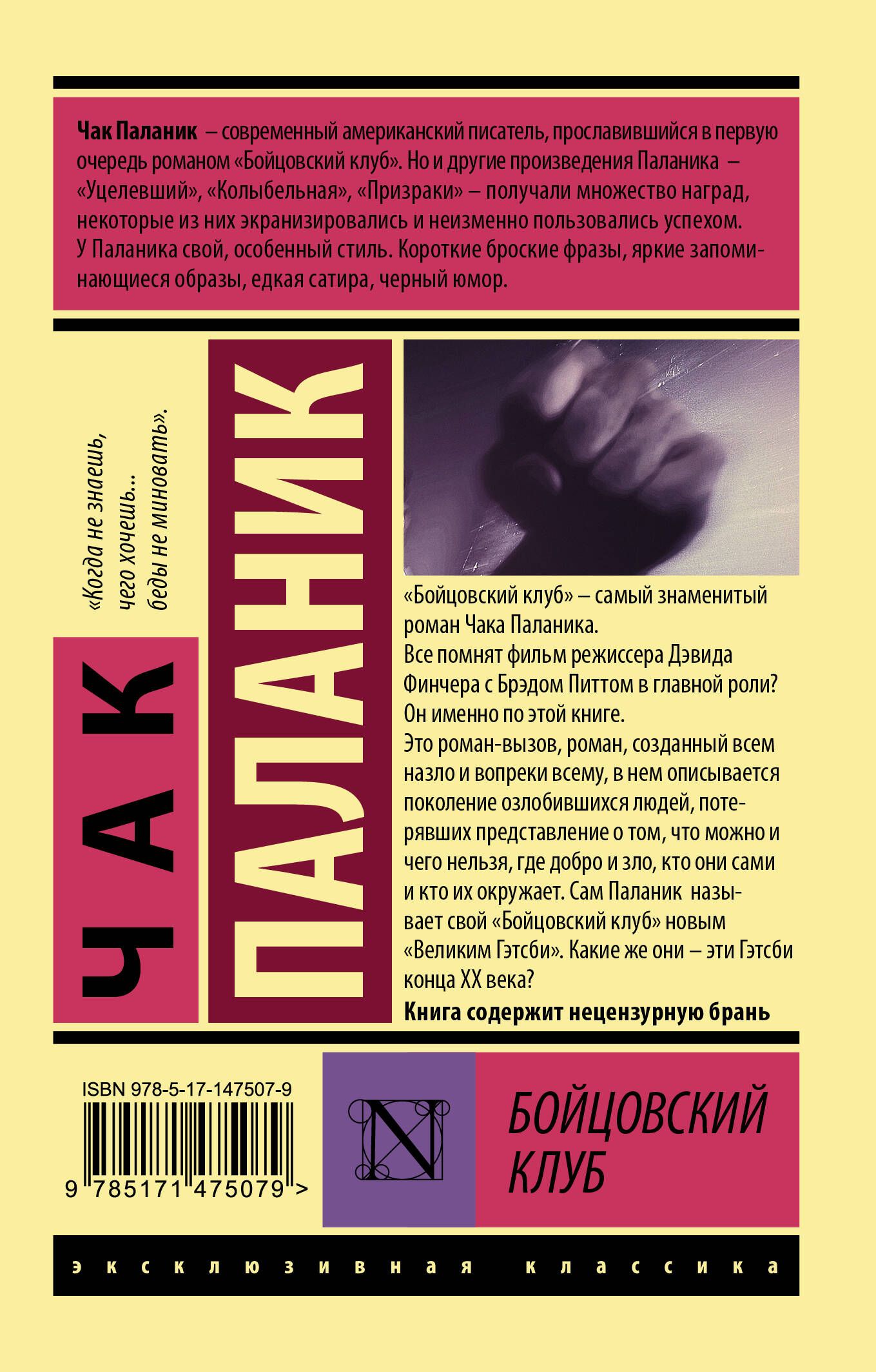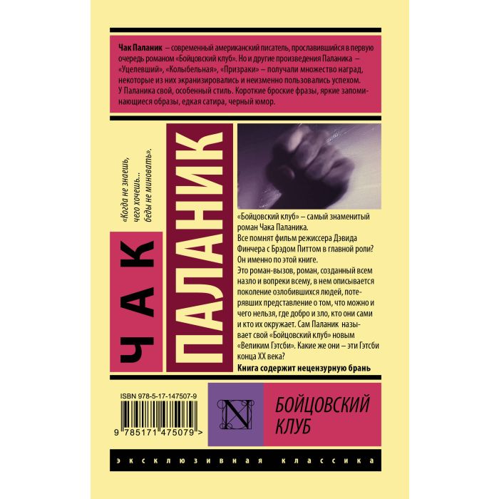 "Бойцовский клуб" – самый знаменитый роман Чака Паланика. Все помнят фильм режиссера Дэвида Финчера с Брэдом Питтом в главной роли? Он именно по этой книге. Это роман-вызов, роман, созданный всем назло и вопреки всему, в нем описывается поколение озлобившихся людей, потерявших представление о том, что можно и чего нельзя, где добро и зло, кто они сами и кто их окружает. Сам Паланик называет свой "Бойцовский клуб" новым "Великим Гэтсби". Какие же они – эти Гэтсби конца XX века?