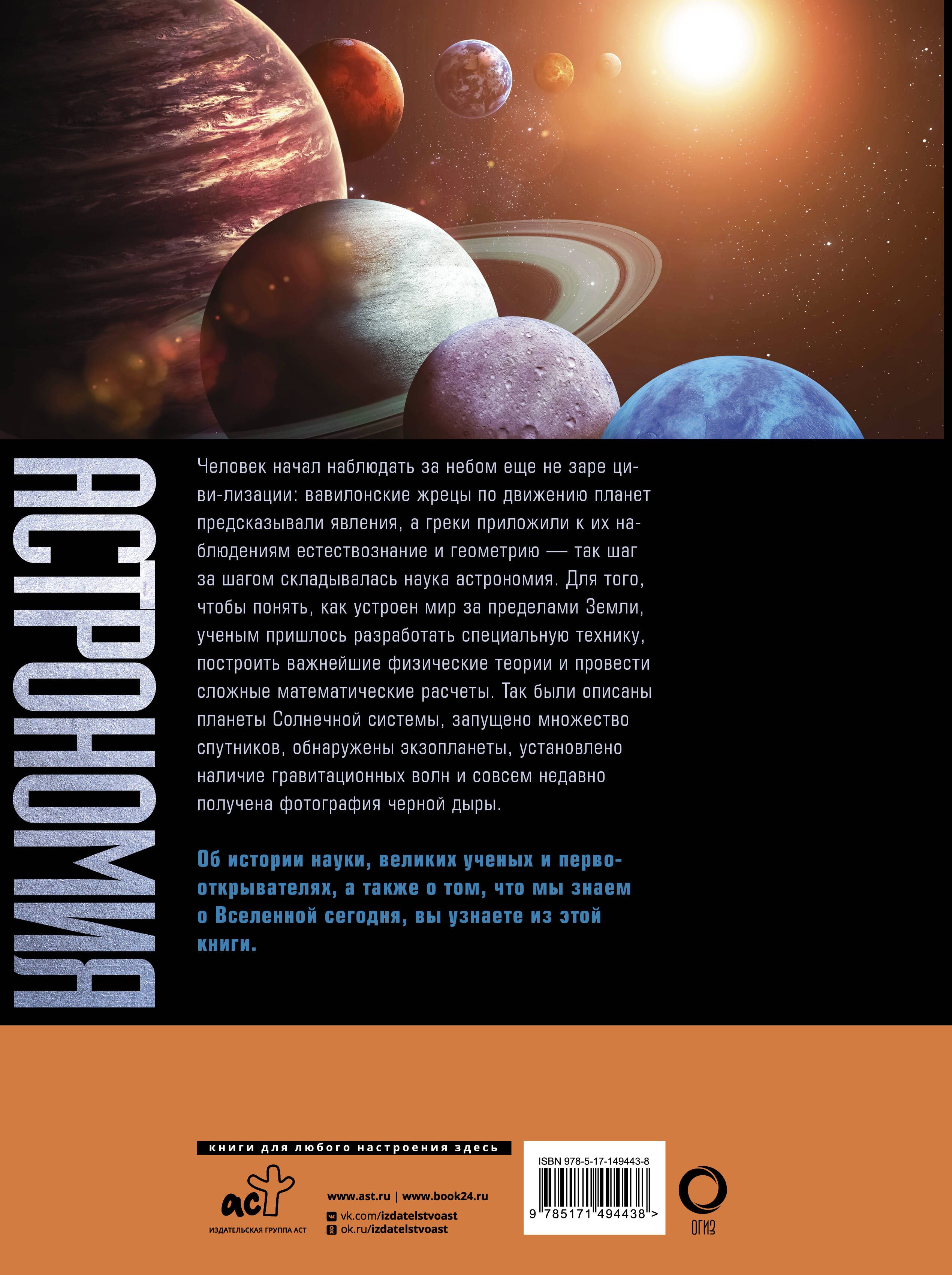 Человек начал наблюдать за небом еще на заре цивилизации: вавилонские жрецы по движению планет предсказывали явления, а греки приложили к их наблюдениям естествознание и геометрию - так шаг за шагом складывалась наука астрономия. Для того чтобы понять, как устроен мир за пределами Земли, ученым пришлось разработать специальную технику, построить важнейшие физические теории и провести сложные математические расчеты. Так были описаны планеты Солнечной системы, запущено множество спутников, обнаружены экзопланеты, установлено наличие гравитационных волн и совсем недавно получена фотография черной дыры. Об истории науки, великих ученых и первооткрывателях, а также о том, что нам известно о Вселенной сегодня, вы узнаете из этой книги.