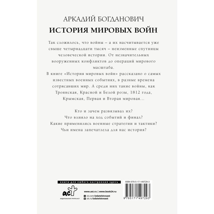 Война — неизменная спутница человеческой истории. История войн — это история цивилизации: от битвы за Трою и крестовых походов, до войны с Наполеоном и Второй мировой. Это издание дает представление о важнейших военных событиях человечества, которые отличились кровопролитностью и которые изменили мир. Грандиозные победы и громкие поражения, именитые полководцы и хитроумные стратегии — всё это читатель найдет на страницах книги. "История мировых войн" будет интересна всем, кто любит изучать военную историю, стратегию и тактику военного искусства.