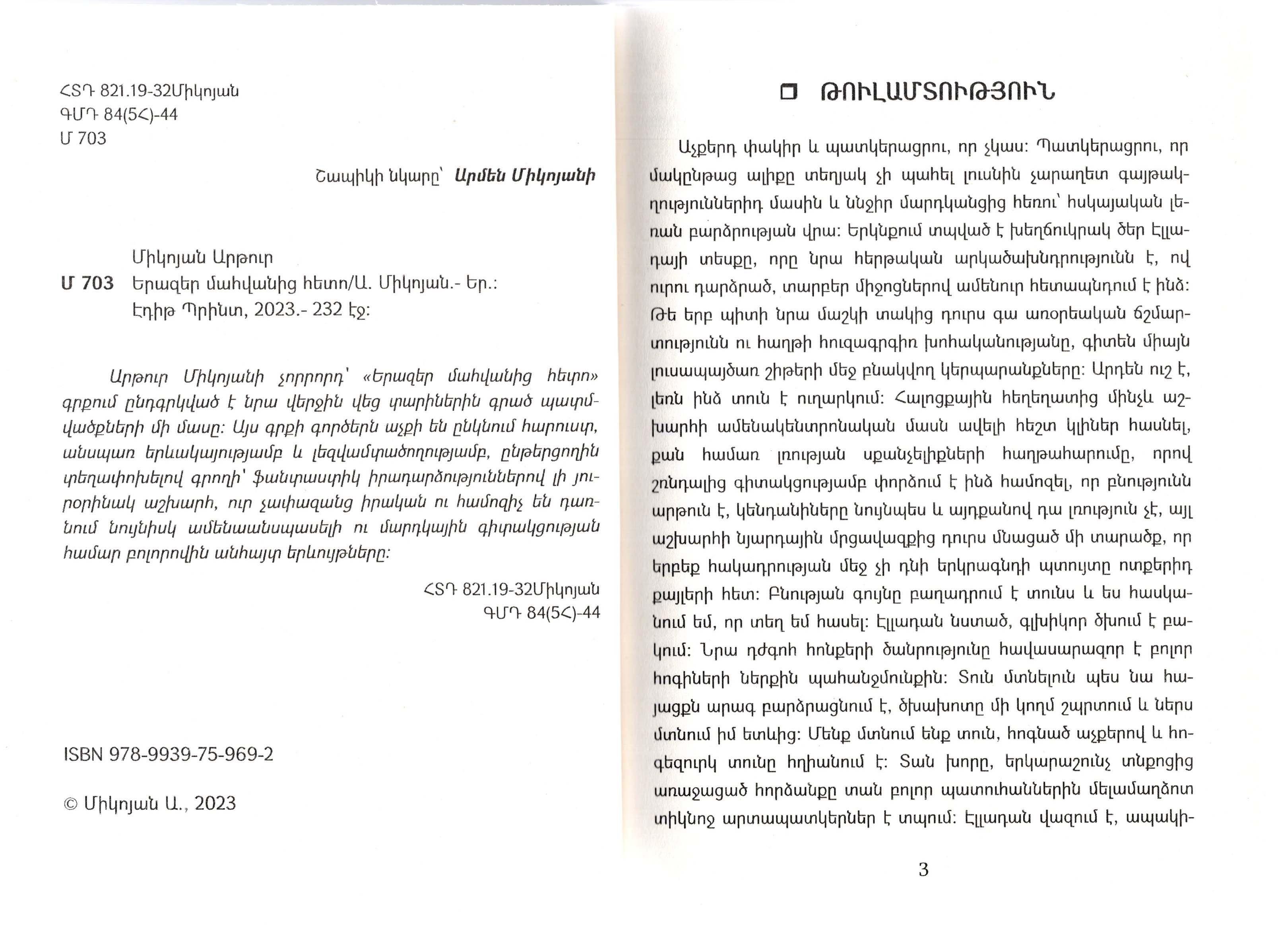 Արթուր Միկոյանի 4-րդ՝ «Երազներ մահվանից հետո» գրքում ընդգրկված է նրա վերջին վեց տարիներին գրած պատմվածքների մի մասը: Այս գրքի գործերն աչքի են ընկնում հարուստ, անսպառ երևակայությամբ և լեզվամտածողությամբ, ընթերցողին տեղափոխելով գրողի՝ ֆանտաստիկ իրադարձություններով լի յուրօրինակ աշխարհ, ուր չափազանց իրական ու համոզիչ են դառնում նույնիսկ ամենաանսպասելի ու մարդկային գիտակցության համար բոլորովին անհայտ երևույթները: