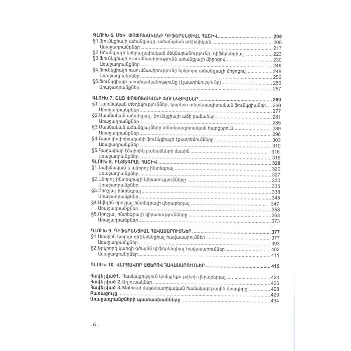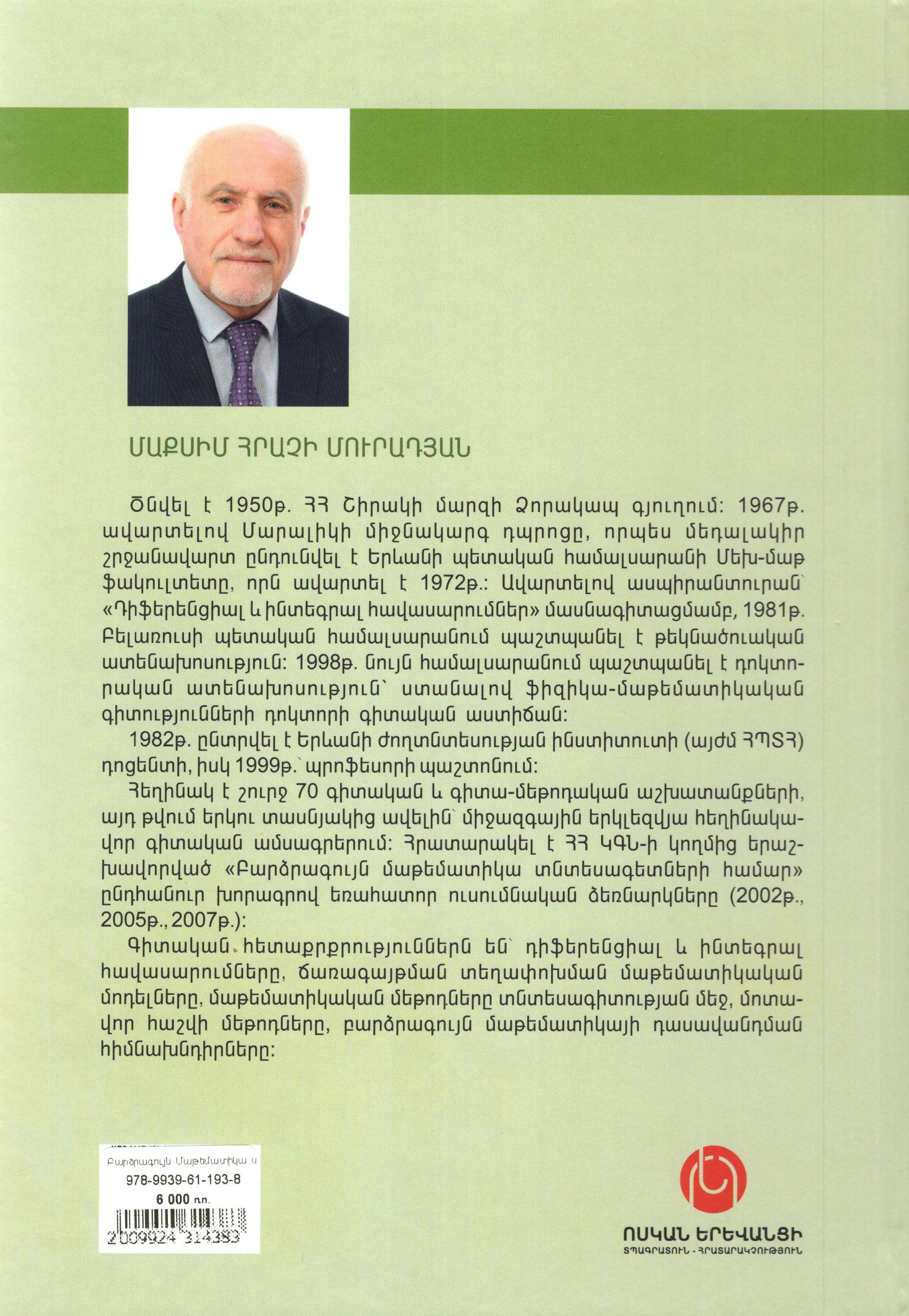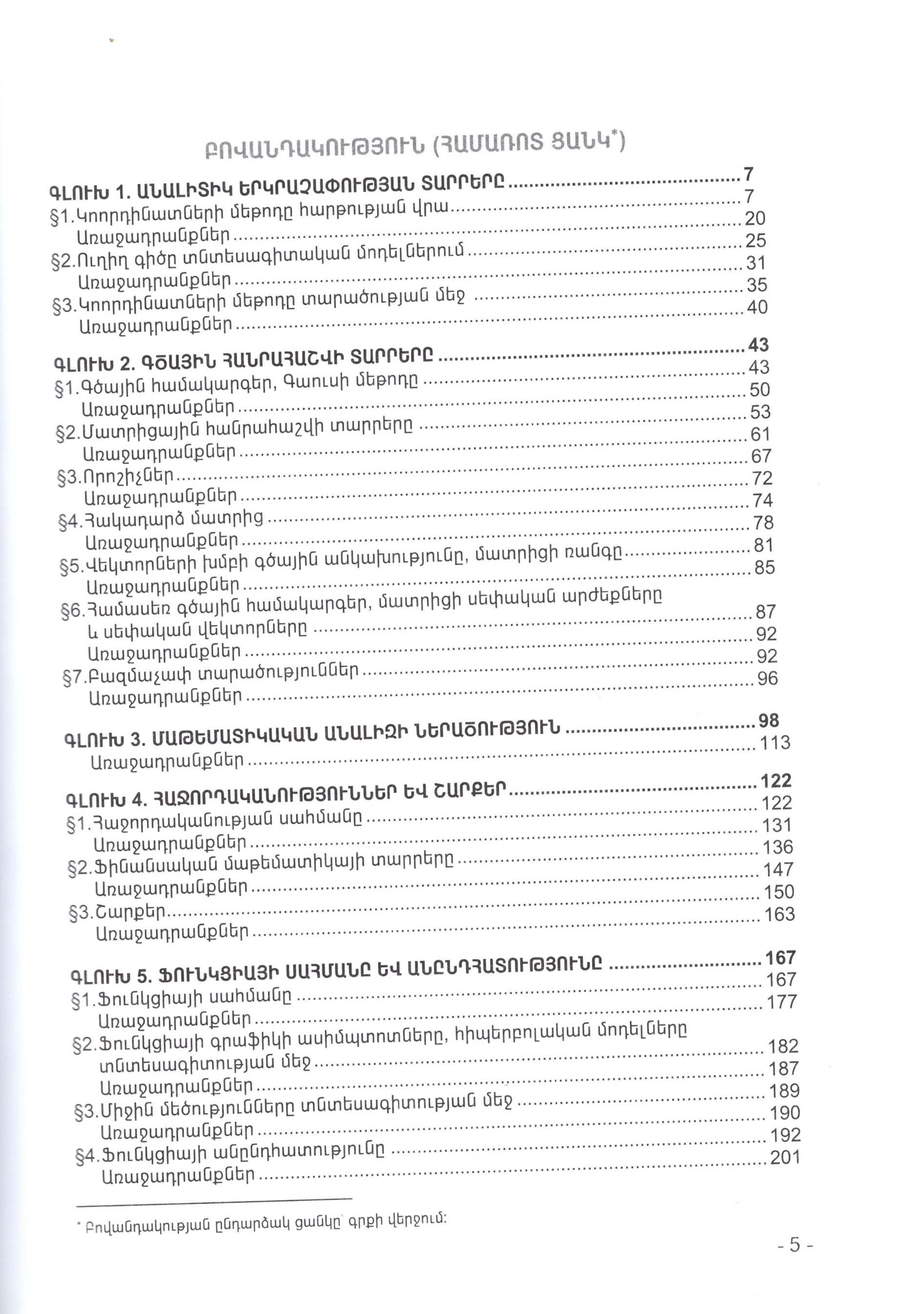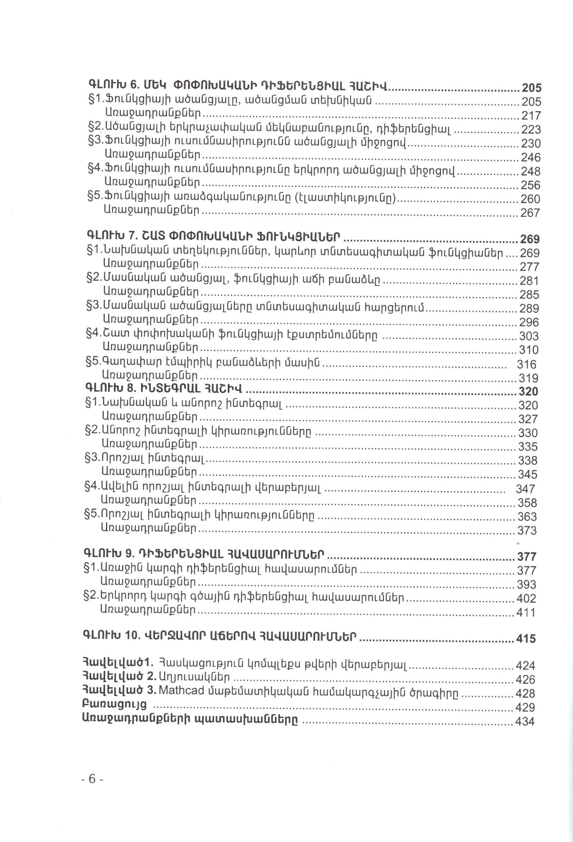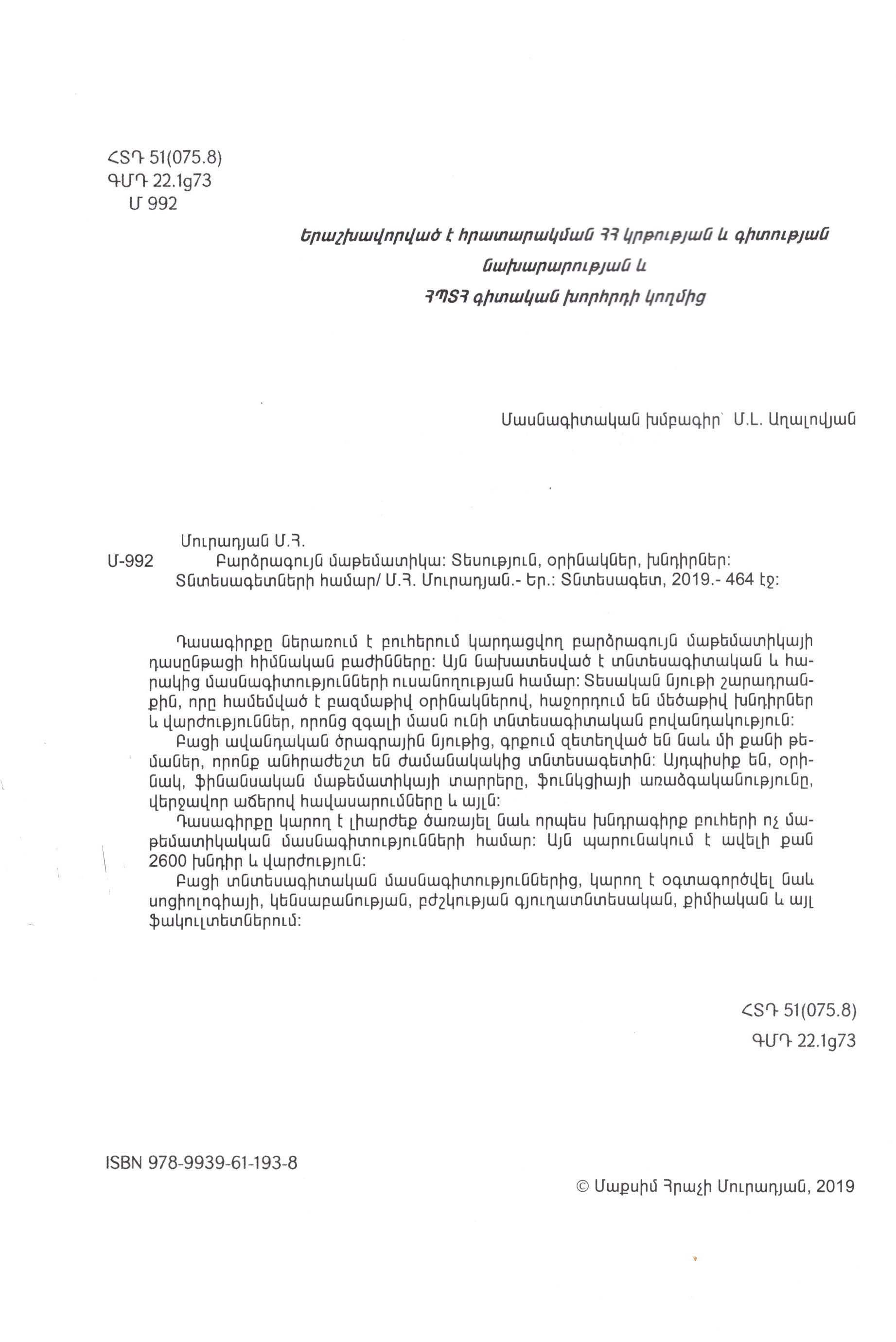 Դասագիրքը ներառում է բուհերում կարդացվող բարձրագույն մաթեմատիկայի դասընթացի հիմնական բաժինները: Այն նախատեսված է տնտեսագիտական և հարակից մասնագիտությունների ուսանողության համար: Տեսական նյութի շարադրանքին, որը համեմված է բազմաթիվ օրինակներով, հաջորդում են մեծաթիվ խնդիրներ և վարժություններ, որոնց զգալի մասն ունի տնտեսագիտական բովանդակություն: Բացի ավանդական ծրագրային նյութից, գրքում զետեղված են նաև մի քանի թոմաներ, որոնք անհրաժեշտ են ժամանակակից տնտեսագետին: Այդպիսիք են օրինակ, ֆինանսական մաթեմատիկայի տարրերը, ֆունկցիայի առաձգականությունը, վերջավոր աճերով հավասարումները և այլն: Դասագիրքը կարող է լիարժեք ծառայել նաև որպես խնդրագիրք բուհերի ոչ մաթեմատիկական մասնագիտությունների համար: Այն պարունակում է ավելի քան 2600 խնդիր և վարժություն: Բացի տնտեսագիտական մասնագիտություններից, կարող է օգտագործվել նաև սոցիոլոգիայի, կենսաբանության, բժշկության ,գյուղատնտեսական, քիմիական և այլ ֆակուլտետներում: