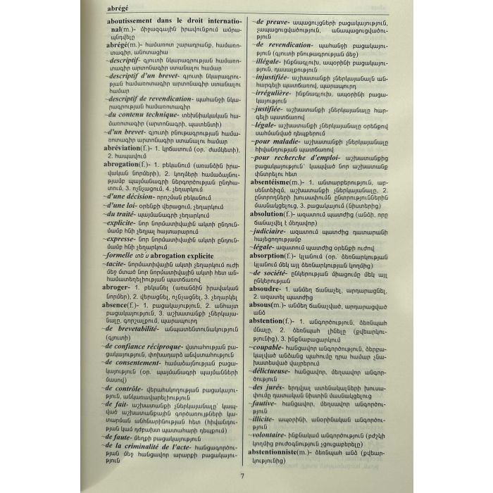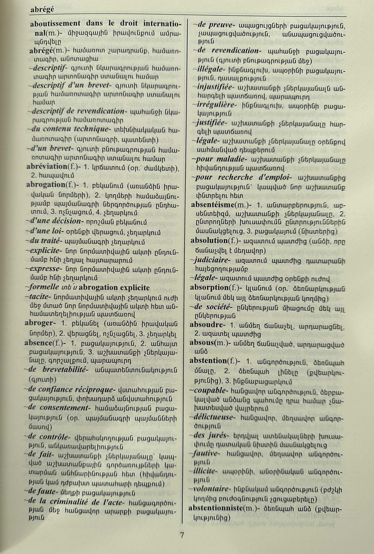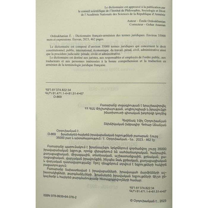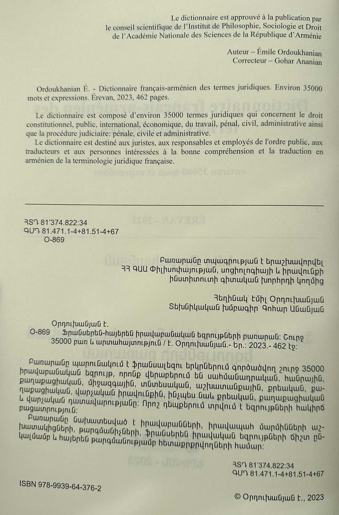 Բառարանը պարունակում է ֆրանսալեզու երկրներում գործածվող շուրջ 35000 իրավաբանական եզրույթ, որոնք վերաբերում են սահմանադրական, հանրային, քաղաքացիական, միջազգային, տնտեսական, աշխատանքային, քրեական, քաղաքացիական, վարչական իրավունքին, ինչպես նաև քրեական, քաղաքացիական, վարչական դատավարությանը: Որոշ դեպքերում տրվում է եզրույթների հակիրճ բացատրություն: Բառարանը նախատեսված է իրավաբանների, իրավապահ մարմինների աշխատակիցների, թարգմանիչների, ֆրանսերեն իրավական եզրույթների ճիշտ ընկալմամբ և հայերեն թարգմանությամբ հետաքրքրվողների համար: