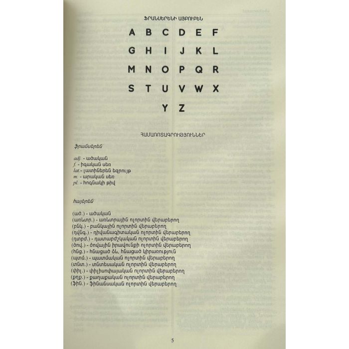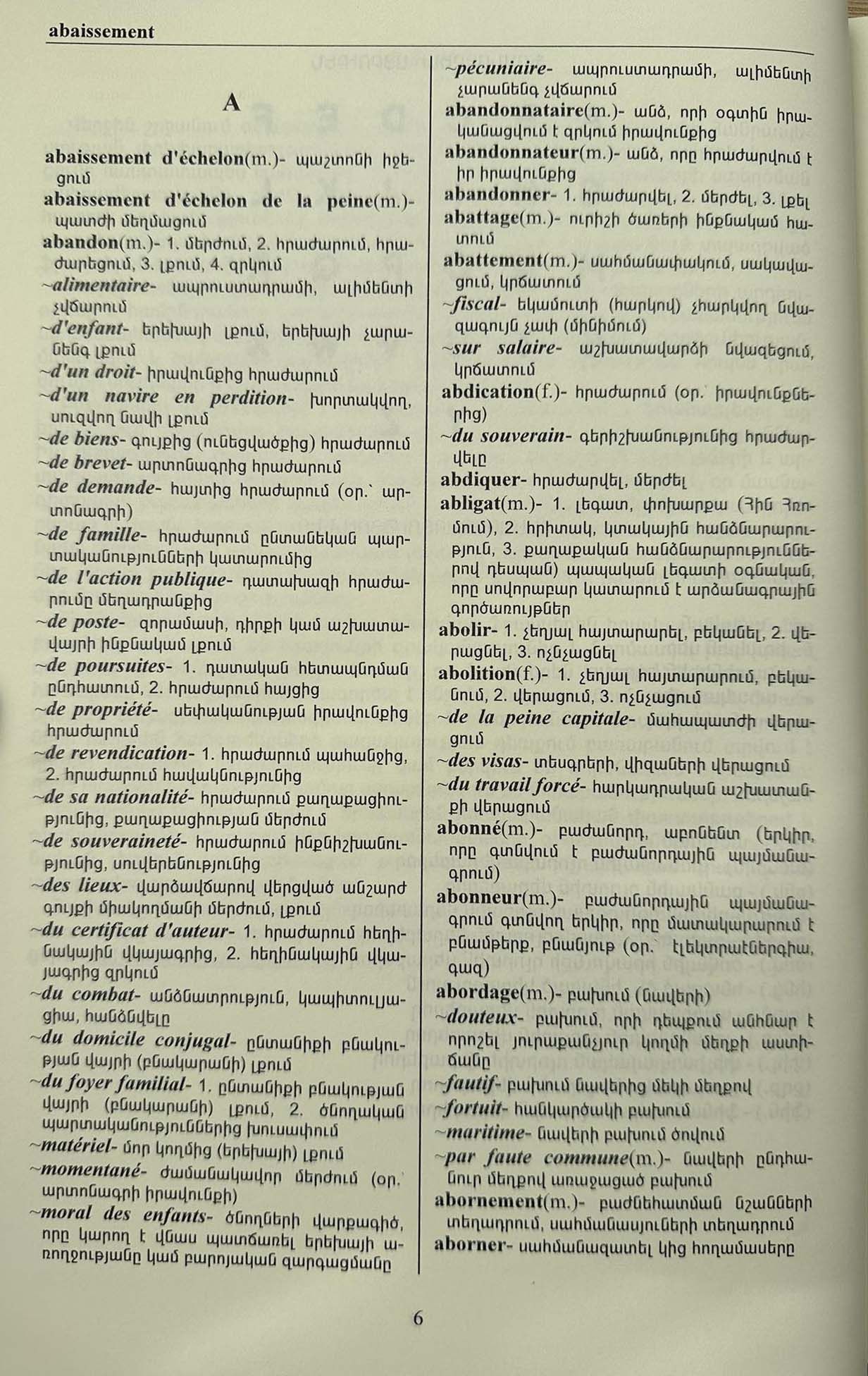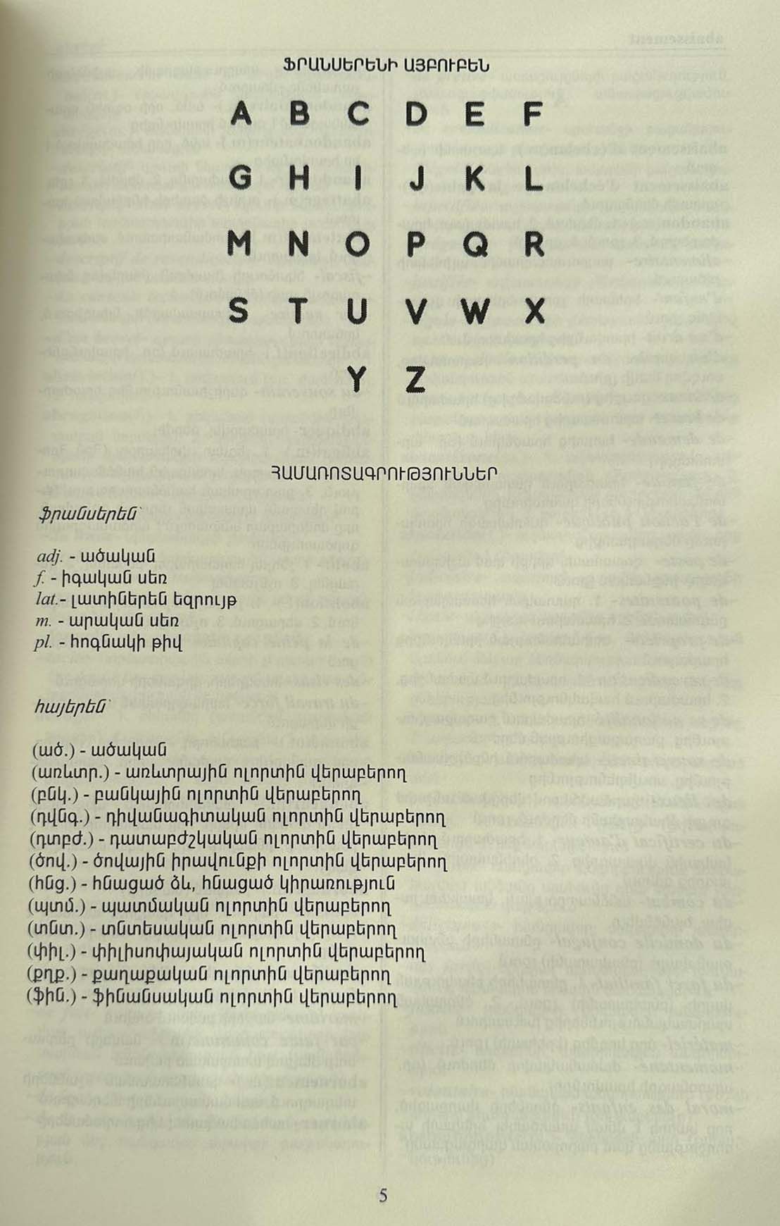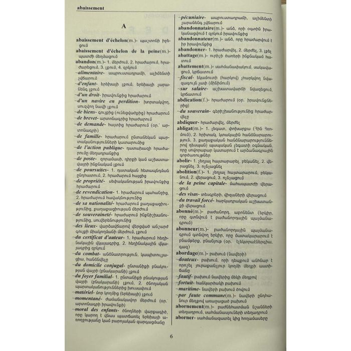 Բառարանը պարունակում է ֆրանսալեզու երկրներում գործածվող շուրջ 35000 իրավաբանական եզրույթ, որոնք վերաբերում են սահմանադրական, հանրային, քաղաքացիական, միջազգային, տնտեսական, աշխատանքային, քրեական, քաղաքացիական, վարչական իրավունքին, ինչպես նաև քրեական, քաղաքացիական, վարչական դատավարությանը: Որոշ դեպքերում տրվում է եզրույթների հակիրճ բացատրություն: Բառարանը նախատեսված է իրավաբանների, իրավապահ մարմինների աշխատակիցների, թարգմանիչների, ֆրանսերեն իրավական եզրույթների ճիշտ ընկալմամբ և հայերեն թարգմանությամբ հետաքրքրվողների համար: