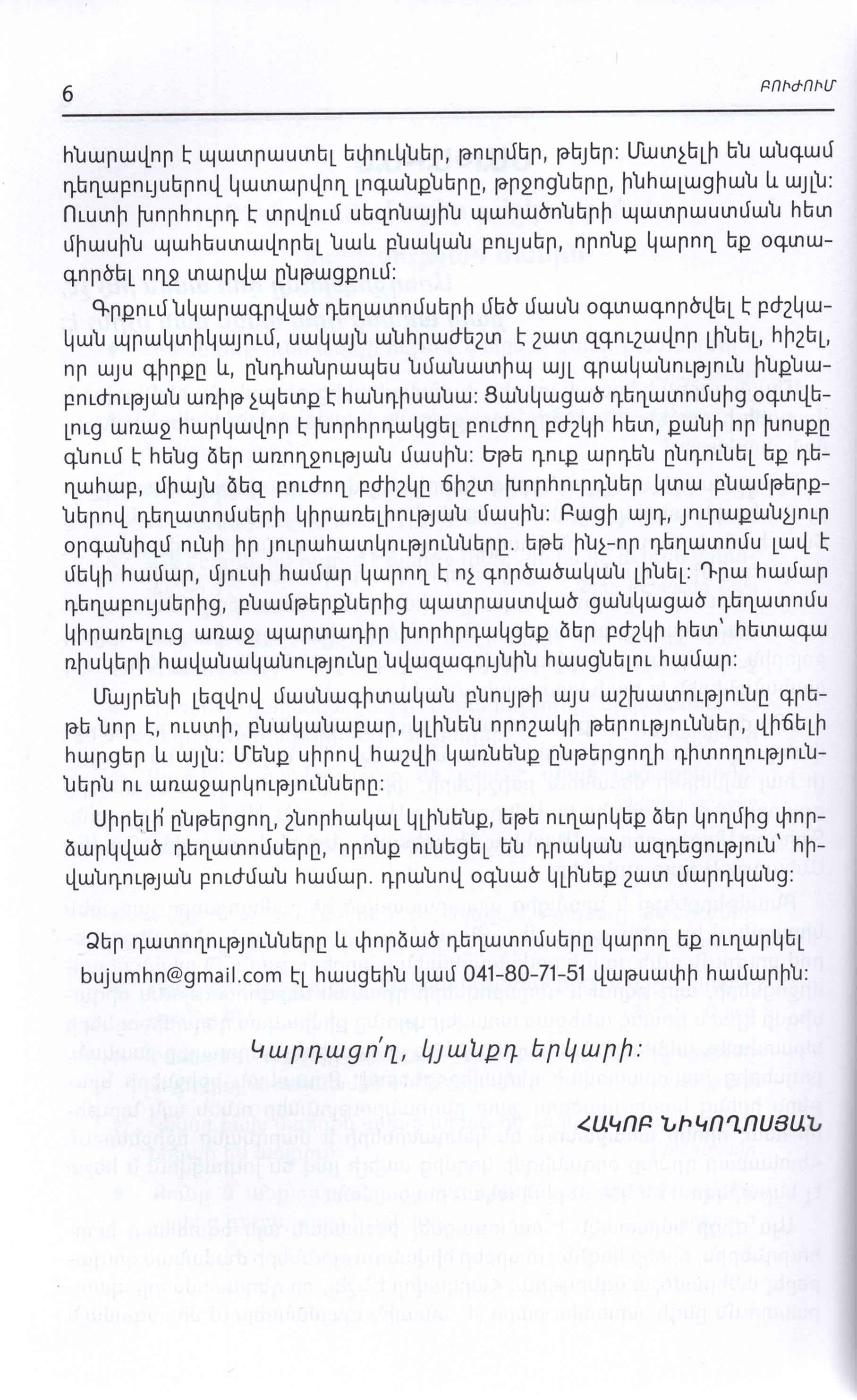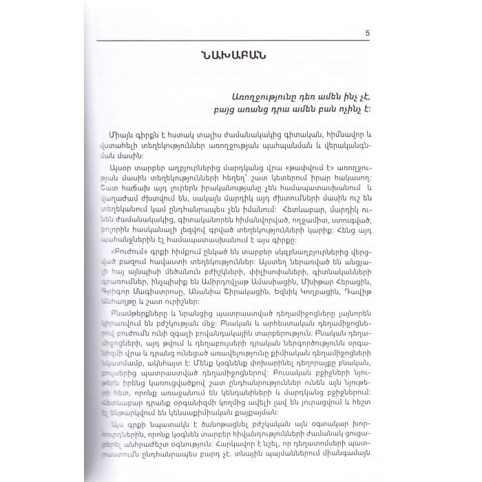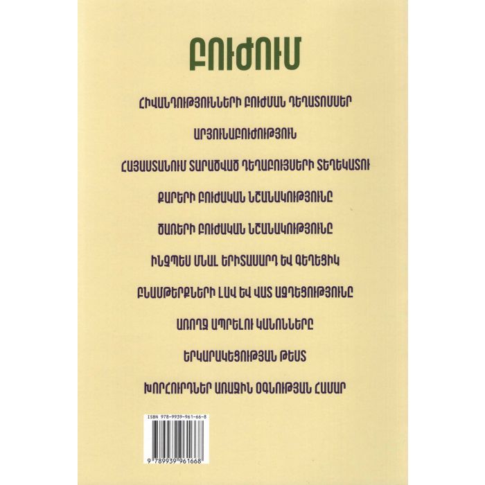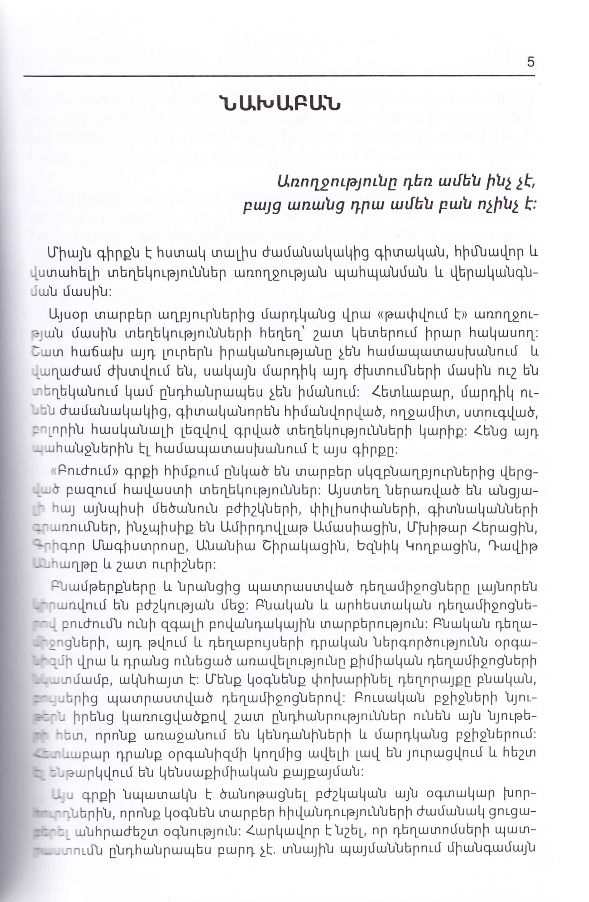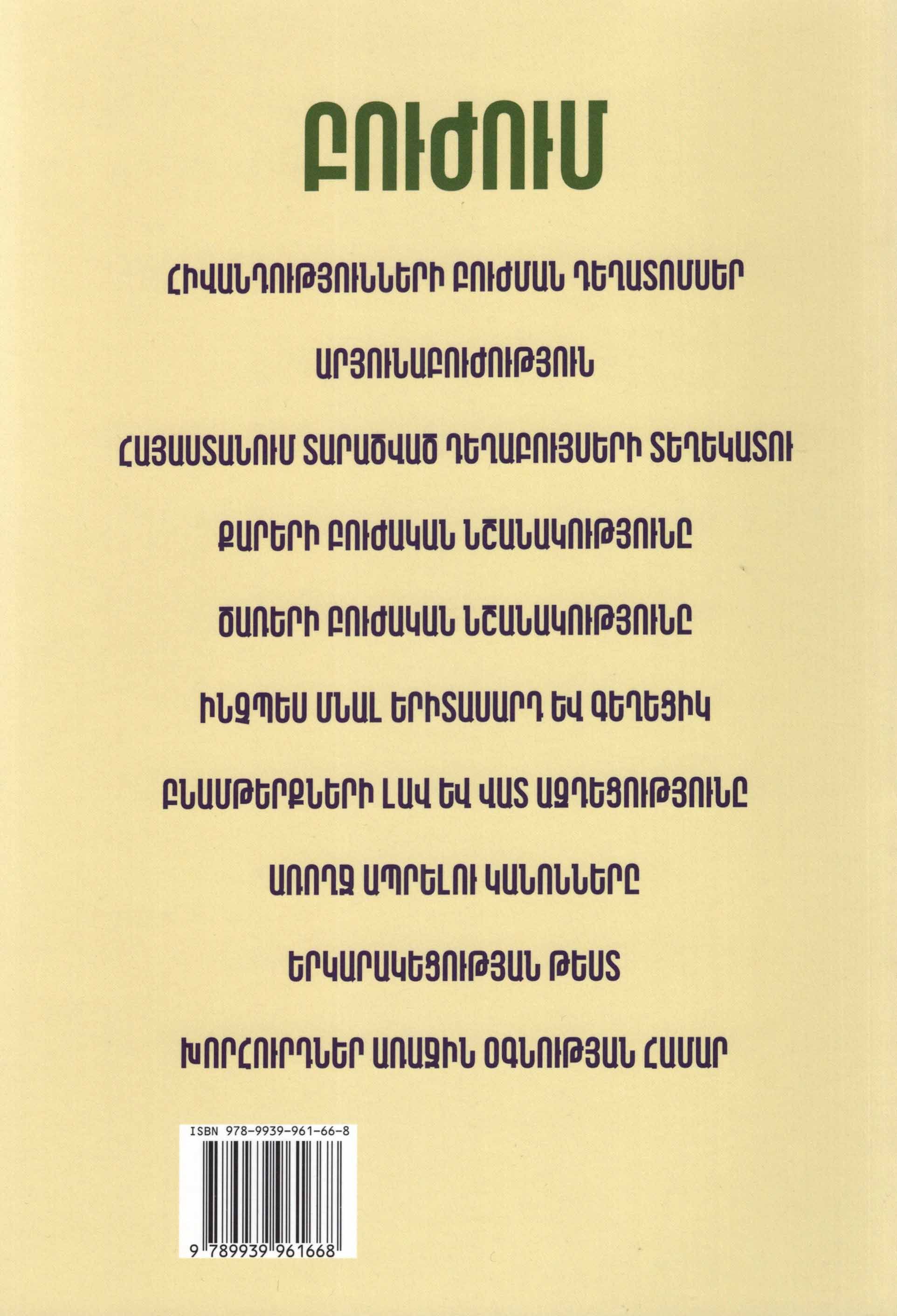 Գրքում զետեղված են ՀՀ-ում լայնորեն տարածում ստացած դեղաբույսեր հանդիսացող՝ պտուղների, բանջարեղենների, հատապտուղների, ծաղիկների մորֆոլոգիական, բուժական և այլ օգտակար, ինչպես նաև վնասակար ազդեցությունները՝ բերված ինչպես հին ու նոր, այնպես էլ գիտական բժշկության մեջ հայտնի տվյալներ և բազմամյա փորձը: Հեղինակի հիմնական նպատակն է օգնել որոշ հիվանդություններ բուժել տնային պայմաններում՝ օգտվելով բնության բարիքներից: Բազմաթիվ հիվանդությունների համար առաջարկվում են հիմնական դեղատոմսեր՝ փորձված և կիրառված: Շատ հիվանդությունների դեպքում բնամթերքների օգտակար և վնասակար ազդեցությունների մասին տրվում են օգտակար խորհուրդներ: Առաջարկվում է շուրջ 150 տեսակի հիվանդությունների բուժման միջոցներ (բնամթերքներով, դեղաբույսերով, հյութաբուժությամբ, արյունաբուժությամբ և նույնիսկ հեքիմական միջոցներով), ինչպես նաև ներկայացված է 500 և ավելի դեղատոմսեր տարածված և ոչ տարածված հիվանդությունների բուժման համար: Նկարագրված է, թե ինչ պետք է անել առաջին օգնության ժամանակ որոշ երևույթների դեպքում և թե ինչ բնամթերքներից կարելի է օգտվել, ինչպես նաև բնամթերքների տեսակներում (բույսեր, բանջարեղեն, մրգեր, հատապտուղներ, մսամթերք) վիտամինների, միներալների պարունակության չափը: ԲՈՒԺՈՒՄ գիրքը նախատեսված է բոլոր նրանց համար, ովքեր ցանկանում են լինել առողջ: