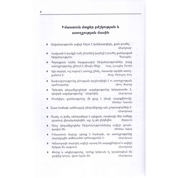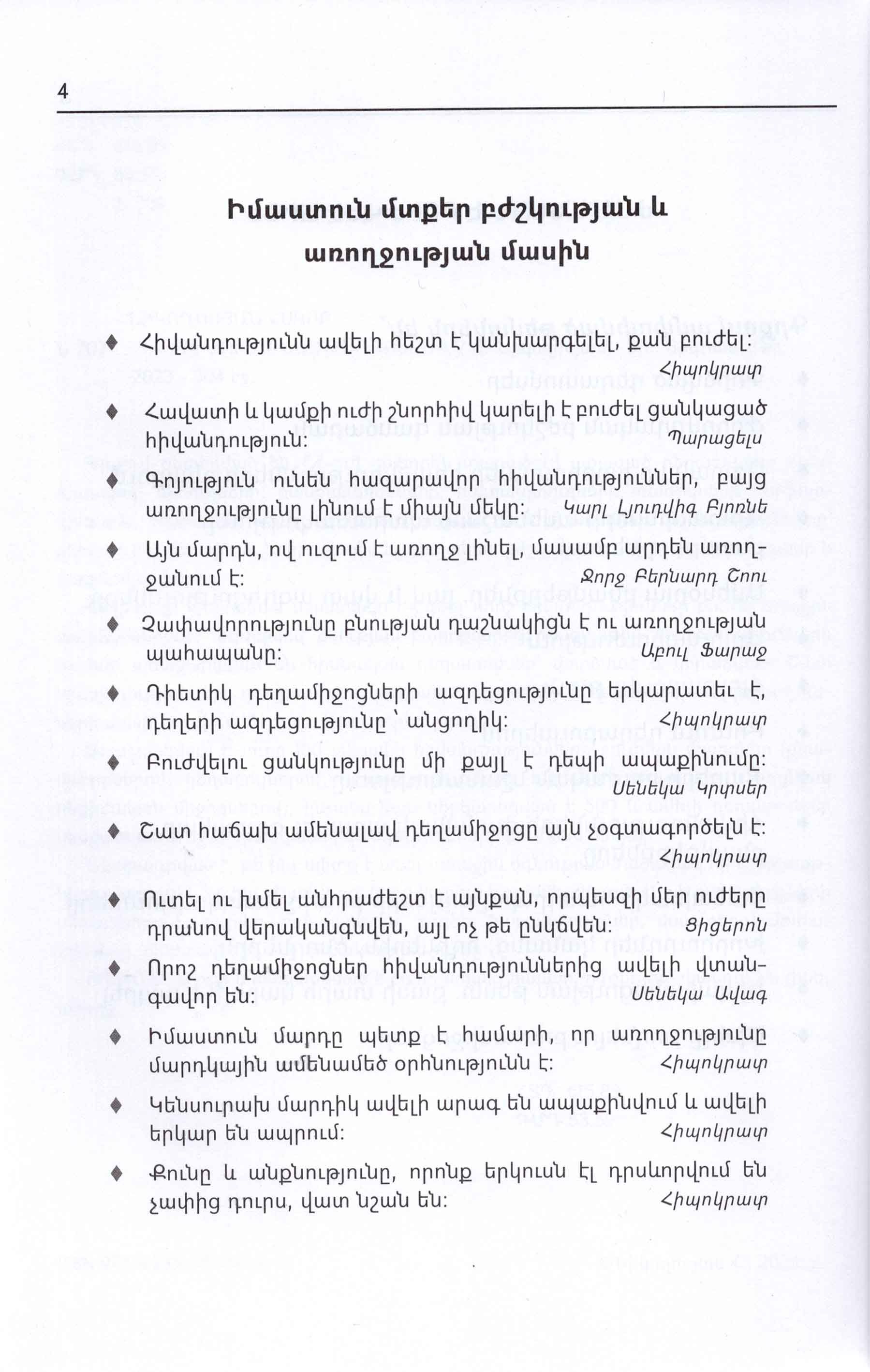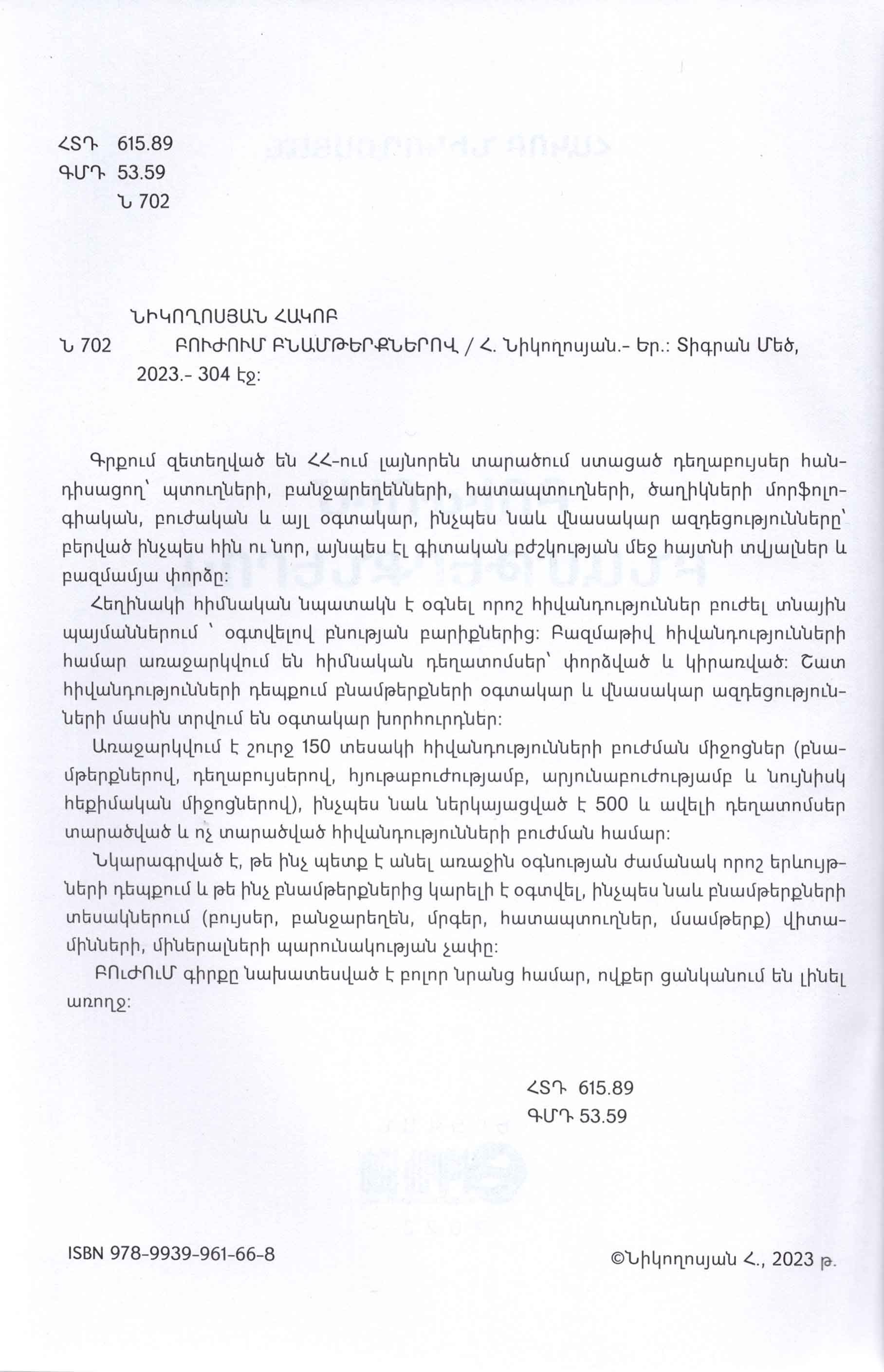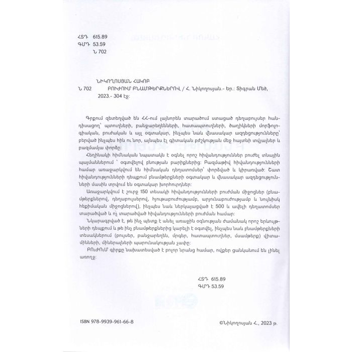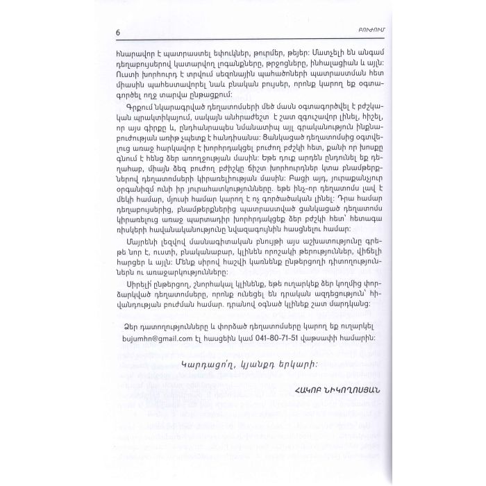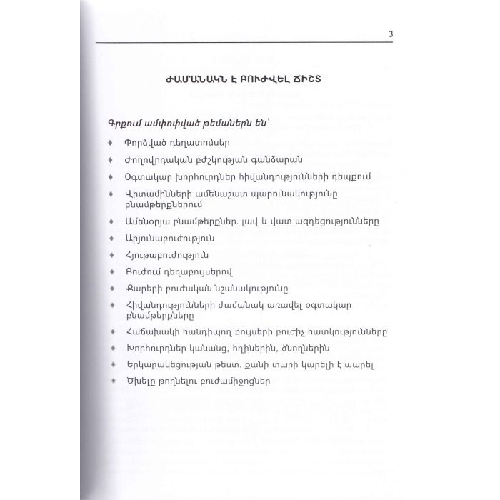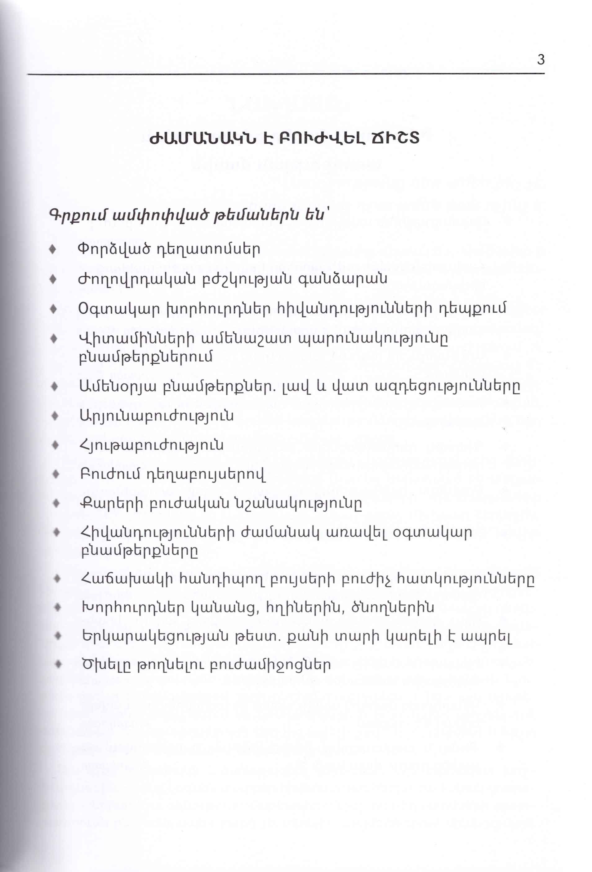 Գրքում զետեղված են ՀՀ-ում լայնորեն տարածում ստացած դեղաբույսեր հանդիսացող՝ պտուղների, բանջարեղենների, հատապտուղների, ծաղիկների մորֆոլոգիական, բուժական և այլ օգտակար, ինչպես նաև վնասակար ազդեցությունները՝ բերված ինչպես հին ու նոր, այնպես էլ գիտական բժշկության մեջ հայտնի տվյալներ և բազմամյա փորձը: Հեղինակի հիմնական նպատակն է օգնել որոշ հիվանդություններ բուժել տնային պայմաններում՝ օգտվելով բնության բարիքներից: Բազմաթիվ հիվանդությունների համար առաջարկվում են հիմնական դեղատոմսեր՝ փորձված և կիրառված: Շատ հիվանդությունների դեպքում բնամթերքների օգտակար և վնասակար ազդեցությունների մասին տրվում են օգտակար խորհուրդներ: Առաջարկվում է շուրջ 150 տեսակի հիվանդությունների բուժման միջոցներ (բնամթերքներով, դեղաբույսերով, հյութաբուժությամբ, արյունաբուժությամբ և նույնիսկ հեքիմական միջոցներով), ինչպես նաև ներկայացված է 500 և ավելի դեղատոմսեր տարածված և ոչ տարածված հիվանդությունների բուժման համար: Նկարագրված է, թե ինչ պետք է անել առաջին օգնության ժամանակ որոշ երևույթների դեպքում և թե ինչ բնամթերքներից կարելի է օգտվել, ինչպես նաև բնամթերքների տեսակներում (բույսեր, բանջարեղեն, մրգեր, հատապտուղներ, մսամթերք) վիտամինների, միներալների պարունակության չափը: ԲՈՒԺՈՒՄ գիրքը նախատեսված է բոլոր նրանց համար, ովքեր ցանկանում են լինել առողջ: