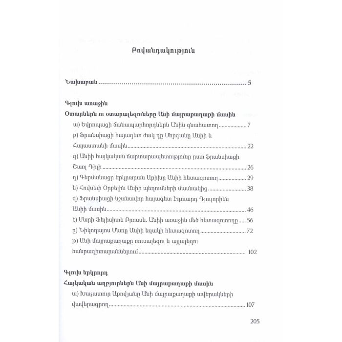 Գիրքը ներկայացնում է հայ Բագրատունիների թագավորության Անի մայրաքաղաքի մասին անգլիացի, ֆրանսիացի, գերմանացի, ռուս ճանապարհորդների և հայագետների այն մեծարժեք գնահատականները, որոնք տրվել են Անի քաղաքի պատմությանն ու բարձրակարգ ճարտարապետությանը: Գիրքն ունի անգլերեն ու ֆրանսերեն ծավալուն վերջաբաններ, որոնք կօգնեն օտարազգիներին իմանալու Մեծ Հայքի տիեզերահռչակ քաղաքի ճշմարիտ պատմությունը: Նախատեսվում է ընթերցող լայն շրջանակի համար: