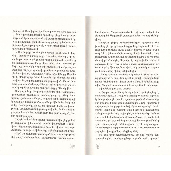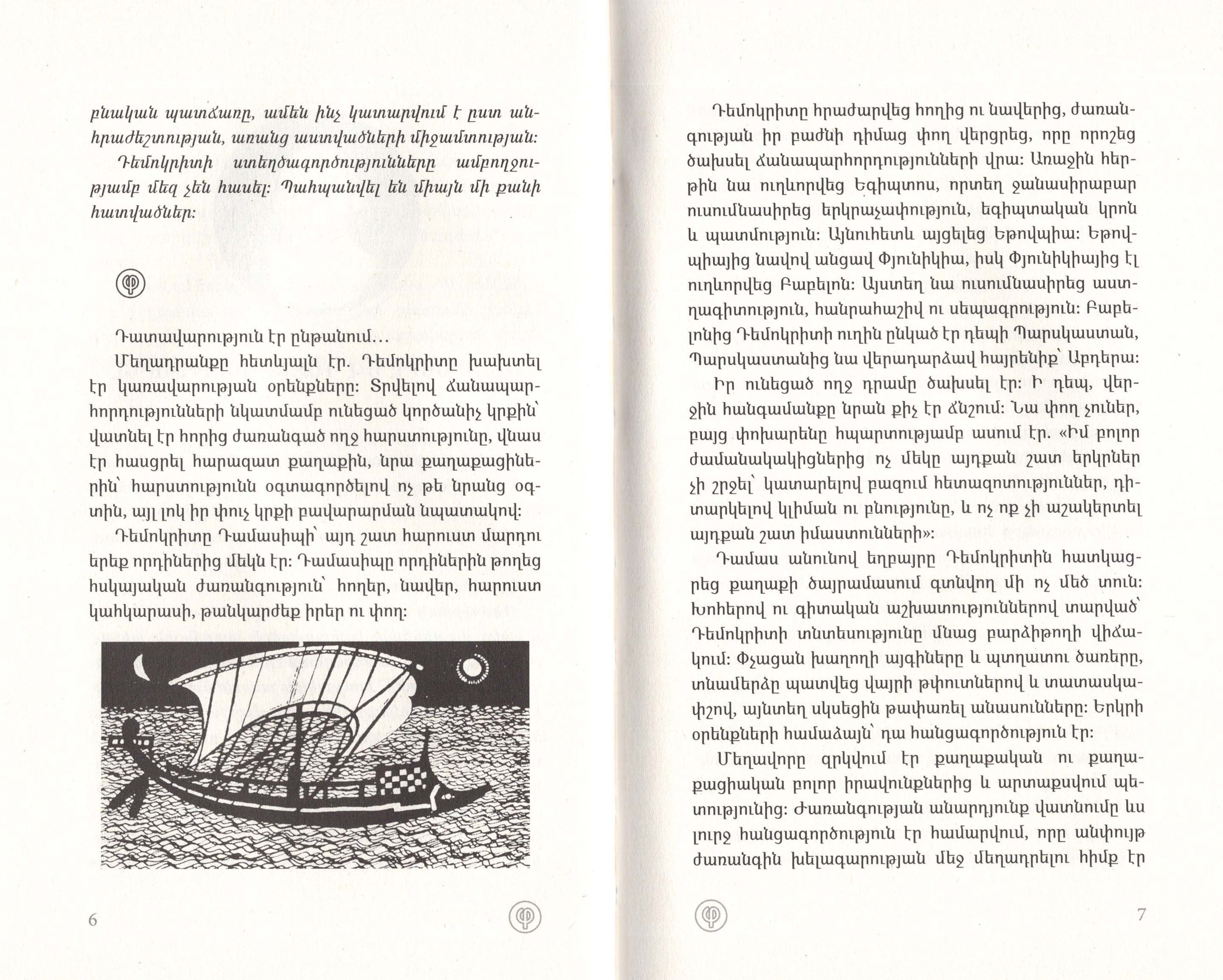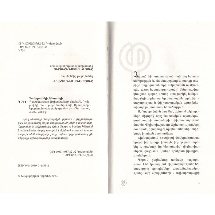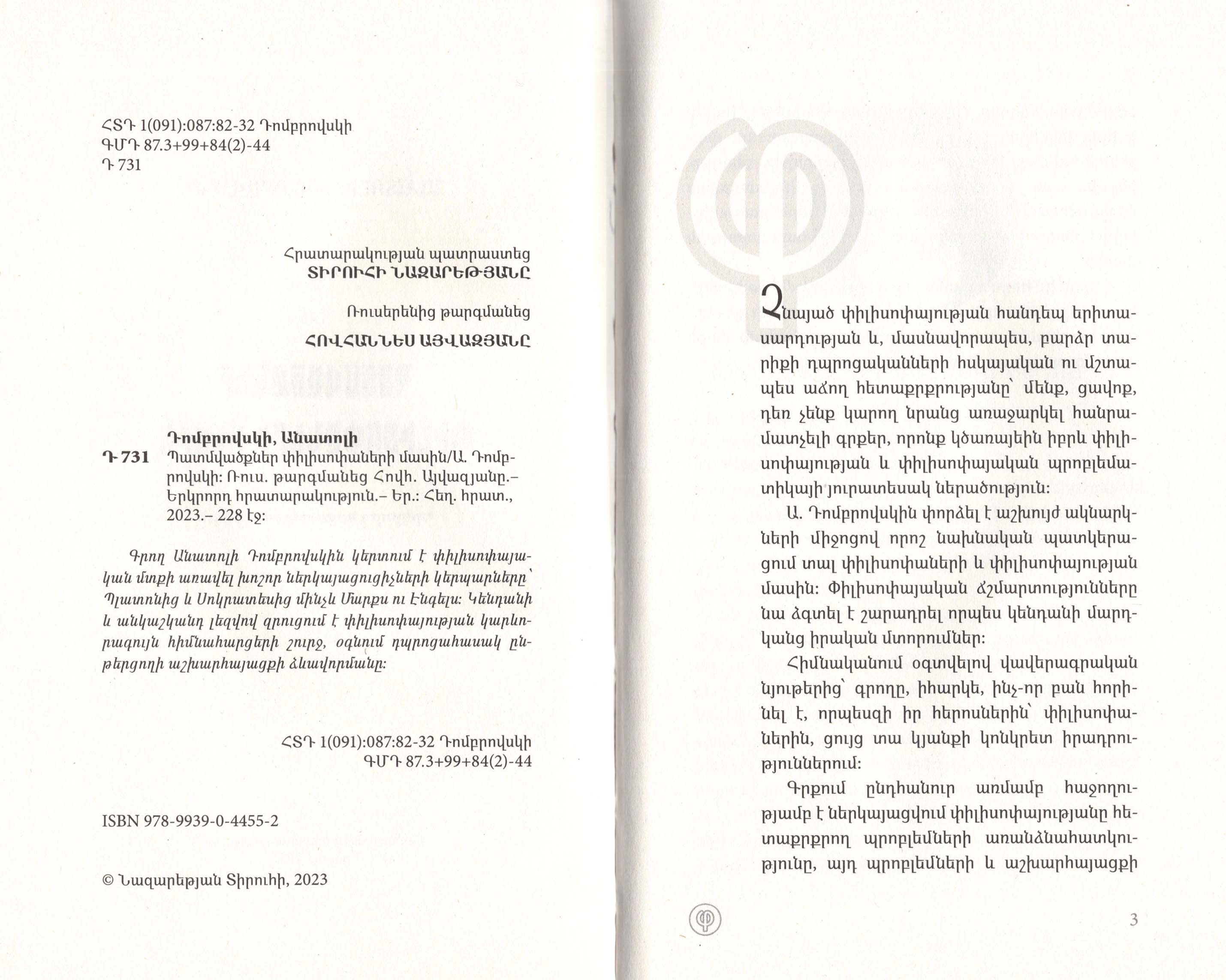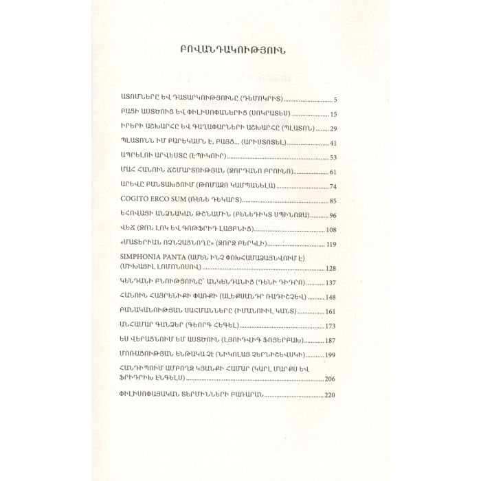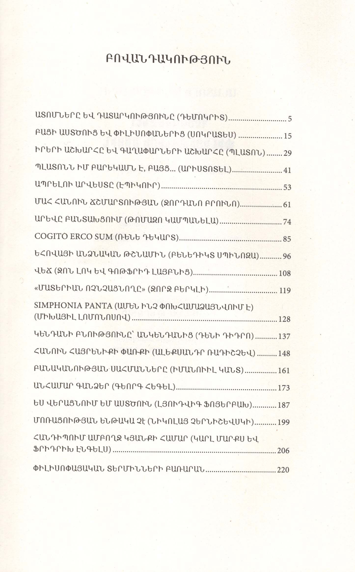Գրող Անատոլի Դոմբրովսկին կերտում է փիլիսոփայական մտքի առավել խոշոր ներկայացուցիչների կերպարները՝ Պլատոնից և Սոկրատեսից մինչև Մարքս ու Էնգելս: Կենդանի և անկաշկանդ լեզվով զրուցում է փիլիսոփայության կարևորագույն հիմնահարցերի շուրջ, օգնում դպրոցահասակ ընթերցողի աշխարհայացքի ձևավորմանը: