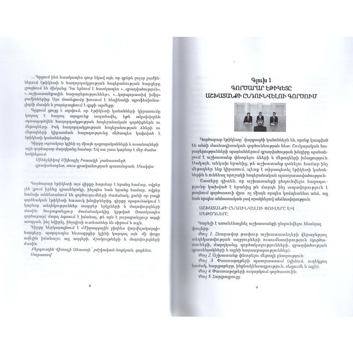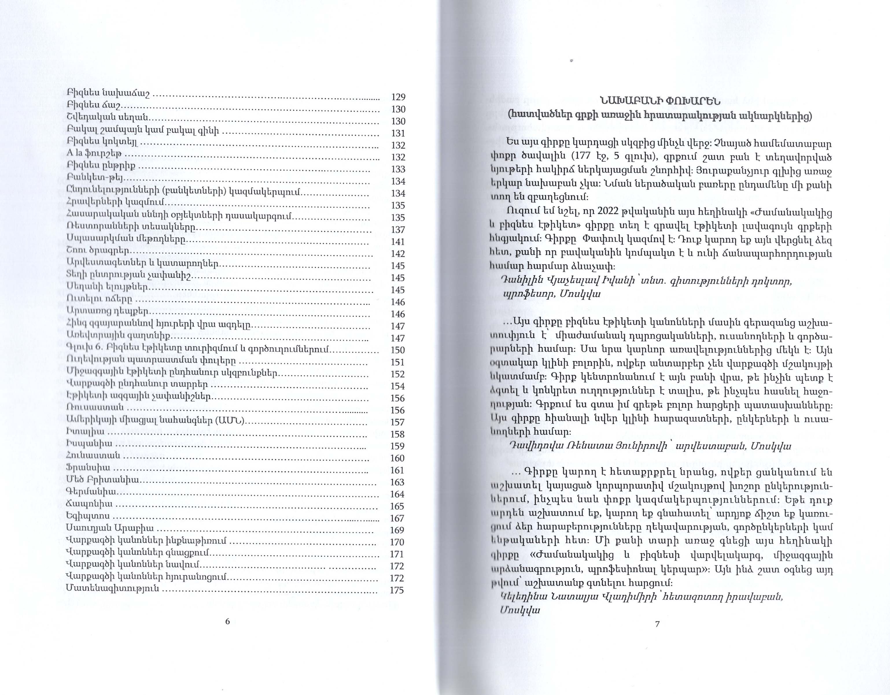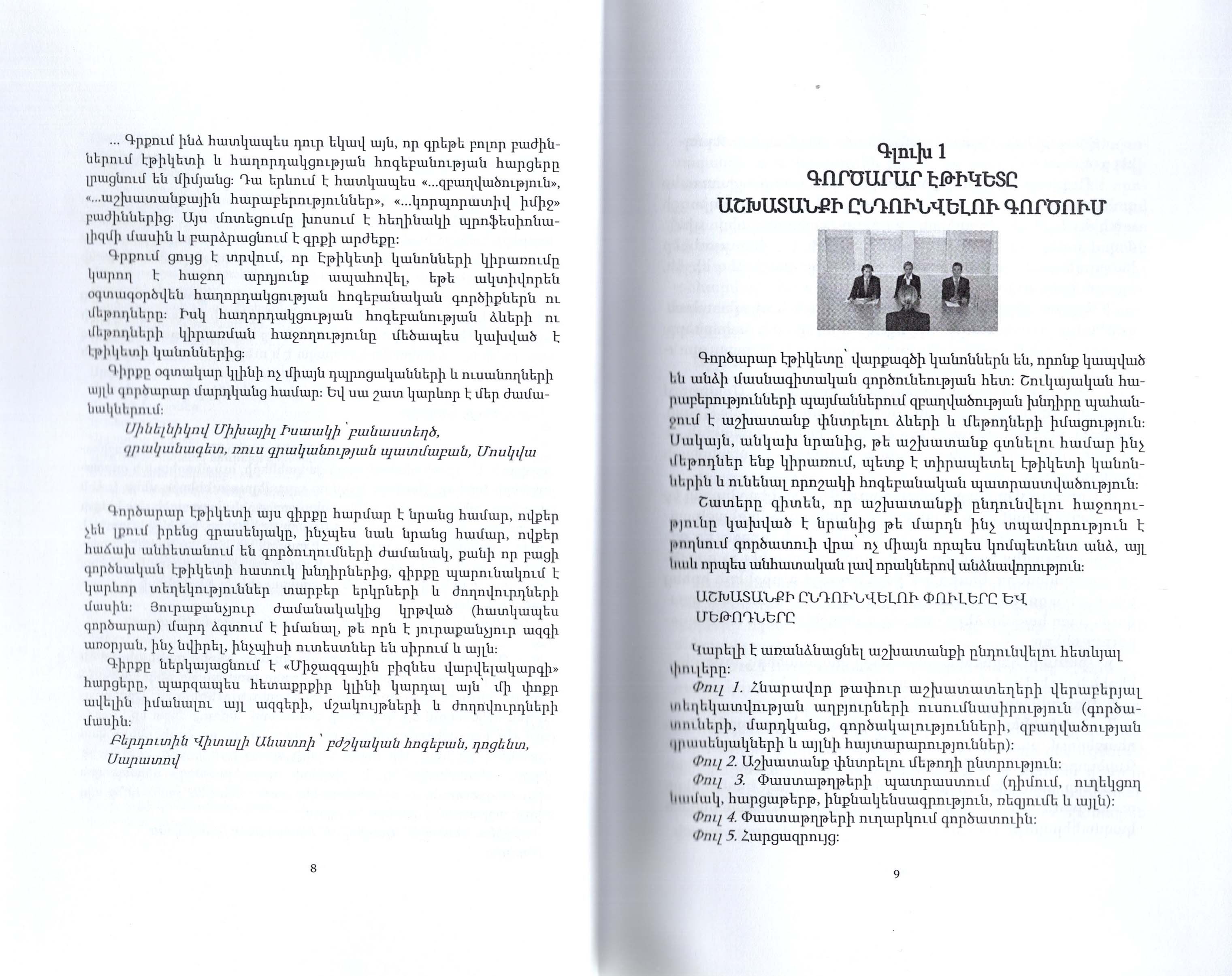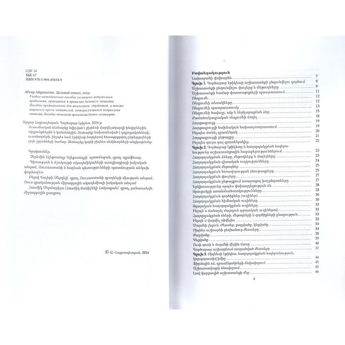 Ուսումնական ձեռնարկը նվիրված է բիզնեսի վարվելակարգի խնդիրներին, սկզբունքներին և կանոններին: Ձեռնարկը նախատեսված է դպրոցականների, ուսանողների, ինչպես նաև էթիկետի հարցերով հետաքրքրվող ընթերցողների լայն շրջանների համար: Ձեռնարկը կօգնի բիզնես սեմինարների անցկացմանը: