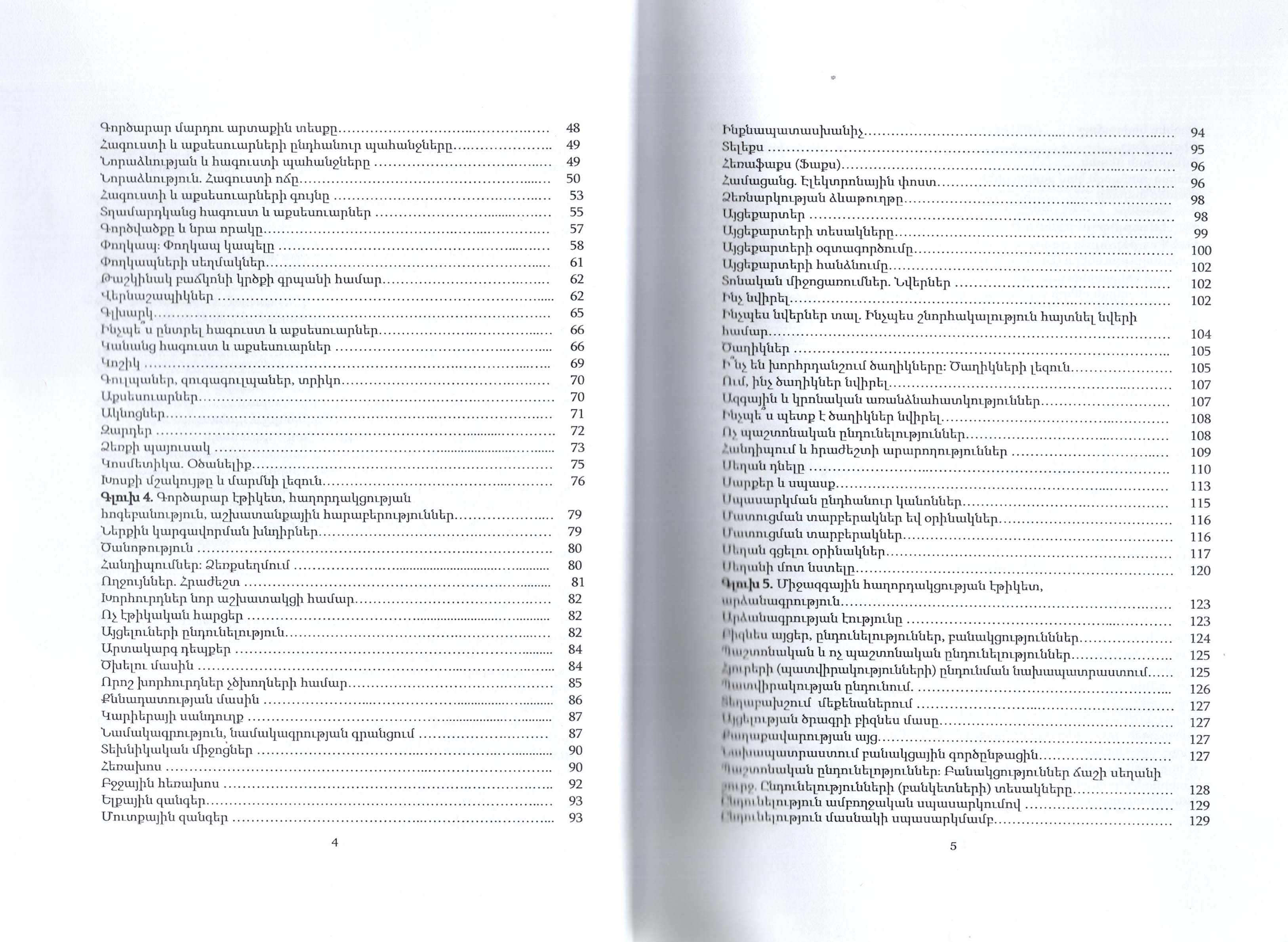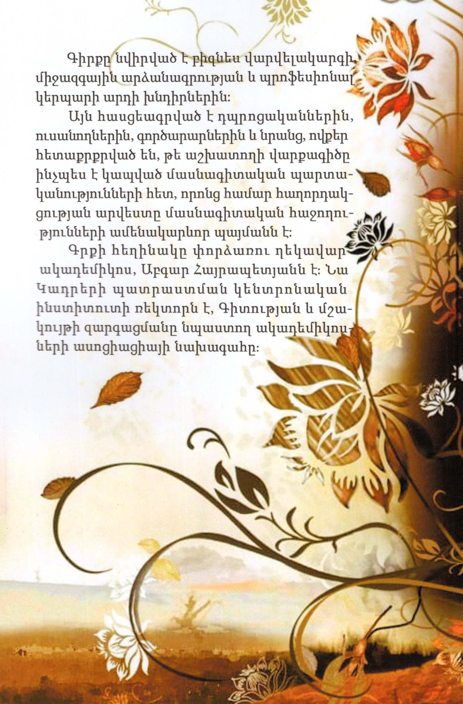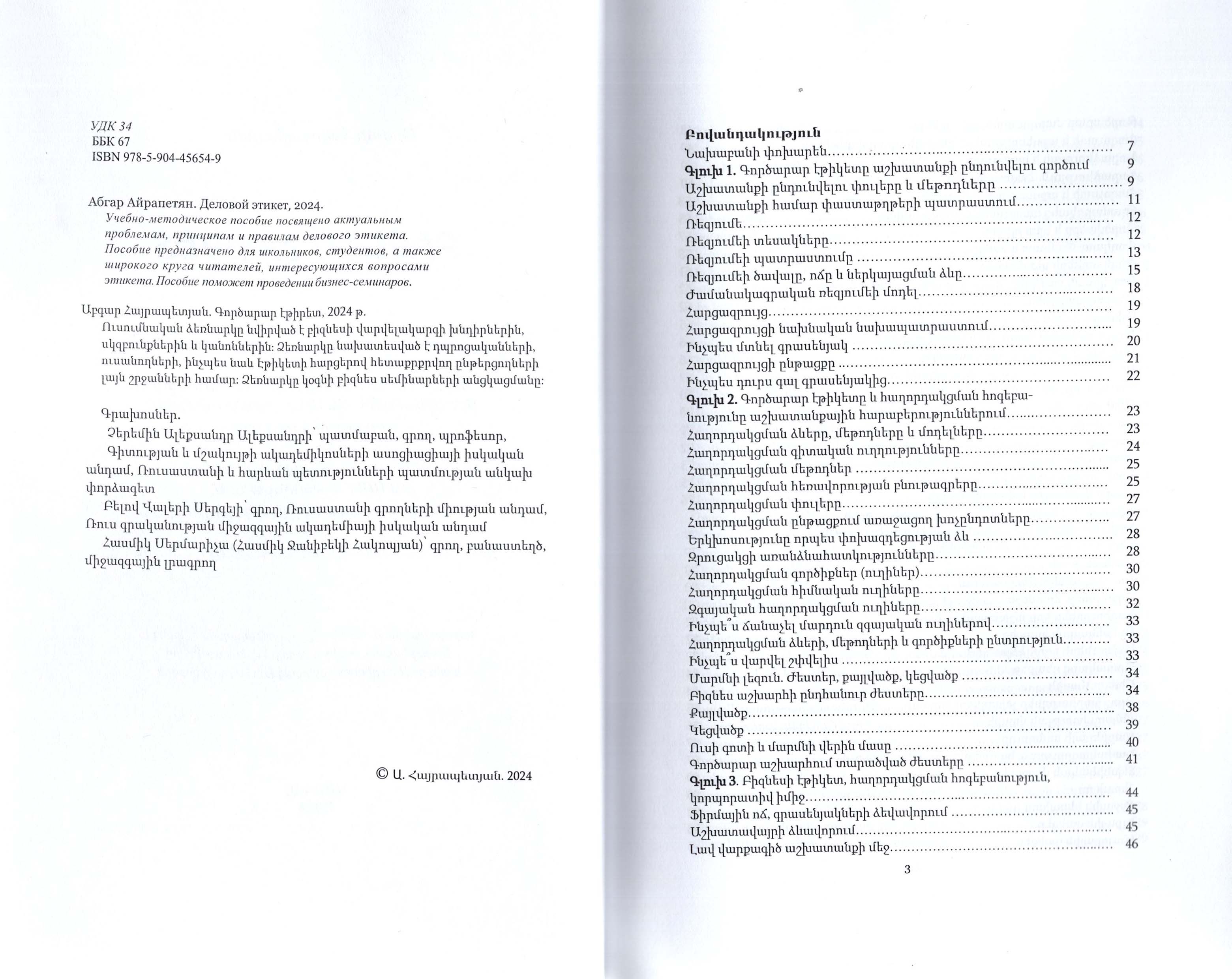 Ուսումնական ձեռնարկը նվիրված է բիզնեսի վարվելակարգի խնդիրներին, սկզբունքներին և կանոններին: Ձեռնարկը նախատեսված է դպրոցականների, ուսանողների, ինչպես նաև էթիկետի հարցերով հետաքրքրվող ընթերցողների լայն շրջանների համար: Ձեռնարկը կօգնի բիզնես սեմինարների անցկացմանը: