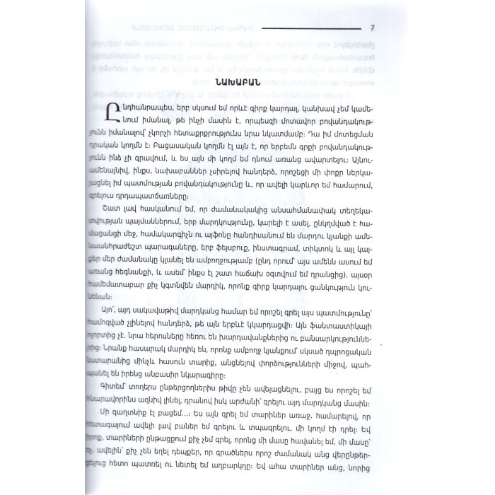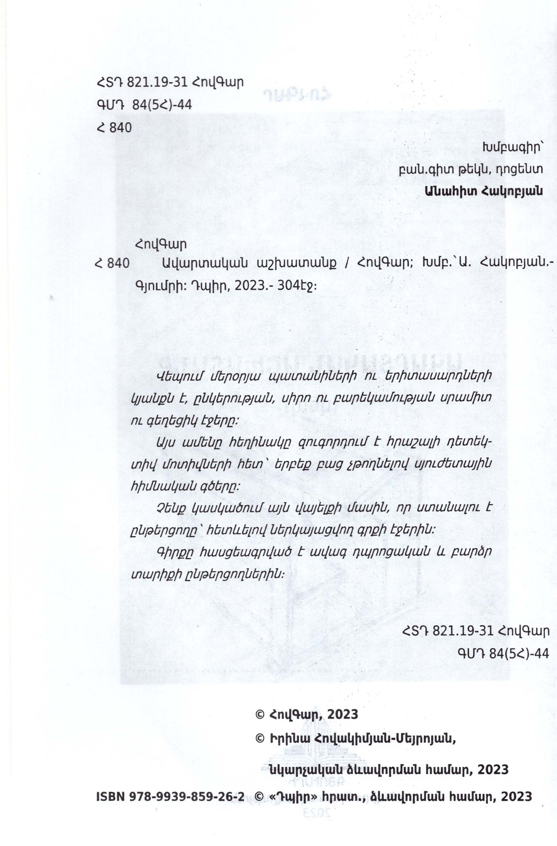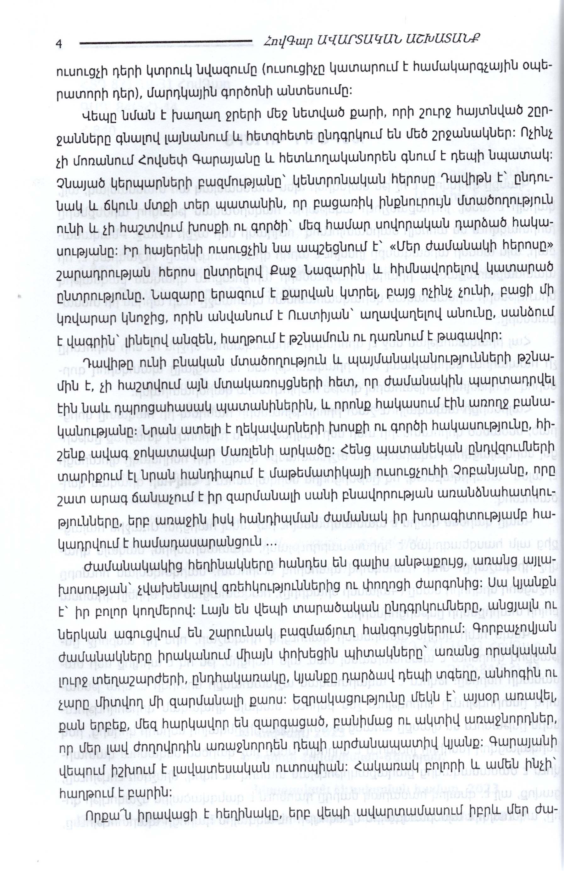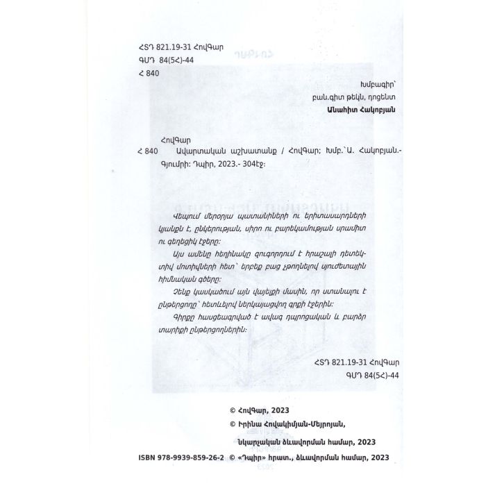 Վեպում մերօրյա պատանիների ու երիտասարդների կյանքն է, ընկերության, սիրո ու բարեկամության սրամիտ ու գեղեցիկ էջերը: Այս ամենը հեղինակը զուգորդում է հրաշալի դետեկտիվ մոտիվների հետ՝ երբեք բաց չթողնելով սյուժետային հիմնական գծերը: Չենք կասկածում այն վայելքի մասին, որ ստանալու է ընթերցողը՝ հետևելով ներկայացվող գրքի էջերին: Գիրքը հասցեագրված է ավագ դպրոցական և բարձր տարիքի ընթերցողներին: