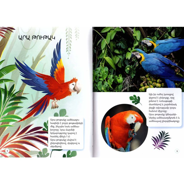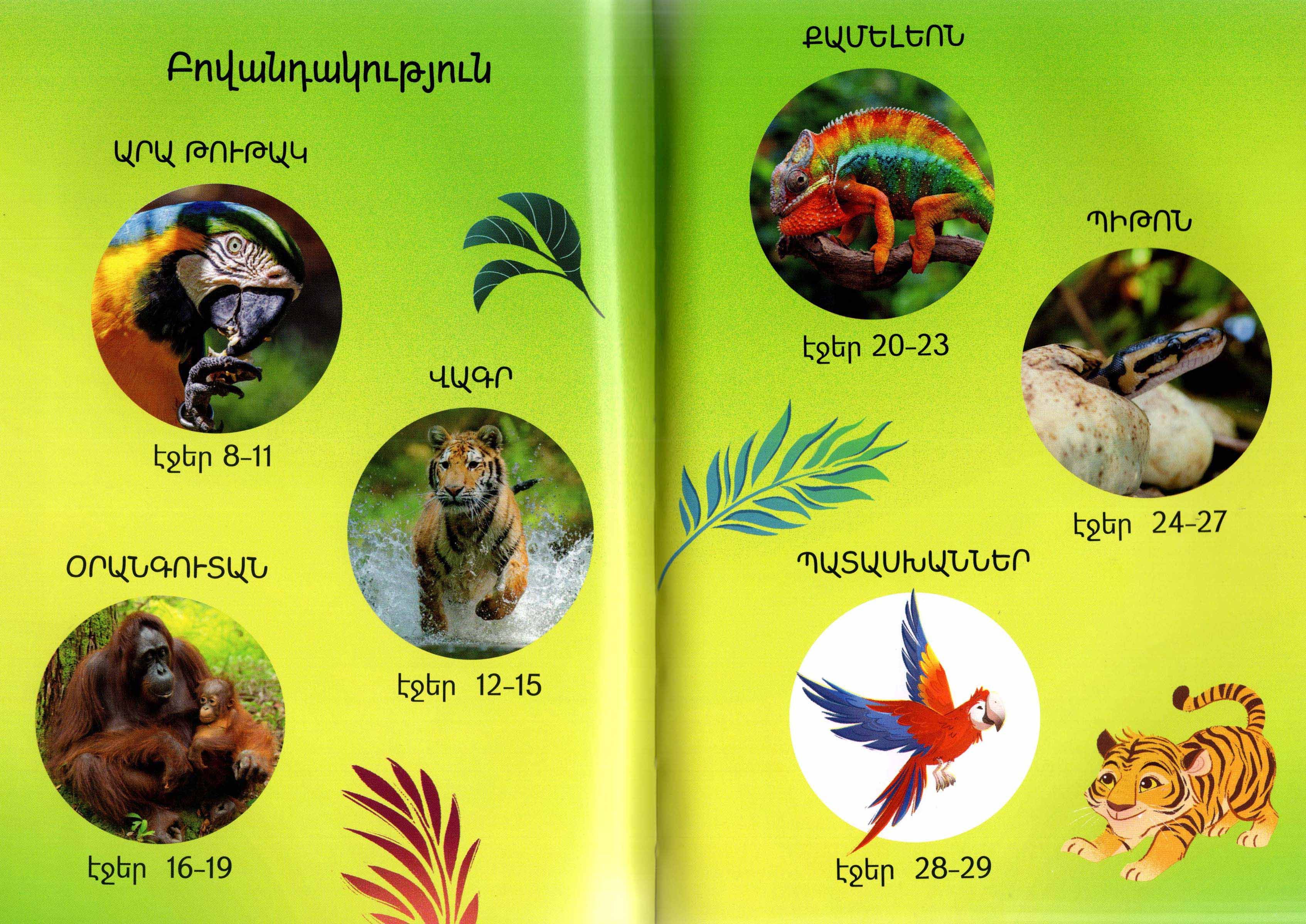 Գեղեցիկ նկարազարդումներով այս փոքրիկ հանրագիտարանում կհանդիպեք արևադարձային անտառի կենդանիների: Կստանաք հետաքրքիր տեղեկություններ վագրերի, օրանգուտանների, թութակների, պիթոնների ու քամելեոնների մասին, իսկ վերջում կգտնեք յուրաքանչյուր կենդանու համար նախատեսված հարցախաղի պատասխանը: