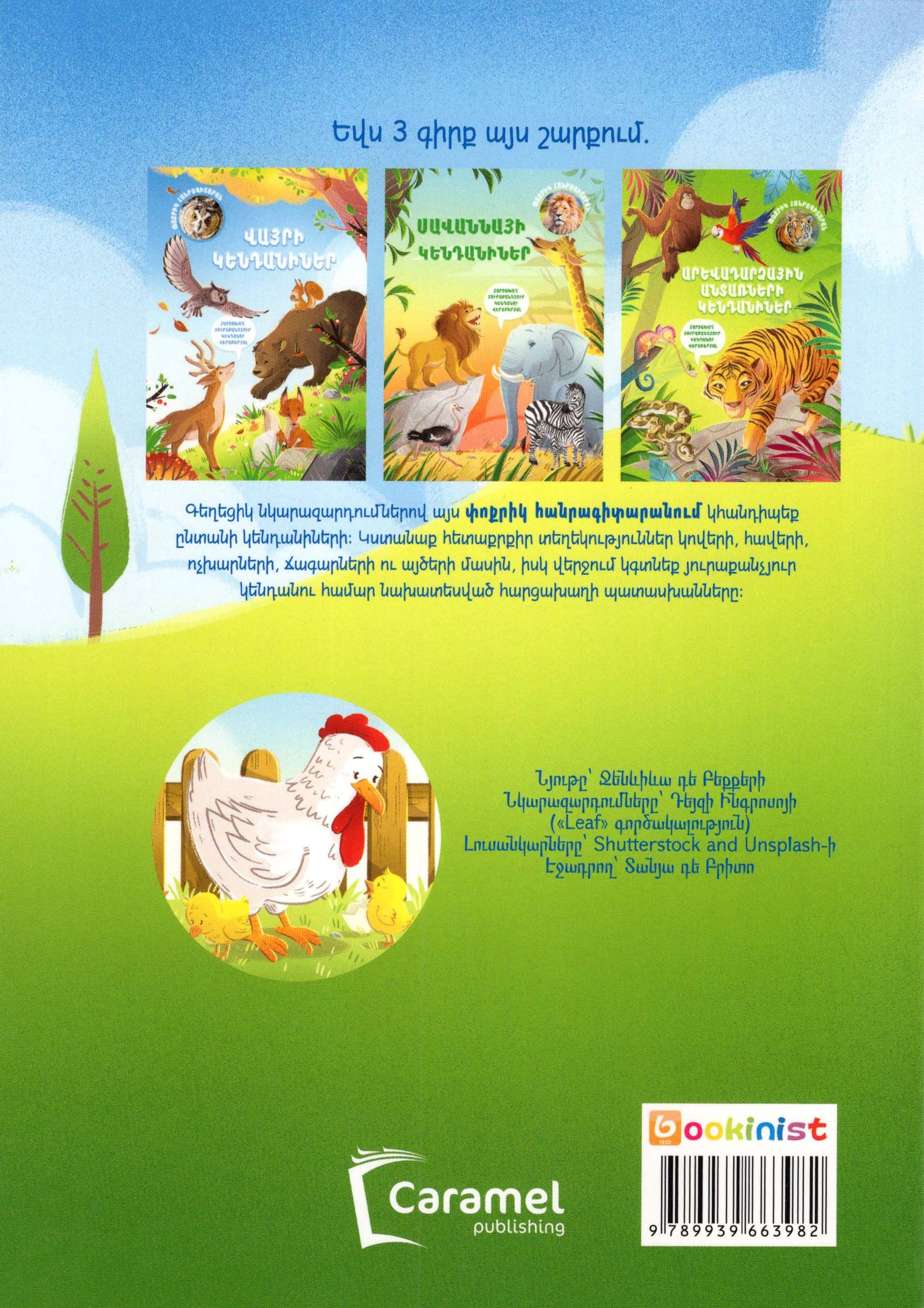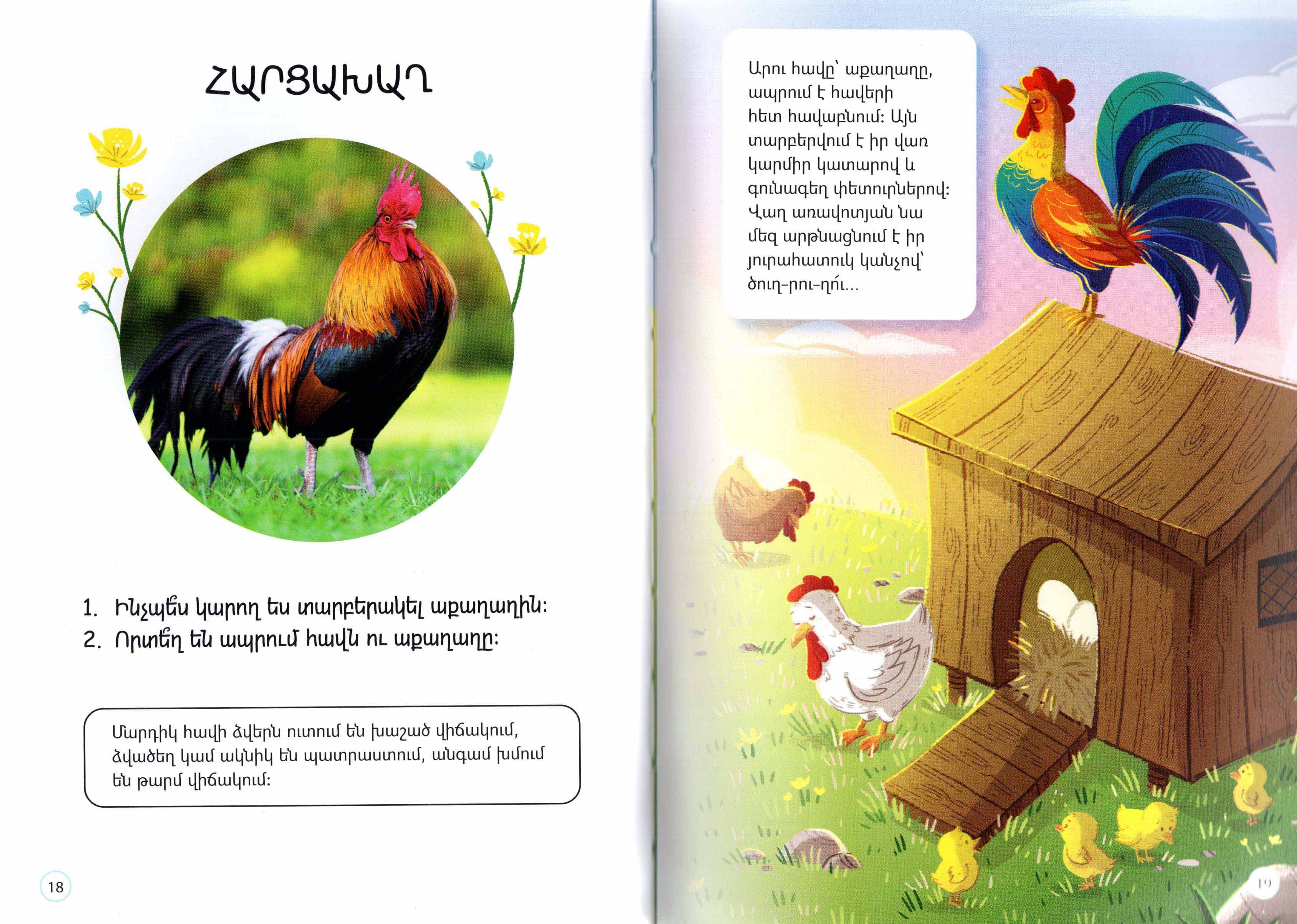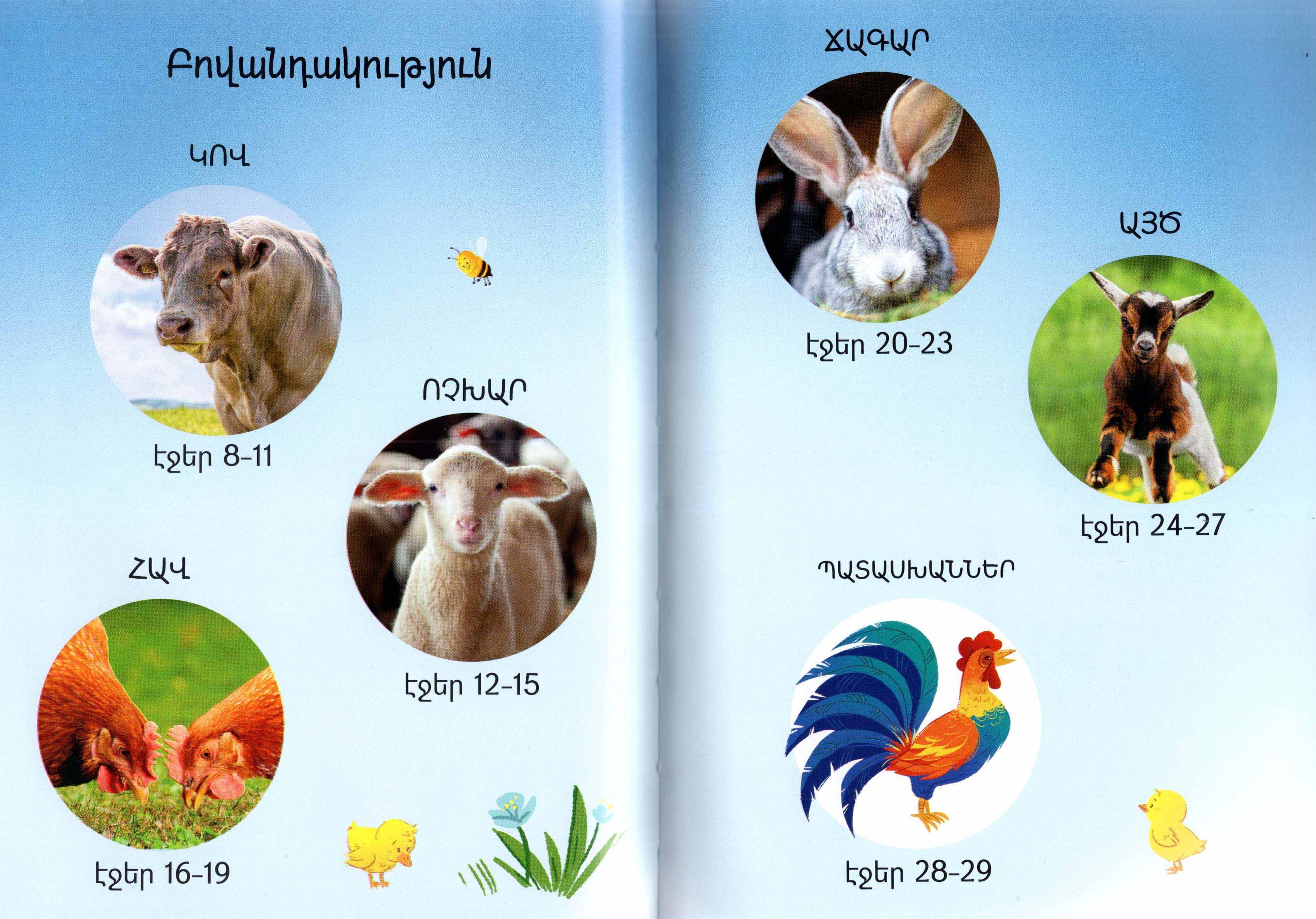 Գեղեցիկ նկարազարդումներով այս փոքրիկ հանրագիտարանում կհանդիպեք ընտանի կենդանիների: Կստանաք հետաքրքիր տեղեկություններ կովերի, հավերի, ոչխարների, ճագարների ու այծերի մասին, իսկ վերջում կգտնեք յուրաքանչյուր կենդանու համար նախատեսված հարցախաղի պատասխանը: