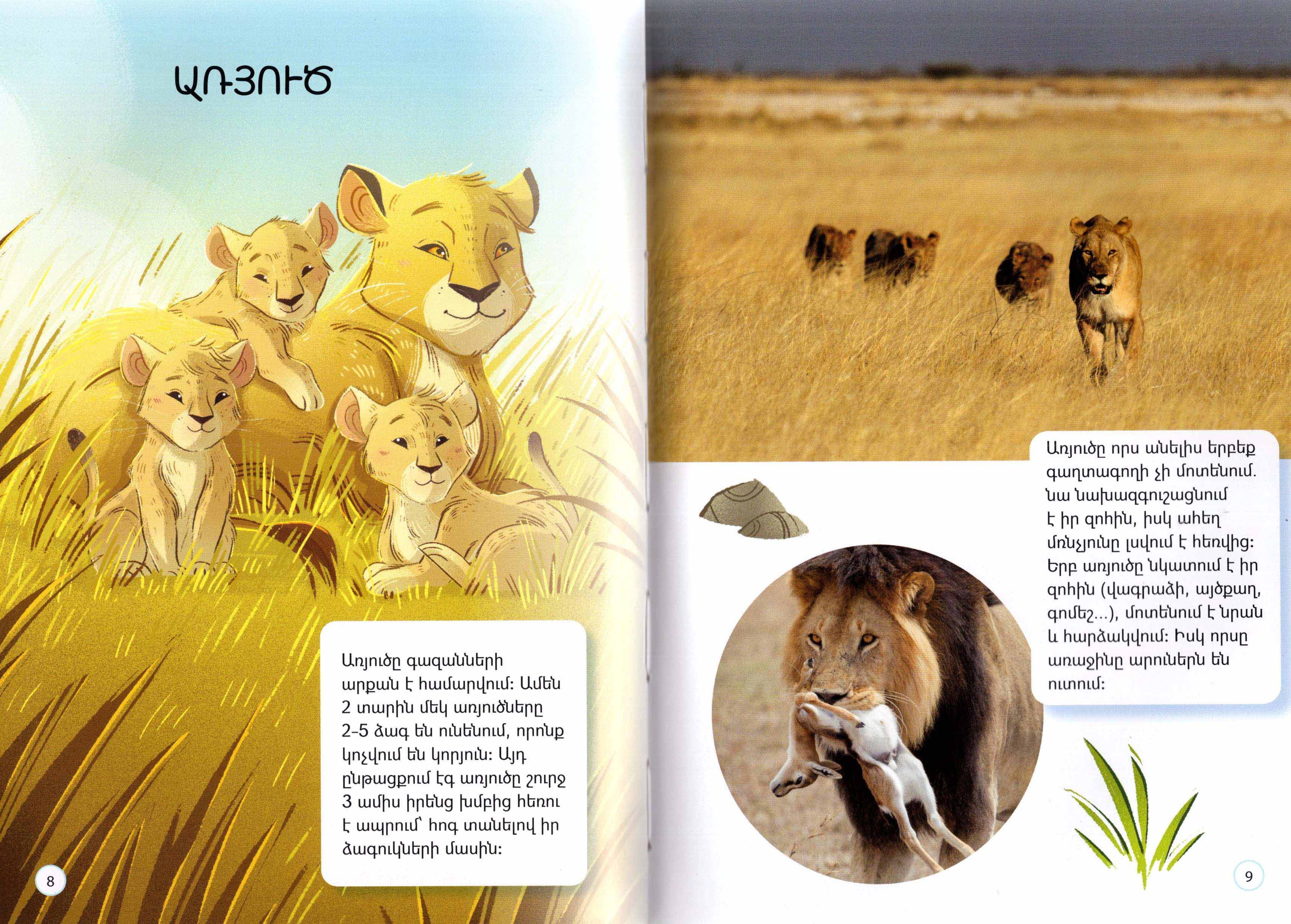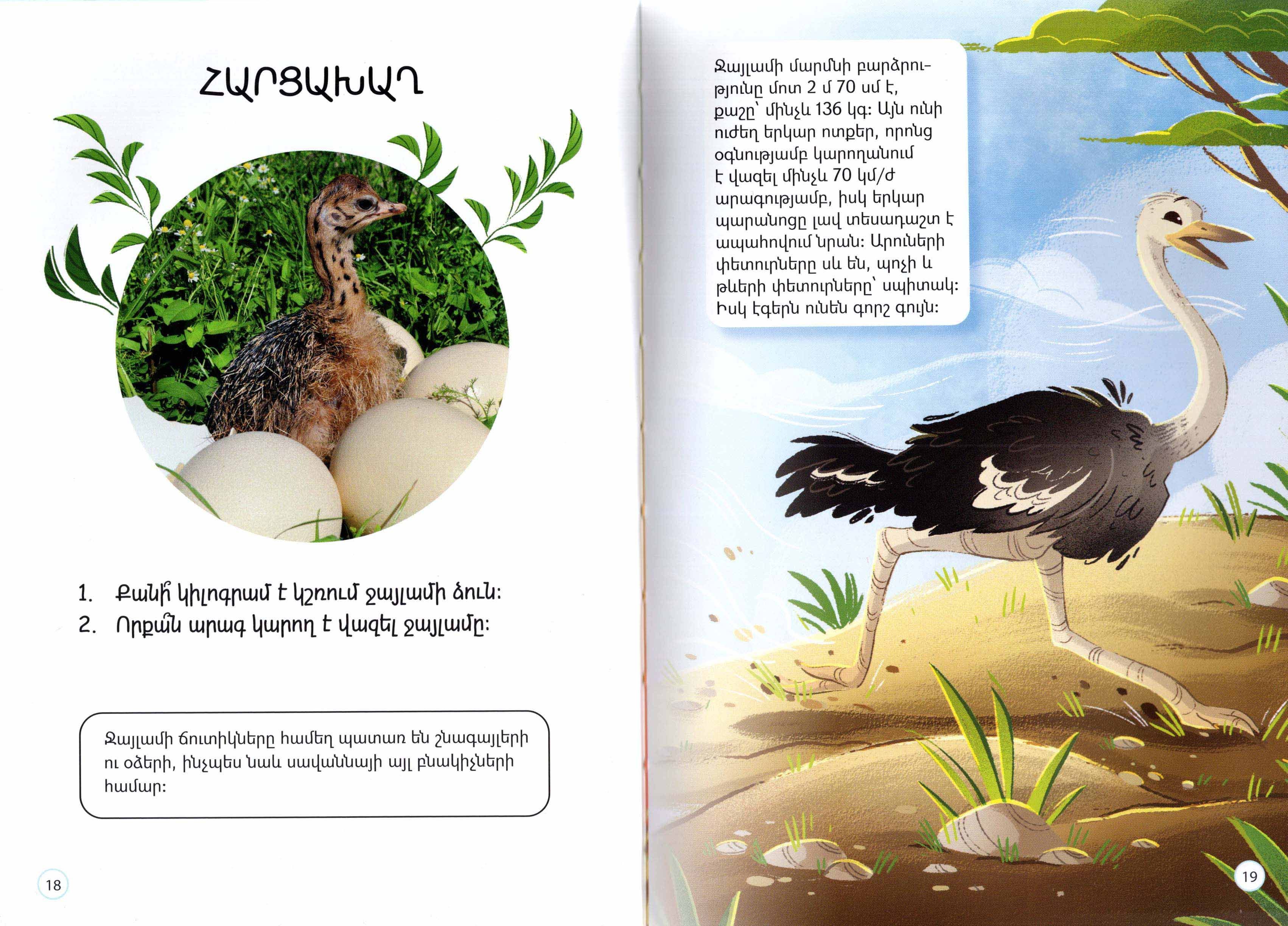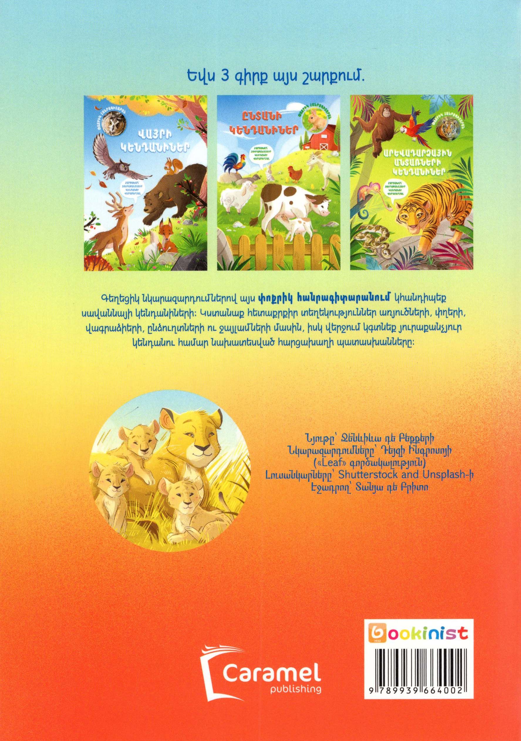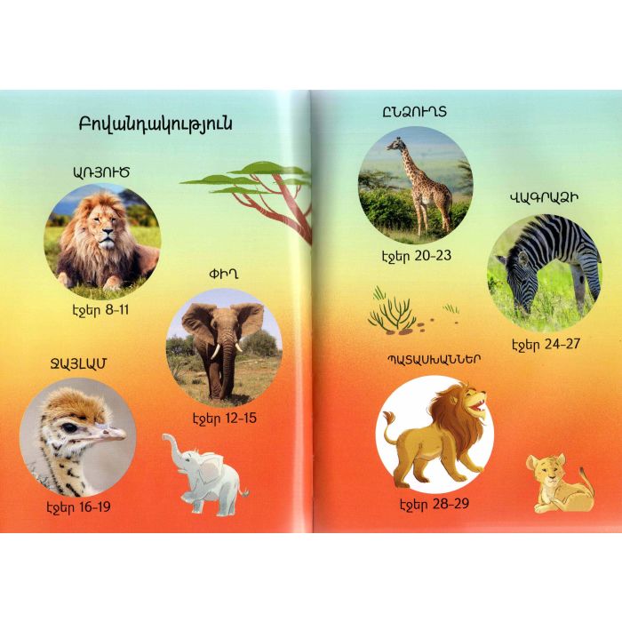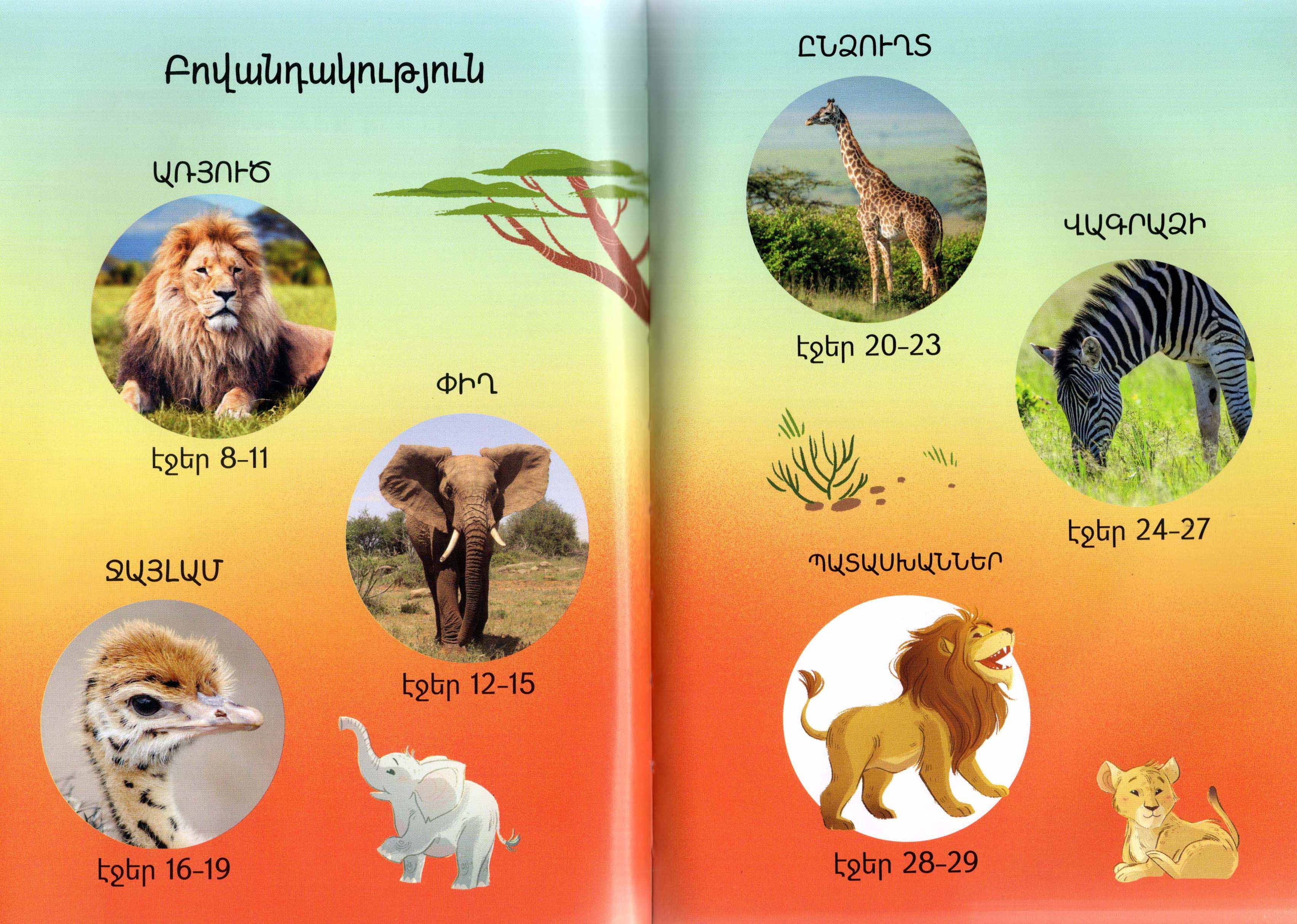 Գեղեցիկ նկարազարդումներով այս փոքրիկ հանրագիտարանում կհանդիպեք սավաննայի կենդանիների: Կստանաք հետաքրքիր տեղեկություններ առյուծների, փղերի, վագրաձիերի, ընձուղտների ու ջայլամների մասին, իսկ վերջում կգտնեք յուրաքանչյուր կենդանու համար նախատեսված հարցախաղի պատասխանը: