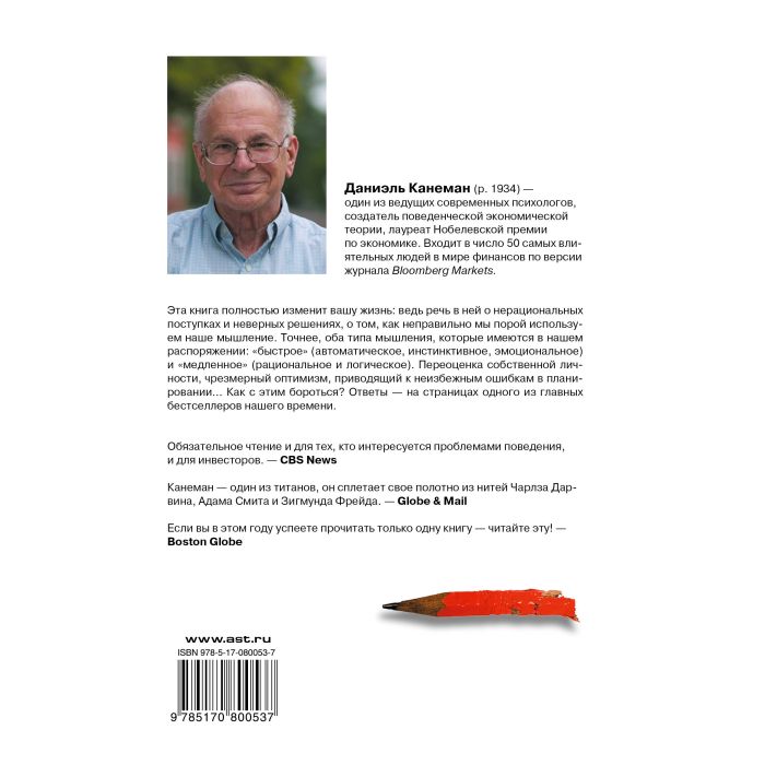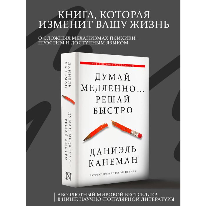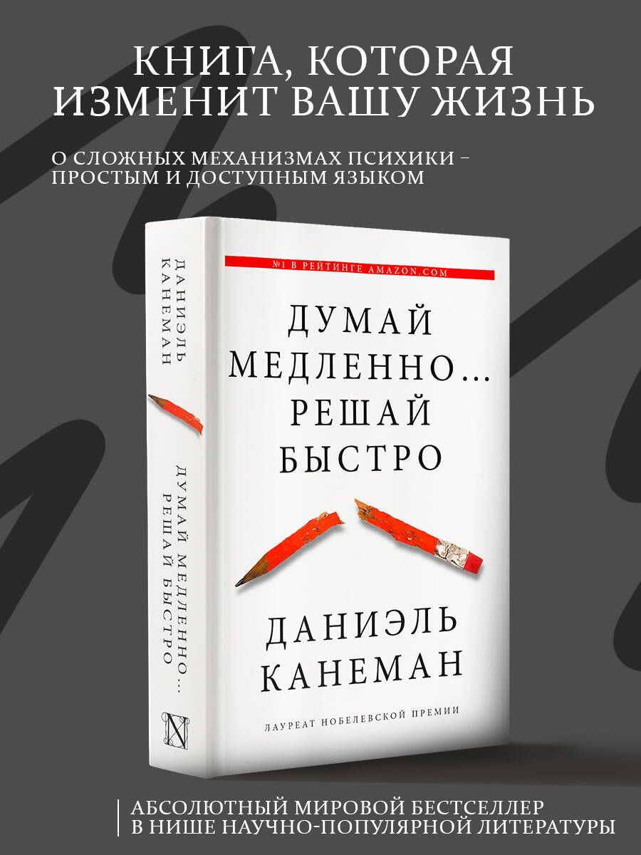 Наши действия и поступки определены нашими мыслями. Но всегда ли мы кон-тролируем наше мышление? Нобелевский лауреат Даниэль Канеман объясняет, почему мы подчас совершаем нерациональные поступки и как мы принимаем неверные решения. У нас имеется две системы мышления. "Медленное" мыш-ление включается, когда мы решаем задачу или выбираем товар в магазине. Обычно нам кажется, что мы уверенно контролируем эти процессы, но не будем забывать, что позади нашего сознания в фоновом режиме постоянно работает "быстрое" мышление — автоматическое, мгновенное и неосознаваемое…