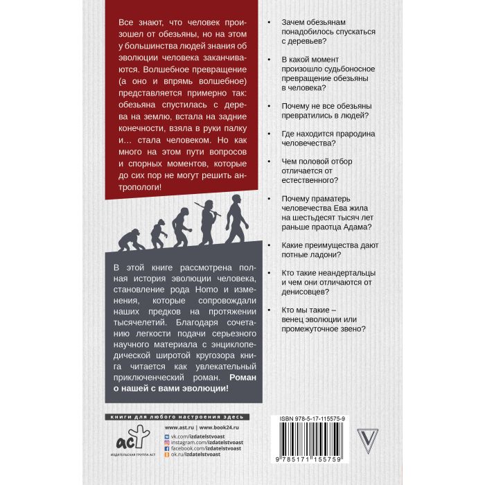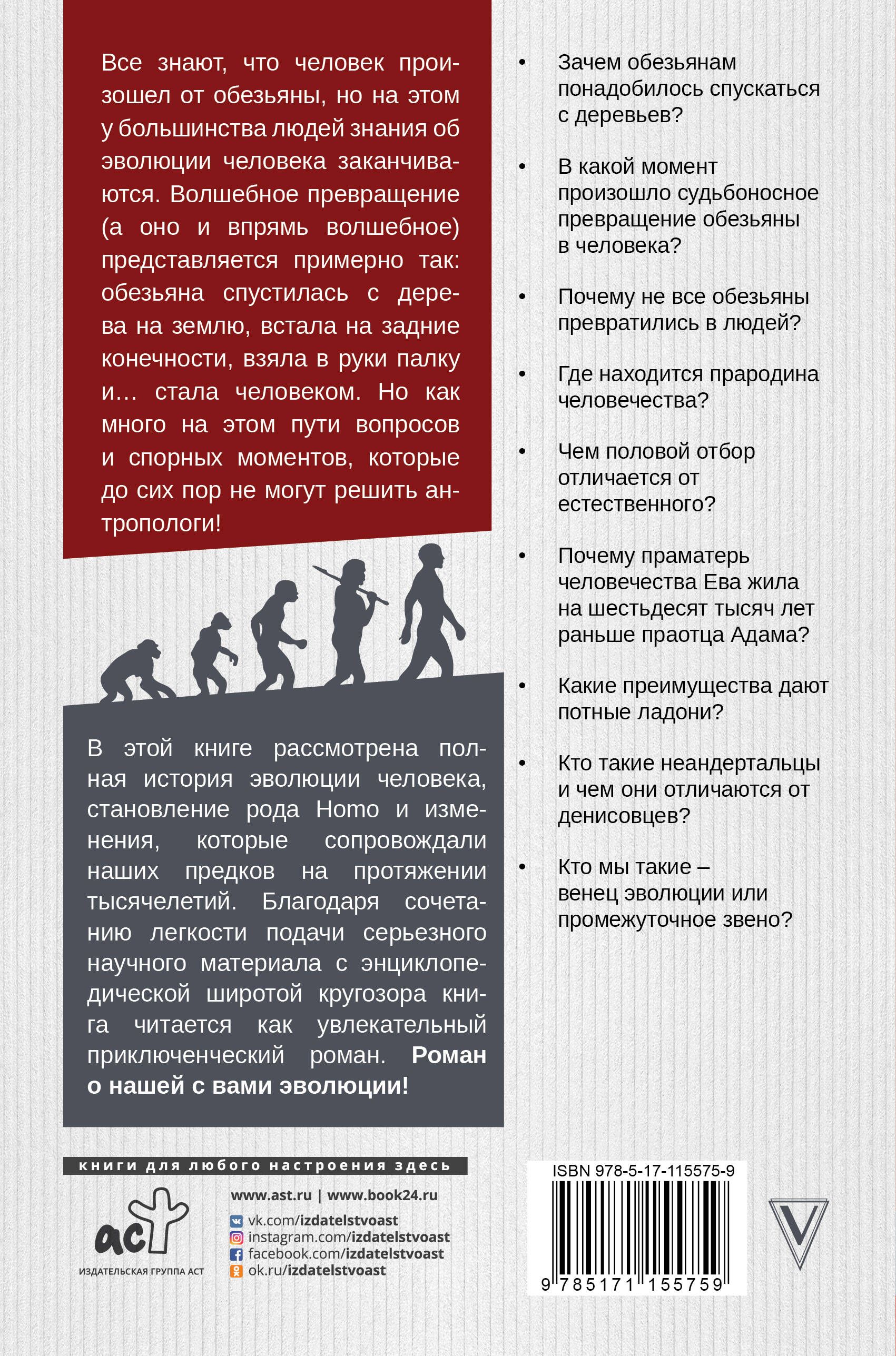 В этой книге рассмотрена полная история эволюции человека, становление рода Homo и изменения, которые сопровождали наших предков на протяжении тысячелетий. Благодаря сочетанию легкости подачи серьезного научного материала с энциклопедической широтой кругозора, книга читается как увлекательный приключенческий роман. Роман о нашей с вами эволюции!