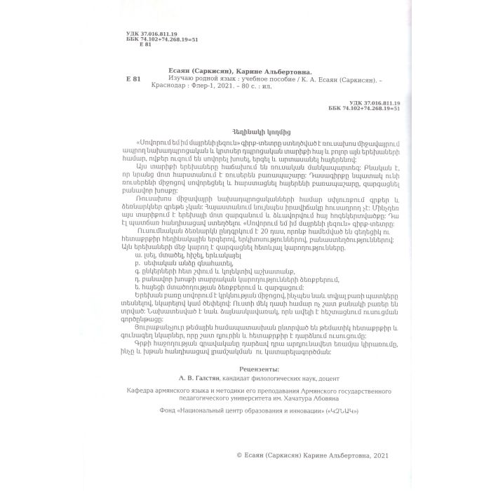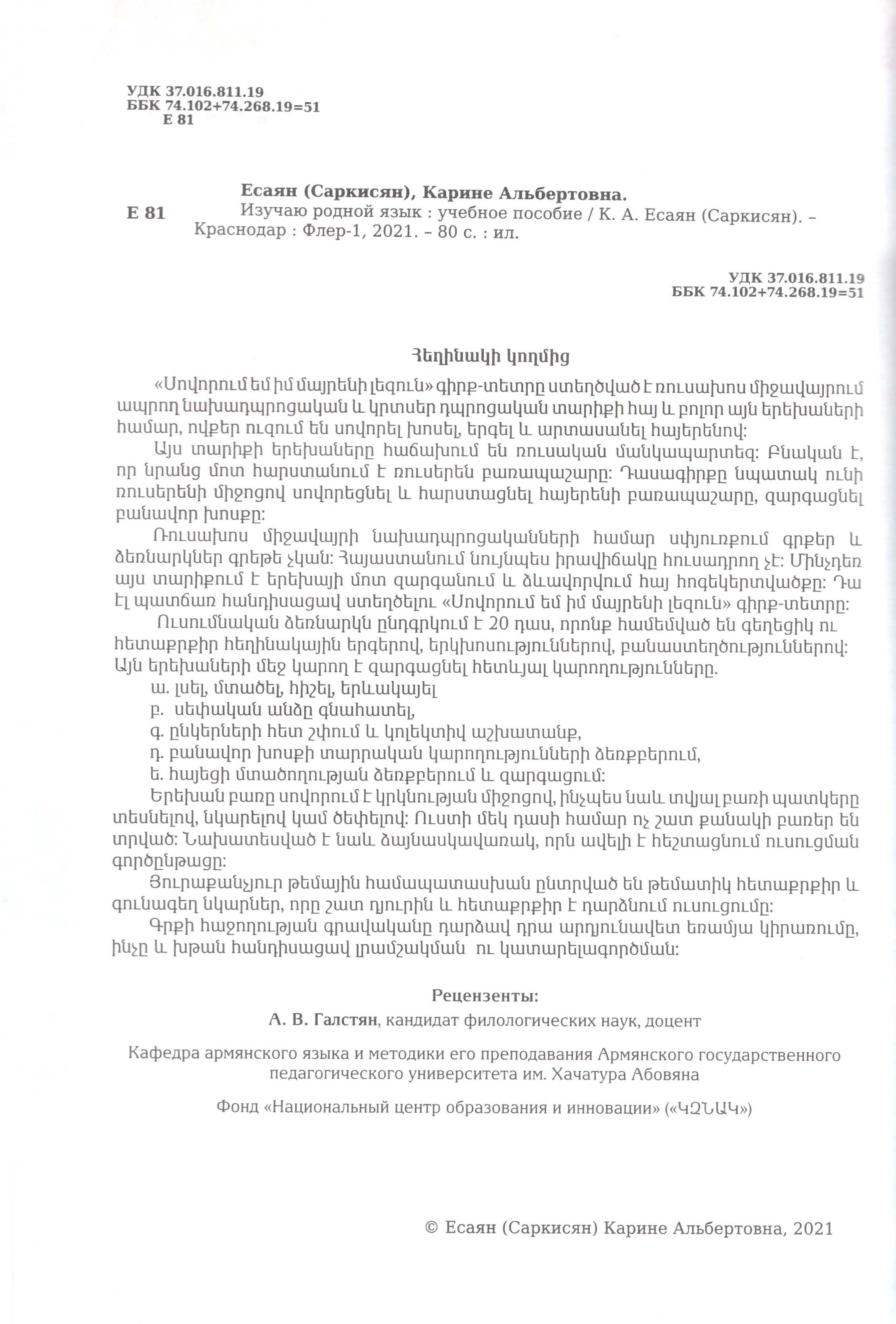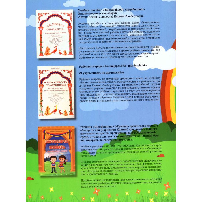 Գիրք-տետրը ստեղծված է ռուսախոս միջավայրում ապրող նախադպրոցական և կրտսեր դպրոցական տարիքի հայ և բոլոր այն երեխաների համար, ովքեր ուզում են սովորել խոսել, երգել և արտասանել հայերենով: