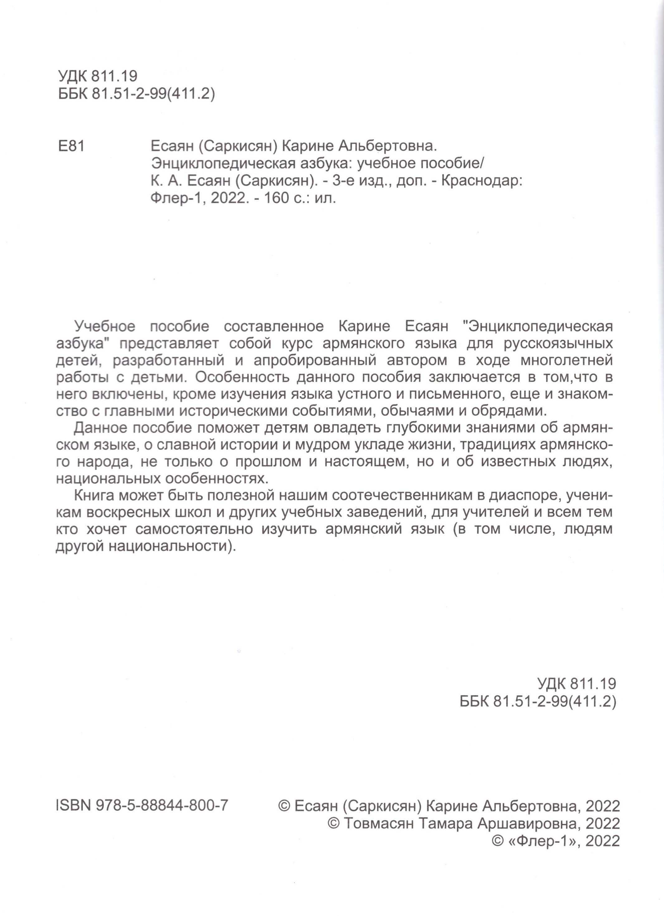 Учебное пособие составленное Карине Есаян ..Энциклопедическая азбука'' представляет собой курс армянского языка для русскоязычных детей, разработанный и апробированный автором в ходе многолетней работы с детьми. Особенность данного пособия заключается в том, что в него включены, кроме изучения языка устного и письменного, еще и знакомство с главными историческими событиями, обычаями и обрядами. Данное пособие поможет детям овладеть глубокими знаниями об армянском языке, о славной истории и мудром укладе жизни, традициях армянского народа, не только о прошлом и настоящем, но и об известных людях, национальных особенностях. Книга может быть полезной нашим соотечественникам в диаспоре, ученикам воскресных школ и других учебных заведений, для учителей и всем тем кто хочет самостояательно изучить армянский язык ( в том числе, людям другой национальности).
