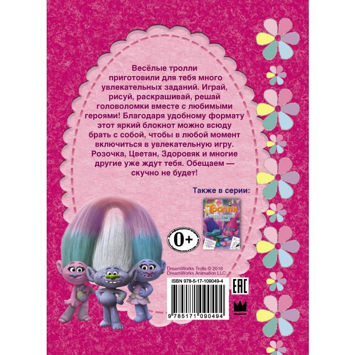 Весёлые тролли приготовили для тебя много увлекательных заданий. Играй, рисуй, раскрашивай, решай головоломки вместе с любимыми героями! Благодаря удобному формату этот блокнот можно всюду брать с собой, чтобы в любой момент включиться в увлекательную игру. Розочка, Цветан, Здоровяк и многие другие уже ждут тебя.