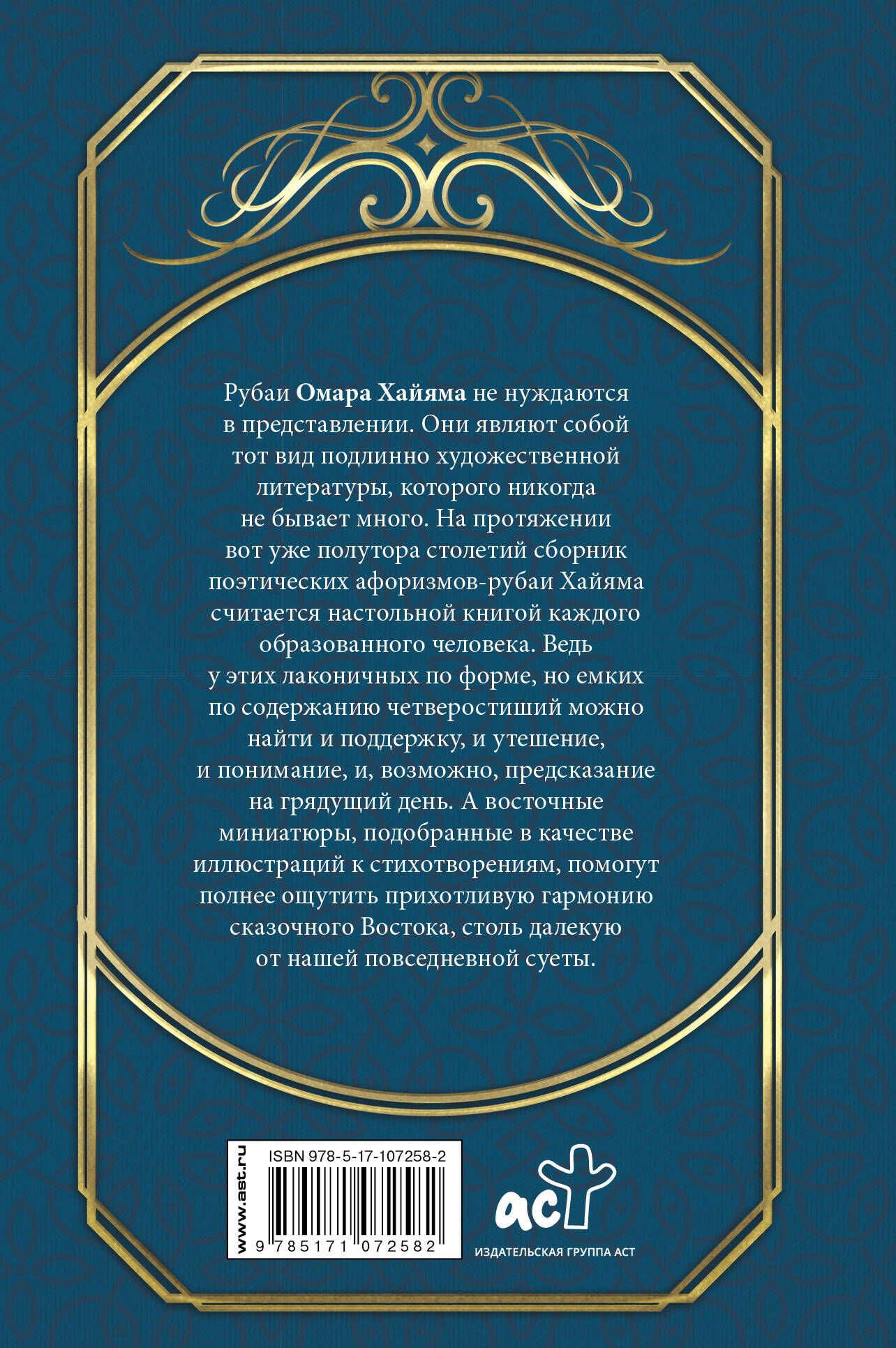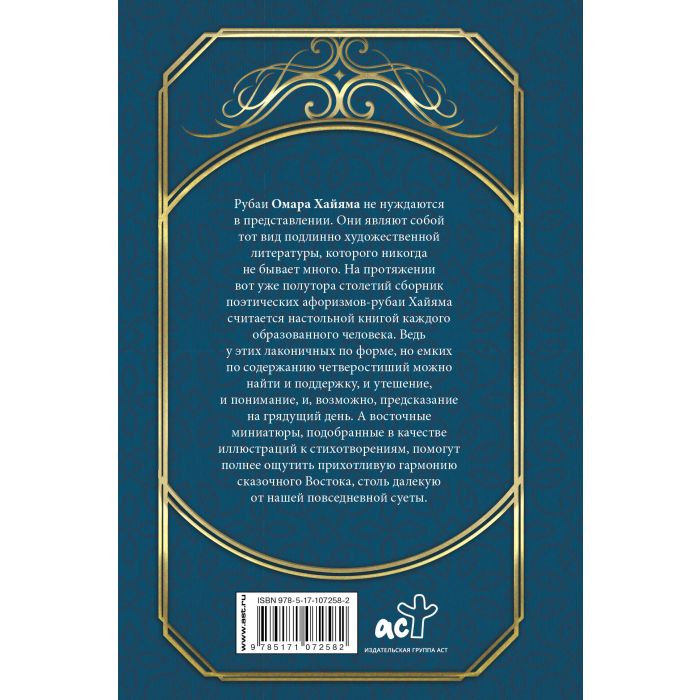 Эта книга украсит собой любую библиотеку. Ведь знаменитые четверостишия-рубаи Омара Хайяма давно стали классикой мировой литературы. Его емкие афористичные размышления о сути бытия, о ценности каждого проявления жизни покоряют изысканной лаконичностью форм и философской многогранностью содержания. Сопровождающие их в виде иллюстраций изящные восточные миниатюры радуют глаз своей прихотливостью и чарующей гармонией красок. Издание придется по вкусу самому широкому кругу ценителей прекрасной формы, глубокой мысли и мудрого слова.