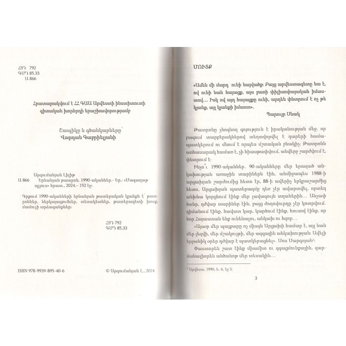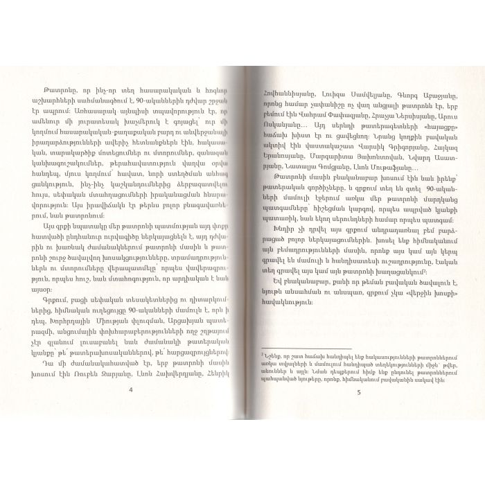 Գրքում 1990-ականների երևանյան թատերական կյանքն է՝ թատրոններ, ներկայացումներ, տեսակետներ, թատերագետի խոսք, մամուլի արձագանքներ: