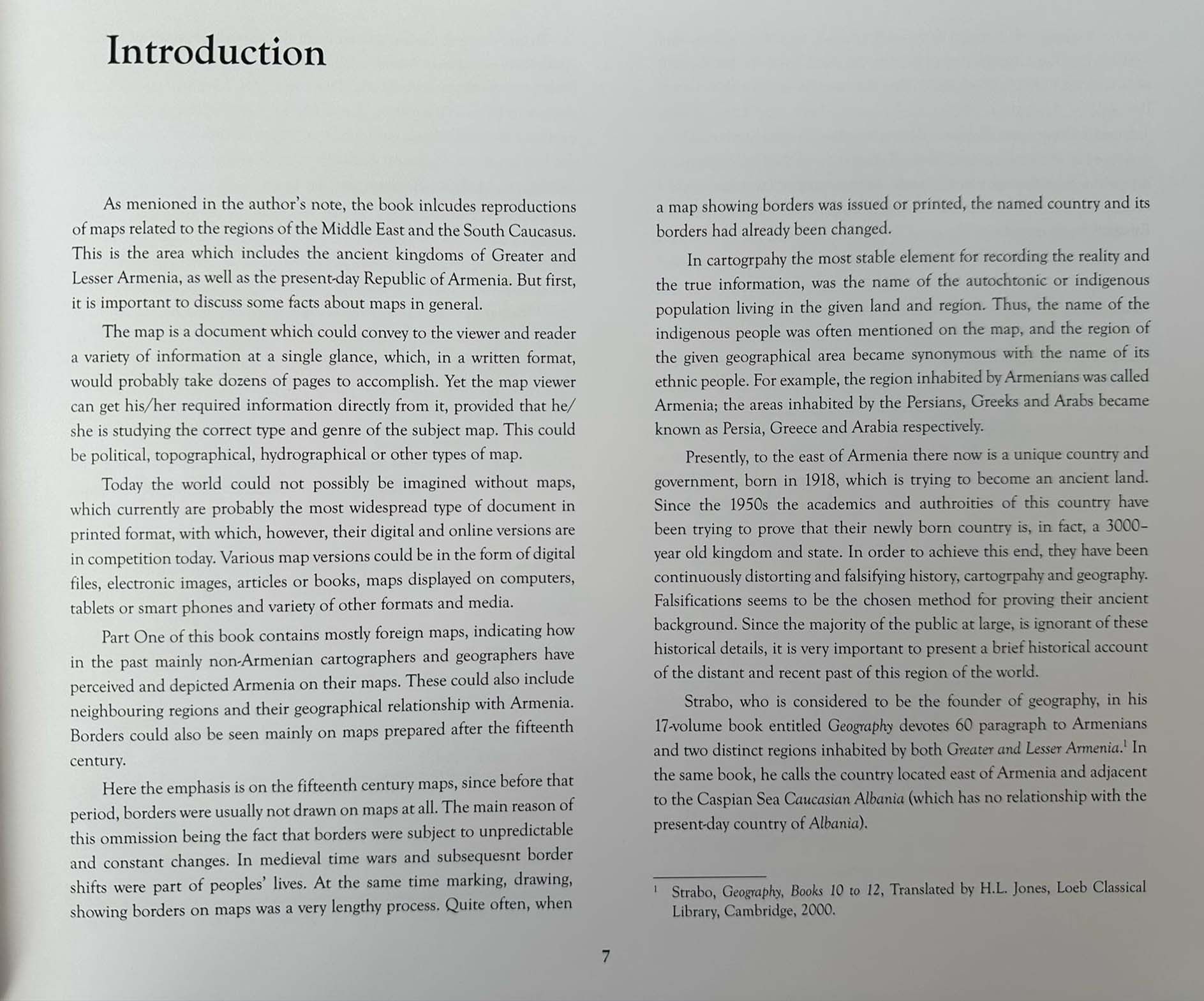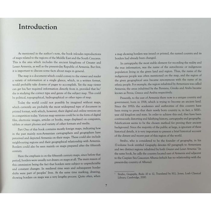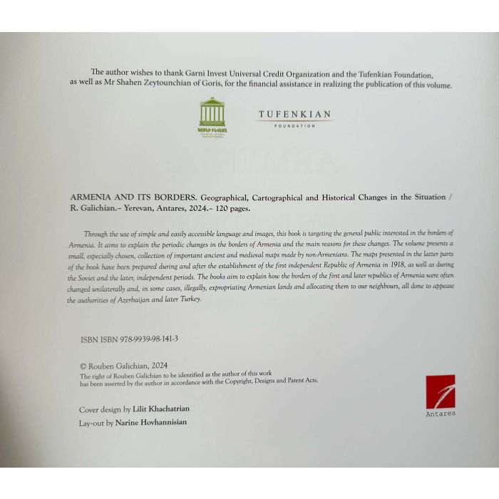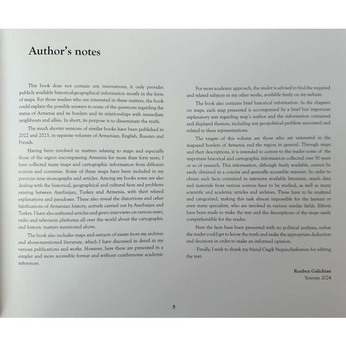 Through the use of simple and easily accessible language and images, this book is targeting the general public interested in the borders of Armenia. It aims to explain the periodic changes in the borders of Armenia and the main reasons for thease changes. The volume presents a small, especially chosen, collection of important ancient and medieval maps made by non-Armenians. The maps presented in the latter parts of the book have been prepared during and after the establishment of the first independent Republic of Armenia in 1918, as well as during the Soviet and the later, independent periods. The books aim to explain how the borders of the first and later republics of Armenia were often changed unilaterally and, in some cases, illegaly, expropriating Armenian lands and allocating them to pur neighbours, all done to appease the authorities of Azerbaijan and later Turkey.