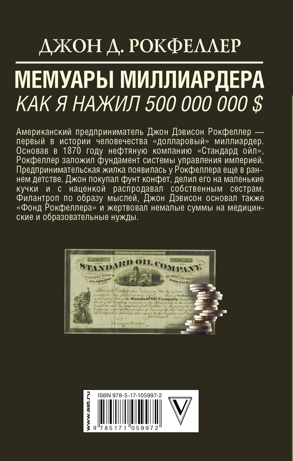 Американский предприниматель Джон Дэвисон Рокфеллер — первый в истории человечества "долларовый" миллиардер. Основав в 1870 году нефтяную компанию "Стандард ойл", Рокфеллер заложил фундамент системы управления империей. Предпринимательская жилка появилась у Рокфеллера еще в раннем детстве. Джон покупал фунт конфет, делил его на маленькие кучки и с наценкой распродавал собственным сестрам. Филантроп по образу мыслей, Джон Дэвисон основал также "Фонд Рокфеллера" и жертвовал немалые суммы на медицинские и образовательные нужды. "Как я нажил 500 000 000 долларов" — это руководство по достижению целей от человека, для которого занятие бизнесом было вопросом воспитания, порядка и силы характера.