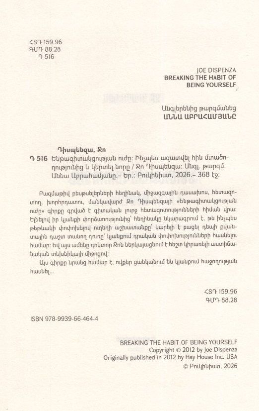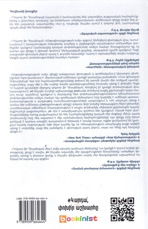 Բազմաթիվ բեսթսելերների հեղինակ, միջազգային դասախոս, հետազոտող, խորհրդատու, մանկավարժ Ջո Դիսպենզայի «Ենթագիտակցության ուժը» գիրքը գրված է գիտական լուրջ հետազոտությունների հիման վրա: Ելնելով իր կյանքի փորձառությունից՝ հեղինակը նկարագրում է, թե ինչպես թեթևակի փոփոխելով ուղեղի աշխատանքը՝ կարելի է բացել դեպի քվանտային դաշտ տանող դուռը՝ կյանքում դրական փոփոխությունների հասնելու համար: Եվ այս ամենը դոկտոր Ջոն ներկայացնում է հեշտ կիրառելի աստիճանական տեխնիկայի միջոցով։