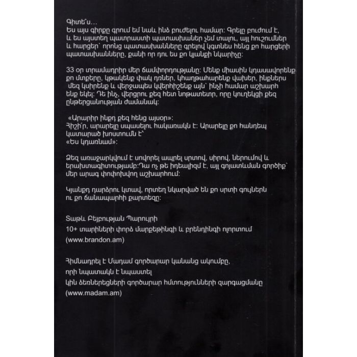 33 գլուխ, որոնք միայն պատրաստի պատասխաններ չեն, այլ հուշումներ և հարցեր է, որոնք օգնում են կողմնորոշվել, կյանքի քարտեզն կառուցելու և ճիշտ կողմնորոշվելու հարցում։