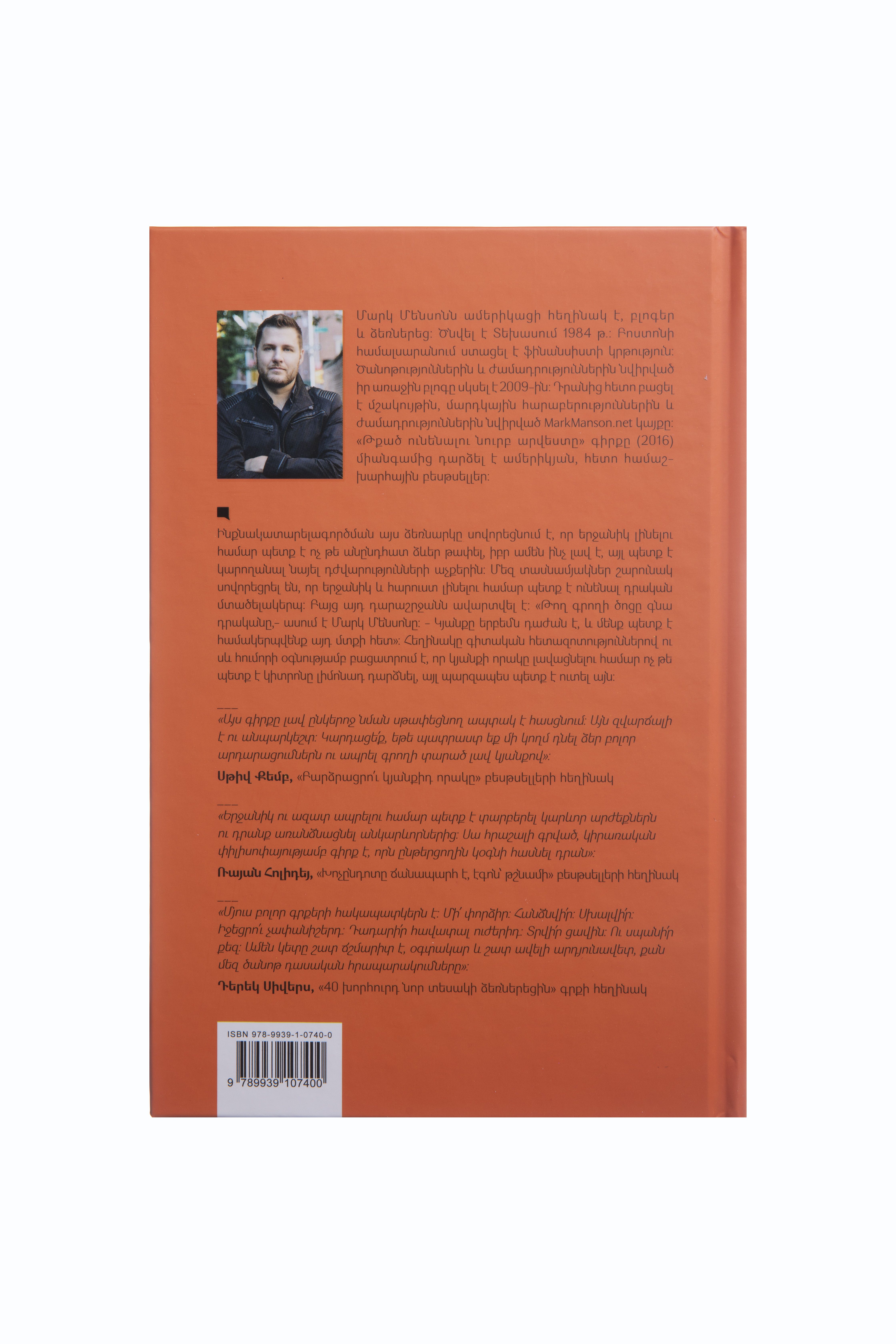 Ինքնակատարելագործման այս ձեռնարկում հայտնի բլոգերը սովորեցնում է, որ երջանիկ լինելու համար պետք է ոչ թե անընդհատ ձևեր թափել, իբր ամեն ինչ լավ է, այլ պետք է կարողանալ նայել դժվարությունների աչքերին։ Մեզ տասնամյակներ շարունակ սովորեցրել են, որ երջանիկ և հարուստ լինելու համար պետք է ունենալ դրական մտածելակերպ։ Բայց այդ դարաշրջանն ավարտվել է։ «Թող գրողի ծոցը գնա դրականը,- ասում է Մարկ Մենսոնը: Կյանքը երբեմն դաժան է, և մենք պետք է համակերպվենք այդ մտքի հետ»։ Հեղինակը գիտական հետազոտություններով ու սև հումորի օգնությամբ բացատրում է, որ կյանքի որակը լավացնելու համար ոչ թե պետք է կիտրոնը լիմոնադ դարձնել, այլ պարզապես պետք է ուտել այն։ Մենսոնը եզակի մտերմության ազդեցիկ միջավայր է ստեղծում` անձնական պատմություններ պատմելով և երբեմն անպատշաճ հումորով։