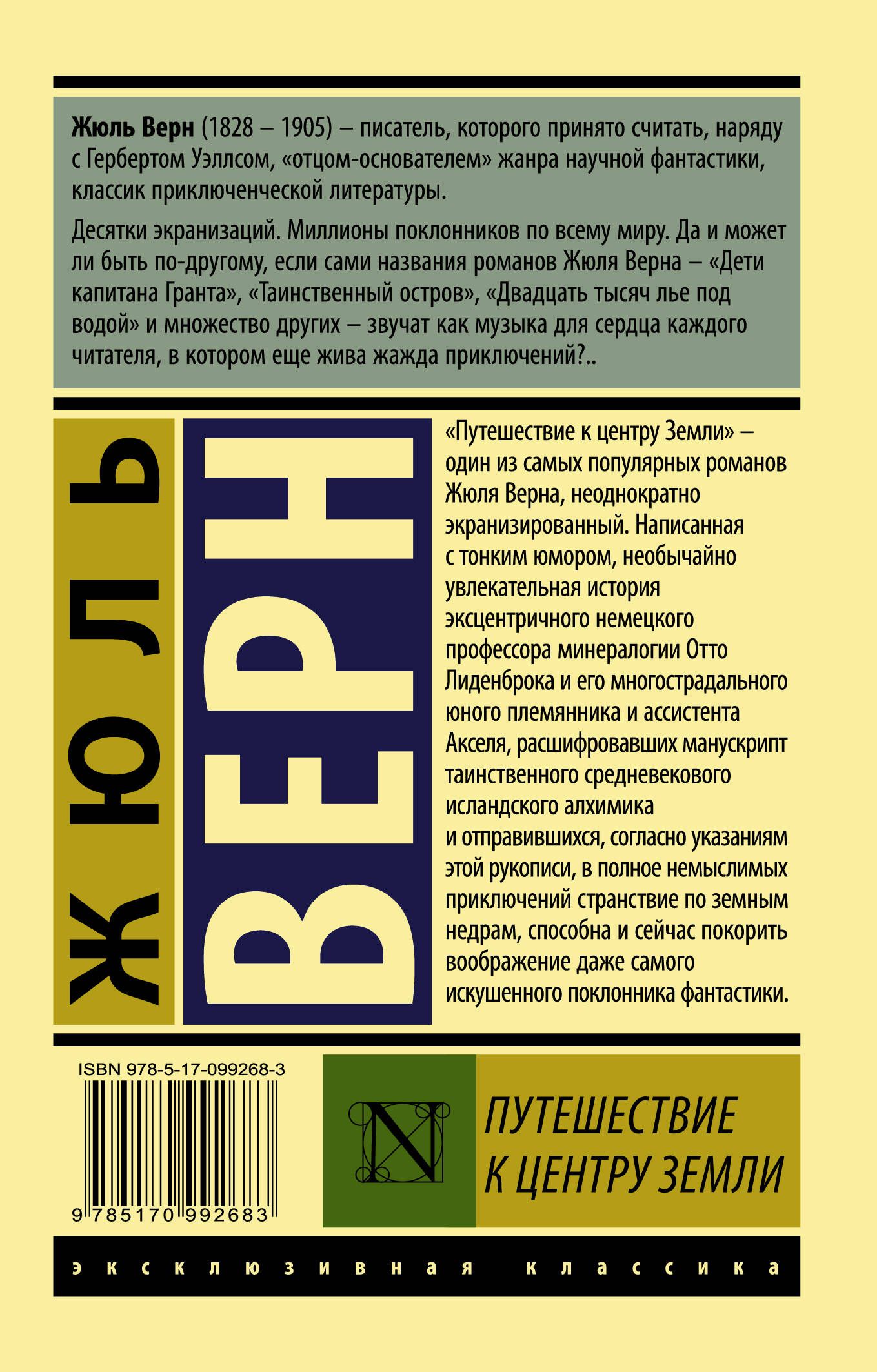 "Путешествие к центру Земли" – один из самых популярных романов Жюля Верна, неоднократно экранизированный. Написанная с тонким юмором, необычайно увлекательная история эксцентричного немецкого профессора минералогии Отто Лиденброка и его многострадального юного племянника и ассистента Акселя, расшифровавших манускрипт таинственного средневекового исландского алхимика и отправившихся, согласно указаниям этой рукописи, в полное немыслимых приключений странствие по земным недрам, способна и сейчас покорить воображение даже самого искушенного поклонника фантастики.